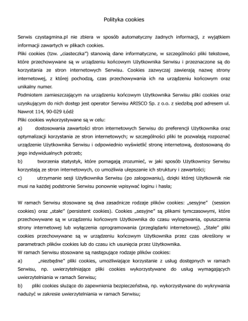 Polityka cookies Serwis czystagmina.pl nie zbiera w sposób automatyczny żadnych informacji, z wyjątkiem informacji zawartych w plikach cookies. Pliki cookies (tzw. „ciasteczka”) stanowią dane informatyczne, w szczególności pliki tekstowe, które przechowywane są w urządzeniu końcowym Użytkownika Serwisu i przeznaczone są do korzystania ze stron internetowych Serwisu. Cookies zazwyczaj zawierają nazwę strony internetowej, z której pochodzą, czas przechowywania ich na urządzeniu końcowym oraz unikalny numer. Podmiotem zamieszczającym na urządzeniu końcowym Użytkownika Serwisu pliki cookies oraz uzyskującym do nich dostęp jest operator Serwisu ARISCO Sp. z o.o. z siedzibą pod adresem ul. Nawrot 114, 90-029 Łódź Pliki cookies wykorzystywane są w celu: a) dostosowania zawartości stron internetowych Serwisu do preferencji Użytkownika oraz optymalizacji korzystania ze stron internetowych; w szczególności pliki te pozwalają rozpoznać urządzenie Użytkownika Serwisu i odpowiednio wyświetlić stronę internetową, dostosowaną do jego indywidualnych potrzeb; b) tworzenia statystyk, które pomagają zrozumieć, w jaki sposób Użytkownicy Serwisu korzystają ze stron internetowych, co umożliwia ulepszanie ich struktury i zawartości; c) utrzymanie sesji Użytkownika Serwisu (po zalogowaniu), dzięki której Użytkownik nie musi na każdej podstronie Serwisu ponownie wpisywać loginu i hasła; W ramach Serwisu stosowane są dwa zasadnicze rodzaje plików cookies: „sesyjne” (session cookies) oraz „stałe” (persistent cookies). Cookies „sesyjne” są plikami tymczasowymi, które przechowywane są w urządzeniu końcowym Użytkownika do czasu wylogowania, opuszczenia strony internetowej lub wyłączenia oprogramowania (przeglądarki internetowej). „Stałe” pliki cookies przechowywane są w urządzeniu końcowym Użytkownika przez czas określony w parametrach plików cookies lub do czasu ich usunięcia przez Użytkownika. W ramach Serwisu stosowane są następujące rodzaje plików cookies: a) „niezbędne” pliki cookies, umożliwiające korzystanie z usług dostępnych w ramach Serwisu, np. uwierzytelniające pliki cookies wykorzystywane do usług wymagających uwierzytelniania w ramach Serwisu; b) pliki cookies służące do zapewnienia bezpieczeństwa, np. wykorzystywane do wykrywania nadużyć w zakresie uwierzytelniania w ramach Serwisu; c) „wydajnościowe” pliki cookies, umożliwiające zbieranie informacji o sposobie korzystania ze stron internetowych Serwisu; d) „funkcjonalne” pliki cookies, umożliwiające „zapamiętanie” wybranych przez Użytkownika ustawień i personalizację interfejsu Użytkownika, np. w zakresie wybranego języka lub regionu, z którego pochodzi Użytkownik, rozmiaru czcionki, wyglądu strony internetowej itp.; e) „reklamowe” pliki cookies, umożliwiające dostarczanie Użytkownikom treści reklamowych bardziej dostosowanych do ich zainteresowań. W wielu przypadkach oprogramowanie służące do przeglądania stron internetowych (przeglądarka internetowa) domyślnie dopuszcza przechowywanie plików cookies w urządzeniu końcowym Użytkownika. Użytkownicy Serwisu mogą dokonać w każdym czasie zmiany ustawień dotyczących plików cookies. Ustawienia te mogą zostać zmienione w szczególności w taki sposób, aby blokować automatyczną obsługę plików cookies w ustawieniach przeglądarki internetowej bądź informować o ich każdorazowym zamieszczeniu w urządzeniu Użytkownika Serwisu. Szczegółowe informacje o możliwości i sposobach obsługi plików cookies dostępne są w ustawieniach oprogramowania (przeglądarki internetowej). Operator Serwisu informuje, że ograniczenia stosowania plików cookies mogą wpłynąć na niektóre funkcjonalności dostępne na stronach internetowych Serwisu. Pliki cookies zamieszczane w urządzeniu końcowym Użytkownika Serwisu i wykorzystywane mogą być również przez współpracujących z operatorem Serwisu reklamodawców oraz partnerów. Więcej informacji na temat plików cookies dostępnych jest pod adresem http://wszystkoociasteczkach.pl/ lub w sekcji „Pomoc” w menu przeglądarki internetowej.
