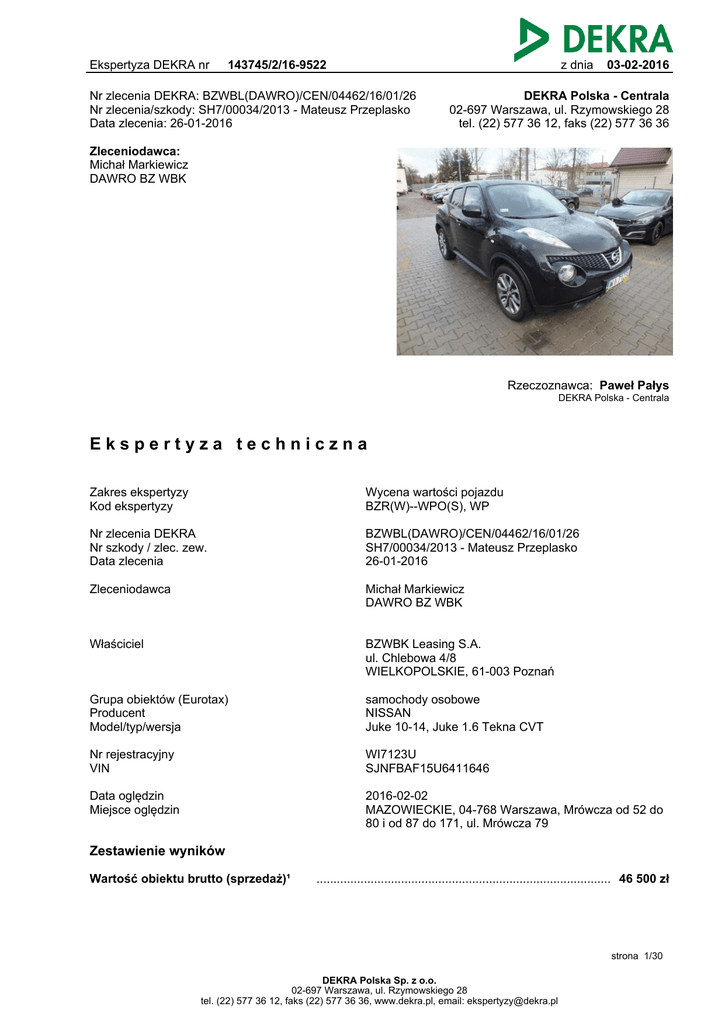Ekspertyza DEKRA nr 143745/2/16-9522 z dnia Nr zlecenia DEKRA: BZWBL(DAWRO)/CEN/04462/16/01/26 Nr zlecenia/szkody: SH7/00034/2013 - Mateusz Przeplasko Data zlecenia: 26-01-2016 03-02-2016 DEKRA Polska - Centrala 02-697 Warszawa, ul. Rzymowskiego 28 tel. (22) 577 36 12, faks (22) 577 36 36 Zleceniodawca: Michał Markiewicz DAWRO BZ WBK Rzeczoznawca: Paweł Pałys DEKRA Polska - Centrala Ekspertyza techniczna Zakres ekspertyzy Kod ekspertyzy Wycena wartości pojazdu BZR(W)--WPO(S), WP Nr zlecenia DEKRA Nr szkody / zlec. zew. Data zlecenia BZWBL(DAWRO)/CEN/04462/16/01/26 SH7/00034/2013 - Mateusz Przeplasko 26-01-2016 Zleceniodawca Michał Markiewicz DAWRO BZ WBK Właściciel BZWBK Leasing S.A. ul. Chlebowa 4/8 WIELKOPOLSKIE, 61-003 Poznań Grupa obiektów (Eurotax) Producent Model/typ/wersja samochody osobowe NISSAN Juke 10-14, Juke 1.6 Tekna CVT Nr rejestracyjny VIN WI7123U SJNFBAF15U6411646 Data oględzin Miejsce oględzin 2016-02-02 MAZOWIECKIE, 04-768 Warszawa, Mrówcza od 52 do 80 i od 87 do 171, ul. Mrówcza 79 Zestawienie wyników Wartość obiektu brutto (sprzedaż)¹ ....................................................................................... 46 500 zł strona 1/30 DEKRA Polska Sp. z o.o. 02-697 Warszawa, ul. Rzymowskiego 28 tel. (22) 577 36 12, faks (22) 577 36 36, www.dekra.pl, email: [email protected] Ekspertyza DEKRA nr 143745/2/16-9522 z dnia 03-02-2016 Dane pojazdu Grupa obiektów (Eurotax) Kod EC (Eurotax) samochody osobowe 0085819 Producent Model Typ/wersja NISSAN Juke 10-14 Juke 1.6 Tekna CVT Rodzaj nadwozia Liczba drzwi/liczba miejsc hatchback 5/5 Masa własna [kg] Dopuszczalna masa całkowita [kg] Rozstaw osi 1/2 1215 1675 2530 Rodzaj silnika Układ oczyszczana spalin Norma czystości spalin Pojemność silnika [ccm] Moc silnika [KM/kW] Skrzynia biegów z zapłonem iskrowym katalizator trójdrożny EURO 5 1598 117/86 automatyczna 1-biegowa Nr rejestracyjny VIN WI7123U SJNFBAF15U6411646 Data 1. rejestracji Data nast. bad. techn. Rok produkcji 13-09-2013 12-09-2016 2013 (rok produkcji został zweryfikowany z zewnętrzną bazą danych) Stan licznika [km] 26 755 (odczytany) Kolor nadwozia/rodzaj powłoki czarny/wielowarstwowa metalizowana Ogumienie Oś Koło Producent, typ Rozmiar przednia prawe Continental, ContiPremiumContact 2 Continental, ContiPremiumContact 2 Continental, ContiPremiumContact 2 Continental, ContiPremiumContact 2 215/55 R17 94V XL Profil zmierzony 6,5 mm 215/55 R17 94V XL 6,5 mm 215/55 R17 94V XL 7,5 mm 215/55 R17 94V XL 7,5 mm lewe tylna prawe lewe strona 2/30 DEKRA Polska Sp. z o.o. 02-697 Warszawa, ul. Rzymowskiego 28 tel. (22) 577 36 12, faks (22) 577 36 36, www.dekra.pl, email: [email protected] Ekspertyza DEKRA nr 143745/2/16-9522 z dnia 03-02-2016 Wyposażenie standardowe wg Eurotax 1. 4/5 zagłówki 2. ABS 3. Airbag 6 sztuk (czołowe poduszki kierowcy i pasażera, boczne poduszki - przód, kurtyny powietrzne) 4. Automatyczne włączanie świateł 5. BA - system wspomagania nagłego hamowania 6. Czujnik deszczu 7. EBD - elektroniczny rozdział sił hamowania 8. ESP - układ stabilizacji toru jazdy 9. El. podnoszenie szyb, przód i tył 10. Felgi aluminiowe 17 Shiro z ogumieniem 215/55 11. Fotel kierowcy z manualną regulacją wysokości 12. Gniazdo USB 13. Immobilizer 14. Inteligentny kluczyk - uruchamianie pojazdu bez użycia kluczyka 15. Interfejs Bluetooth 16. 17. 18. 19. 20. 21. 22. 23. Kierownica i drążek biegów skórzane Kierownica ze sterowaniem radia Kieszeń w oparciu fotela pasażera Klamki w kolorze nadwozia Klimatyzacja automatyczna Kolumna kierownicy regulowana manualnie Komputer pokładowy Koło zapasowe - dojazdowe 24. Lusterka boczne elektrycznie składane 25. Lusterka boczne regulowane elektrycznie 26. Lusterka boczne w kolorze nadwozia 27. Nissan Dynamic Control System - system zmiany charakterystyki jazdy (sportowy, eco, normalny) 28. Osłona przeciwsłoneczna z lusterkiem po stronie kierowcy 29. Osłona przeciwsłoneczna z lusterkiem po stronie pasażera 30. Pasy bezpieczeństwa z napinaczami i ogranicznikami siły napięcia, przód 31. Regulacja kąta pochylenia reflektorów 32. Sygnalizacja niezapiętych pasów bezpieczeństwa 33. System Nissan Connect - system nawigacji satelitarnej + kamera ułatwiająca parkowanie 34. Szyby barwione 35. Tapicerka Premium 36. Tempomat 37. Termometr zewnętrzny 38. Tylne drzwi z blokadą zabezpieczającą przed otwarciem przez dzieci 39. Tylne oparcie składane, dzielone 40. Uchwyty ISOFIX do inst. fotelika, tył 41. Uchwyty na kubki z przodu 42. Wspomaganie układu kierowniczego 43. Wycieraczka szyby tylnej 44. Wyłącznik deaktywujący poduszkę powietrzną 45. Zamek centralny z pilotem 46. Światła przeciwmgielne Wyposażenie dealerskie 1. Lakier metalik ................................................................................................................................. 600 zł Wyposażenie dodatkowe 1. Hak holowniczy składany ............................................................................................................... 600 zł Wartość bazowa pojazdu Wartość bazowa pojazdu wg Eurotax (brutto/sprzedaż)¹ .......................................................... 50 000 zł Korekty Pierwsza rejestracja Korekta 1. rejestracji .......................................................................................................................... 956 zł Wartość pojazdu po korekcie 1. rejestracji .................................................................................... 50 956 zł strona 3/30 DEKRA Polska Sp. z o.o. 02-697 Warszawa, ul. Rzymowskiego 28 tel. (22) 577 36 12, faks (22) 577 36 36, www.dekra.pl, email: [email protected] Ekspertyza DEKRA nr 143745/2/16-9522 z dnia 03-02-2016 Wyposażenie Korekta wyposażenia ...................................................................................................................... 1 200 zł Wartość pojazdu po korekcie wyposażenia ............................................