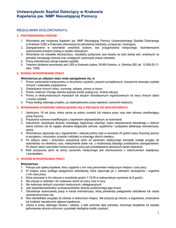 Uniwersytecki Szpital Dzieciący w Krakowie Kapelania pw. NMP Nieustającej Pomocy REGULAMIN WOLONTARIATU 1. POSTANOWIENIA OGÓLNE 1. Wolontariat jest inicjatywą Kapelanii pw. NMP Nieustającej Pomocy Uniwersyteckiego Szpitala Dziecięcego w Krakowie (USD w Krakowie) skierowaną do pełnoletniej młodzieży uczącej się i studiującej. 2. Zaangażowanie w wolontariat umożliwia osobom, bez przygotowania medycznego, bezinteresowne wykonywanie prostych posług w szpitalu dziecięcym. 3. Wolontariat ma charakter ekumeniczny, niezależny politycznie, jest otwarty na ludzi dobrej woli, wrażliwych na potrzeby cierpiącego dziecka oraz umiejących uszanować prawa człowieka. 4. Pracą wolontariuszy kieruje kapelan szpitala. 5. Terenem działania wolontariatu jest USD w Krakowie (adres: 30-663 Kraków, ul. Wielicka 265, tel. 12 658-20-11, wew. 1028). 2. RODZAJ WYKONYWANEJ PRACY Wolontariusz po odbytym stażu może zaangażować się, w: 1. Pomoc personelowi medycznemu w utrzymaniu czystości, pracach porządkowych, transporcie wewnątrz szpitala chorych i materiałów zaopatrzenia. 2. Odwiedzanie chorych dzieci, rozmowę, zabawę, pomoc w nauce. 3. Pomoc rodzicom chorego dziecka poprzez proste posługi (np. drobne zakupy). 4. Pomoc w okolicznościowych imprezach lub akcjach charytatywnych organizowanych na rzecz chorych dzieci i rozwoju szpitala. 5. Pracę według własnego projektu, po zaakceptowaniu przez kapelana i personel medyczny. 1. WYMAGANIA STAWIANE UBIEGAJĄCEMU SIĘ O PRZYJĘCIE DO WOLONTARIATU 1. Ukończony 18 rok życia, dobra opinia ze szkoły (uczelni) lub miejsca pracy oraz stan zdrowia umożliwiający pracę fizyczną. 2. Pozytywna rozmowa kwalifikacyjna z kapelanem odpowiedzialnym za wolontariat. 3. Dokumenty: kserokopia dowodu osobistego (legitymacji szkolnej), kopia zaświadczenia lekarskiego o dobrym stanie zdrowia lub do wglądu aktualna książeczka zdrowia, wypełniona i podpisana deklaracja wolontariusza, opinia. 4. Wolontariusz zapoznaje się z regulaminem i odbywa próbny staż w wymiarze 20 godzin pracy fizycznej (pomoc w sprzątaniu i utrzymaniu czystości oddziału) w przeciągu dwóch miesięcy. 5. Po odbyciu stażu i otrzymaniu pozytywnej opinii od personelu medycznego kandydat zostaje przyjęty do wolontariatu na określony czas, maksymalnie jeden rok, z możliwością dalszego przedłużenia zaangażowania. Po dwóch latach warunkiem kontynuowania pracy jest przedstawienie aktualnych badań lekarskich. 6. Brak pozytywnej opinii ze strony personelu medycznego jest równoznaczne z zakończeniem współpracy z kandydatem. 2. SPOSÓB WYKONYWANIA PRACY Wolontariusz: 1. Pracuje pod opieką kapelana, który uzgadnia z nim oraz personelem medycznym miejsce i czas pracy. 2. W miejscu pracy podlega pielęgniarce oddziałowej, która zapoznaje go z zakresem obowiązków i uzgadnia z nim czas pracy. 3. Może pracować w dni robocze w przedziale godzin 7-19.00 w maksymalnym wymiarze do 6 godzin.. 4. Nie pracuje w niedziele i dni ustawowo wolne od pracy oraz w nocy. 5. Nie wykonuje żadnych czynności medycznych i pielęgnacyjnych. 6. Jest współodpowiedzialny za bezpieczeństwo dziecka powierzonego jego trosce. 7. Odnotowuje wykonywaną pracę w karcie wolontariusza, którą potwierdza pielęgniarka oddziałowa lub osoba upoważniona przez nią. 8. Nosi identyfikator przypięty do odzieży w widocznym miejscu. Nie pożycza go nikomu, a zagubienie, zniszczenie lub kradzież niezwłocznie zgłasza kapelanowi. 9. Używa w pracy własnego obuwia i odzieży, a jeśli zachodzi taka potrzeba, otrzymuje bezpłatnie od szpitala jednorazowe okrycia ochronne i pozostałe niezbędne środki czystości. 1 10. 11. 12. 13. Przestrzega zasad higieny osobistej i przepisów sanitarno-epidemiologicznych obowiązujących w szpitalu. Nie wyprowadza dzieci poza oddział szpitalny bez zgody i wiedzy personelu medycznego. Zostanie skreślony z listy wolontariuszy po trzykrotnym nieusprawiedliwionym opuszczeniu stanowiska pracy. Odwołany może być przez personel szpitala z powodu rażącego naruszenia regulaminu szpitala lub wolontariatu. 14. Zobowiązany jest zgłosić kapelanowi i personelowi medycznemu zakończenie współpracy, co najmniej trzy dni wcześniej. 3. ZOBOWIĄZANIA WOBEC WOLONTARIUSZA Wolontariat: 1. Ubezpiecza wolontariusza od następstw nieszczęśliwych wypadków (NNW), gdy wykonuje on świadczenia przez okres nie dłuższy niż 30 dni. Jeśli wolontariusz nie ma takiego ubezpieczenia. 2. Ubezpiecza wolontariusza od odpowiedzialności cywilnej (OC). 3. Informuje wolontariusza o ewentualnym ryzyku dla zdrowia i bezpieczeństwa związanym z wykonywaną pracą oraz o zasadach ochrony przed zagrożeniami. 4. Zapewnia wolontariuszowi, na dotyczących pracowników zasadach określonych w odrębnych przepisach, bezpieczne i higieniczne warunki wykonywania przez niego świadczeń, w tym - w zależności od rodzaju świadczeń i zagrożeń związanych z ich wykonywaniem - odpowiednie środki ochrony indywidualnej. 5. Po uzgodnieniu z wolontariuszem może pokrywać niezbędne koszty ponoszone przez niego, związane z wykonywaniem świadczeń na rzecz korzystającego. 6. Może pokrywać koszty szkoleń wolontariusza w zakresie wykonywanego przez niego świadczeń, jeśli będzie taka potrzeba. 7. Wydaje zaświadczenie o wykonanej pracy po odbyciu stażu próbnego nawet, gdy kandydat nie będzie kontynuował współpracy. 8. Wykorzystuje dane osobowe wolontariusza zgodnie z obowiązującym prawem. 9. Przechowuje trwałą dokumentację wolontariusza przez dwa lata, a cyfrowe informacje o jego pracy przez pięć lat od zakończenia współpracy. 4. POZOSTAŁE USTALENIA Wolontariusz: 1. Zobowiązany jest znać i przestrzegać regulamin szpitala. 2. Nie otrzymuje: wynagrodzenia za wykonaną pracę, zwrotu kosztów za dojazd do szpitala, ani żadnych innych materialnych świadczeń. 3. Nie opłaca składek z tytułu przynależności do wolontariatu. 4. Nie wykorzystuje pracy w szpitalu do d