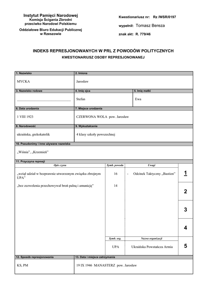 Instytut PamL FL1DURGRZHM Kwestionariusz nr: Rz /WSR/0197 .RPLVMDFLJDQLD=EURGQL przeciwko Narodowi Polskiemu Z\SHáQLá Tomasz Bereza 2GG]LDáRZH%LXUR(GXNDFML3XEOLF]QHM w Rzeszowie znak akt: R. 779/46 INDEKS REPRESJONOWANYCH W PRL Z POWODÓW POLITYCZNYCH KWESTIONARIUSZ OSOBY REPRESJONOWANEJ 1. Nazwisko 2. Imiona -DURVáDZ MYCKA ,PL RMFD 3. Nazwisko rodowe _______________________________ 6. Data urodzenia ,PL PDWNL Stefan Ewa 7. Miejsce urodzenia &=(5:21$:2/$SRZ-DURVáDZ 1 VIII 1923 1DURGRZRü :\NV]WDáFHQLH XNUDLVNDJUHNRNDWROLN NODV\V]NRá\SRZV]HFKQHM 3VHXGRQLP\LLQQHX*\ZDQHQD]ZLVND Ä:LQLD´Ä.U]HPLH´ 11. Przyczyna represji Opis czynu Symb. powodu ÄZ]LáXG]LDáZEH]SUDZQLHXWZRU]RQ\P]ZL]NX]EURMQ\P UPA” 16 ÄEH]]H]ZROHQLDSU]HFKRZ\ZDáEURSDOQLDPXQLFM ´ 14 Uwagi - Odcinek Taktyczny „Bastion” 1 2 3 4 12. Sposób represjonowania KS, PM Symb. org. Nazwa organizacji UPA 8NUDLVND3RZVWDF]D$rmia 13. Data i miejsce zatrzymania ,;0$1$67(5=SRZ-DURVáDZ 5 2VRE\UHSUHVMRQXMFH rew.: CZARNY Józef -38%33U]HP\O post. o tymcz. areszt.: MATKOWSKI Cezary - WPR Rzeszów SU]HVá.$17(.– 9 DP CZARNY Józef -38%33U]HP\O post. o poc. do odp.: CZARNY Józef -38%33U]HP\O VSRU]DNWXRVN672.à26$0DULDQ– WPR Rzeszów zatw. aktu osk.: MATKOWSKI Cezary - WPG Rzeszów 15. Data represji ;SRVW SRZDQLHGRUD(QH ________________________________________________ 16. Miejsce represji 3U]HP\O ,QVW\WXFMDUHSUHVMRQXMFD 18. Znak akt WSR Rzeszów 3U]HZRGQLF]F\VNáDGXV G]LRZVNLHJR %,$à(.=\JPXQW R. 779/46 3R]RVWDOLV G]LRZLHDVHVRU]\áDZQLF\ NIEZGÓDKA MicKDáá.256,(.2&]HVáDZá 2VNDU*\FLHO 2EURFD 0$.$5:áDG\VáDZ nieobecny 23. Wyrok w pierwszej instancji NDUDPLHUFLXWUDWDSUDZQD]DZV]HSU]HSDGHNPLHQLD 3y(QLHMV]H]PLDQ\NDU\LSRGVWDZD]ZROQLHQLD 25. Data zwolnienia _______________________________ 'DWDPLHUFL _________________________________________________________________ 26 X 1946 0LHMVFHPLHUFL Rzeszów - Zamek 3U]\F]\QDPLHUFL powieszenie 'UyGáRLQIRUPDFML $UFKLZXP3DVWZRZHZ5]HV]RZLH ]HVSyáV\JQ (R. 779/46) 29. Miejsce pochówku brak danych 'DWDUHKDELOLWDFMLOXEXQLHZD*Qwyroku ________________________________ 32. Uwagi __________________________________________________________________