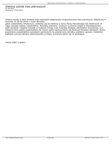 Zespół Szkół w Padwi Narodowej - Gimnazjum w Padwi Narodowej Zielona szkoła klas pierwszych 27.06.2015. Zmieniony 27.06.2015. Zielona szkoła w Góry Stołowe była wyjazdem integracyjno-krajoznawczym klas pierwszych. Odbyła się w terminie 15-20.06.2015 r. Przez Wrocław, gdzie zwiedziliśmy Afrykarium, udaliśmy się do Karłowa w sercu Parku Narodowego Gór Stołowych. W ciągu naszego pobytu zwiedziliśmy: Bazylikę, Kalwarię i muzeum ruchomej szopki w Wambierzycach, park zdrojowy i Kaplicę Czaszek w Kudowie Zdroju oraz Twierdzę Kłodzką. Zdobyliśmy Szczeliniec, a w ostatnim dniu pobytu pojechaliśmy do Czech, gdzie zachwyciliśmy się Skalnym Miastem Adrspach. Wolne popołudnia wypełnialiśmy zawodami sportowymi na polanie przy ośrodku, paliliśmy ognisko i piekliśmy kiełbaski (chrust zebrany własnoręcznie) a chętni uczniowie bawili się na dyskotece. więcej zdjęć w galerii http://padewgimnazjum.cba.pl Kreator PDF Utworzono 7 March, 2017, 06:37