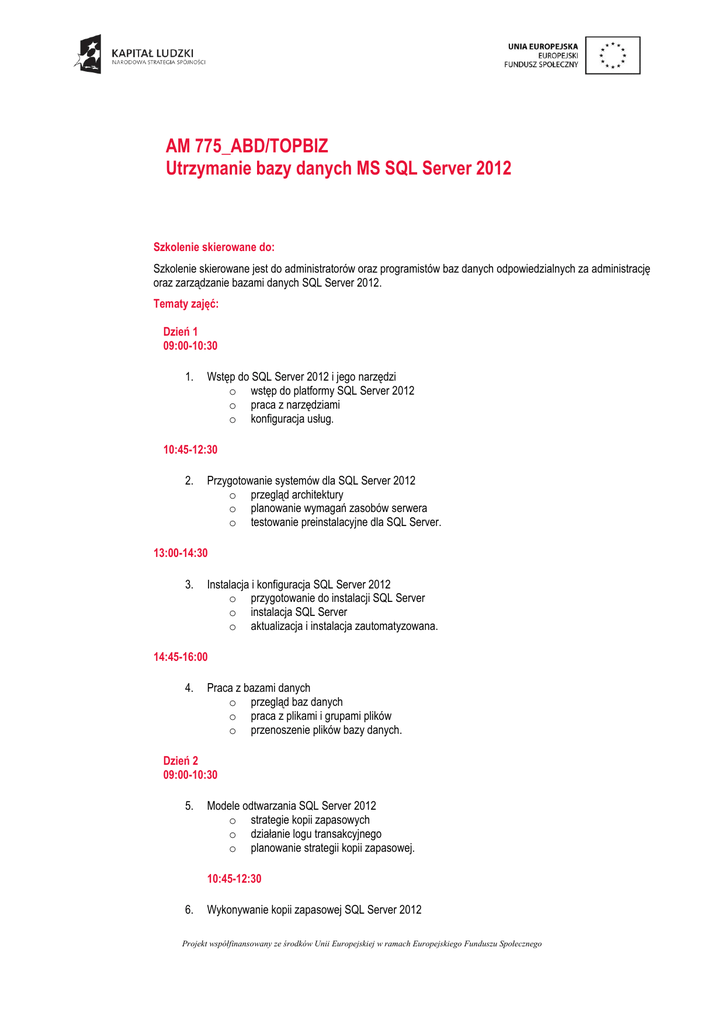 AM 775_ABD/TOPBIZ Utrzymanie bazy danych MS SQL Server 2012 Szkolenie skierowane do: Szkolenie skierowane jest do administratorów oraz programistów baz danych odpowiedzialnych za administrację oraz zarządzanie bazami danych SQL Server 2012. Tematy zajęć: Dzień 1 09:00-10:30 1. Wstęp do SQL Server 2012 i jego narzędzi o wstęp do platformy SQL Server 2012 o praca z narzędziami o konfiguracja usług. 10:45-12:30 2. Przygotowanie systemów dla SQL Server 2012 o przegląd architektury o planowanie wymagań zasobów serwera o testowanie preinstalacyjne dla SQL Server. 13:00-14:30 3. Instalacja i konfiguracja SQL Server 2012 o przygotowanie do instalacji SQL Server o instalacja SQL Server o aktualizacja i instalacja zautomatyzowana. 14:45-16:00 4. Praca z bazami danych o przegląd baz danych o praca z plikami i grupami plików o przenoszenie plików bazy danych. Dzień 2 09:00-10:30 5. Modele odtwarzania SQL Server 2012 o strategie kopii zapasowych o działanie logu transakcyjnego o planowanie strategii kopii zapasowej. 10:45-12:30 6. Wykonywanie kopii zapasowej SQL Server 2012 Projekt współfinansowany ze środków Unii Europejskiej w ramach Europejskiego Funduszu Społecznego AM 775_ABD/TOPBIZ Utrzymanie bazy danych MS SQL Server 2012 o o o kopia zapasowa baz danych i logów zarządzanie kopiami zapasowymi praca z opcjami kopii zapasowej. 13:00-14:30 7. Odtwarzanie baz danych o proces odtwarzania o odtwarzanie baz danych o odtwarzanie do punktu w czasie o odtwarzanie baz systemowych i pojedynczych plików. 14:45-16:00 8. Import i eksport danych o transfer danych do/z SQL Server o import i eksport danych tabeli o masowe wstawianie danych. Dzień 3 09:00-10:30 9. Uwierzytelnianie i autoryzacja o uwierzytelnianie połączeń do SQL Server o autoryzacja kont logowania w bazach danych o autoryzacja między serwerami. 10:45-12:30 10. Przydzielanie ról serwera i bazy danych o praca z rolami serwera o praca ze stałymi rolami baz danych o tworzenie ról użytkownika. 13:00-14:30 11. Autoryzacja dostępu do zasobów o przydzielanie uprawnień dostępu do obiektów o przydzielanie uprawnień do wykonania kodu o konfiguracja uprawnień na poziomie schematu. 14:45-16:00 12. Audyt środowisk SQL Server o opcje audytu dostępu do danych o implementacja SQL Server Audit Projekt współfinansowany ze środków Unii Europejskiej w ramach Europejskiego Funduszu Społecznego AM 775_ABD/TOPBIZ Utrzymanie bazy danych MS SQL Server 2012 o zarządzanie audytami. Dzień 4 09:00-10:30 13. Automatyzacja zarządzania o automatyzacja zarządzania serwerem o praca z SQL Server Agent o zarządzanie pracami SQL Server Agenta. 10:45-12:30 14. Konfiguracja zabezpieczeń SQL Server Agent o zrozumienie zabezpieczeń SQL Server Agent o konfiguracja poświadczeń o konfiguracja kont proxy. 13:00-14:30 15. Monitorowanie przy użyciu alertów i powiadomień o konfiguracja database mail o monitorowanie błędów o konfigurowanie alertów, operatorów i powiadomień. 14:45-16:00 16. Wykonywanie typowych zadań administracyjnych o zapewnienie integralności baz danych o zarządzanie indeksami o automatyzacja powtarzalnych zadań. Dzień 5 09:00-10:30 17. Śledzenie dostępu do SQL Server 2012 o przechwytywanie aktywności przy użyciu Profilera o zwiększanie wydajności przy użyciu Database Tuning Advisor o praca z opcjami śledzenia. 10:45-12:30 18. Monitorowanie SQL Server 2012 o monitorowanie aktywności o przechwytywanie i zarządzanie danymi wydajności o analiza zebranych danych. Projekt współfinansowany ze środków Unii Europejskiej w ramach Europejskiego Funduszu Społecznego AM 775_ABD/TOPBIZ Utrzymanie bazy danych MS SQL Server 2012 13:00-14:30 19. Zarządzanie wieloma serwerami o praca z wieloma serwerami o wirtualizacja SQL Server o instalacja i aktualizacja aplikacji Data-Tier. 14:45-16:00 20. Rozwiązywanie typowych problemów o metodologia rozwiązywania problemów o rozwiązywanie problemów związanych z usługami o rozwiązywanie problemów związanych z konkurencją o rozwiązywanie problemów związanych z logowaniem i połączeniami. Korzyści wynikające z ukończenia szkolenia: Wiedza oraz umiejętności praktyczne związane z zarządzaniem bazami danych przy wykorzystaniu funkcjonalności dostarczanej przez MS SQL Server 2012. Metoda szkolenia: Wykład + warsztaty Czas trwania: 5 dni Projekt współfinansowany ze środków Unii Europejskiej w ramach Europejskiego Funduszu Społecznego