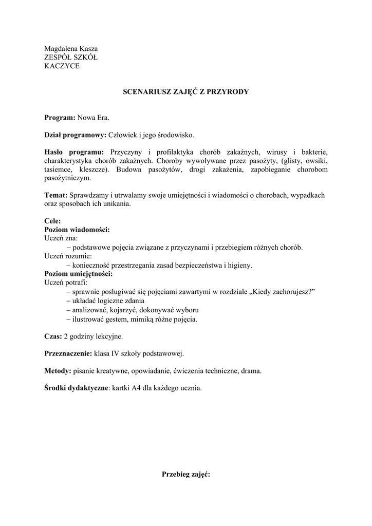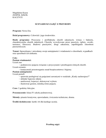 Magdalena Kasza ZESPÓŁ SZKÓŁ KACZYCE SCENARIUSZ ZAJĘĆ Z PRZYRODY Program: Nowa Era. Dział programowy: Człowiek i jego środowisko. Hasło programu: Przyczyny i profilaktyka chorób zakaźnych, wirusy i bakterie, charakterystyka chorób zakaźnych. Choroby wywoływane przez pasożyty, (glisty, owsiki, tasiemce, kleszcze). Budowa pasożytów, drogi zakażenia, zapobieganie chorobom pasożytniczym. Temat: Sprawdzamy i utrwalamy swoje umiejętności i wiadomości o chorobach, wypadkach oraz sposobach ich unikania. Cele: Poziom wiadomości: Uczeń zna: − podstawowe pojęcia związane z przyczynami i przebiegiem różnych chorób. Uczeń rozumie: − konieczność przestrzegania zasad bezpieczeństwa i higieny. Poziom umiejętności: Uczeń potrafi: − sprawnie posługiwać się pojęciami zawartymi w rozdziale „Kiedy zachorujesz?” − układać logiczne zdania − analizować, kojarzyć, dokonywać wyboru − ilustrować gestem, mimiką różne pojęcia. Czas: 2 godziny lekcyjne. Przeznaczenie: klasa IV szkoły podstawowej. Metody: pisanie kreatywne, opowiadanie, ćwiczenia techniczne, drama. Środki dydaktyczne: kartki A4 dla każdego ucznia. Przebieg zajęć: Planowanie i przygotowanie. Nauczyciel przygotowuje dla każdego ucznia kartkę, w której zagiętych rogach umieszcza 4 dowolne wyrazy związane z tematem powtórki. Przeprowadzenie. 1. Uczniowie losują kartki z wyrazami, układają opowiadanie z użyciem wszystkich umieszczonych na kartce słów – zadanie nr 1. 2. Uczniowie w czteroosobowych grupach zapoznają się z historyjkami kolegów i wybierają jedną, którą zaprezentują jako scenkę pantomimiczną – zadanie nr 2. 3. Podczas występów grup pozostali uczniowie odgadują 4 wyrazy, które były podstawą opowiadania i zapisują je na tablicy. Podsumowanie. Uczniowie wykonują zadanie nr 3 polegające na ułożeniu krzyżówki z wykorzystaniem słów zapisanych na tablicy. Materiały dla ucznia Zadanie nr 1 Ułóż opowiadania z użyciem 4 wyrazów, które znalazły się na Twojej kartce. Zadanie nr 2 Zapoznajcie się z historyjkami kolegów. Wybierzcie jedną, którą zaprezentujecie jako scenkę pantomimiczną. Zadanie nr 3 Z podanych na tablicy wyrazów ułóż krzyżówkę z pionowym hasłem: ZDROWIE. W razie potrzeby możesz posłużyć się innymi wyrazami związanymi z tematem. Sformułuj pytania tak, by odpowiedziami były słowa umieszczone w krzyżówce. Materiały dla nauczyciela Zadanie nr 1 Na każdej kartce umieszczone są 4 niewidoczne wyrazy –„ schowane” pod zagiętymi rogami. Wyrazy mogą dotyczyć jednego zjawiska (np.: różyczka, zakażenie, temperatura, wysypka) lub kilku różnych zjawisk jednocześnie – wtedy ułożenie historyjki będzie nieco trudniejsze. Przykładowe zestawy wyrazów: 1. 4. 7. 10. 13. 16. 19. 22. - podwyższona temperatura - choroba - zarazki - szczepienie - choroba zakaźna - zespół Downa - pomoc - choroba wrodzona - odporność wrodzona - hartowanie ciała - grypa - wysoka temperatura - winda - wózek inwalidzki - pomoc - choroba wrodzona - antybiotyki - grypa - powikłania - łóżko - świeże powietrze - odporność - profilaktyka - choroba - złamanie - wypadek - kąpielisko - ratownik - 998 - pomoc - bezpieczeństwo - pożar 2. 5. 8. 11. 14. 17. 20. 23. - odporność - zarażenie - grypa - witaminy - wirusy -ospa wietrzna - odporność - wysoka temperatura - wysypka - choroba - szczepienia ochronne - kaszel - świnka - termometr lekarski - łóżko - zakażenie - gruźlica - mleko - kaszel - szczepienie - omdlenie - pierwsza pomoc - plaster - wypadek - 999 - niebezpieczne zabawy - porażenie prądem - alergia - zatrucie pokarmowe - przeterminowana żywność - picie alkoholu - zachorowanie 3. 6. 9. 12. 15. 18. 21. 24. - warzywa i owoce - zarażenie - wścieklizna - wiewiórka - owsiki - higiena - zarażenie - spożywanie pokarmów - przeciwciała - ospa wietrzna - powietrze - bezpośredni kontakt - angina - pokarm - bakterie - łóżko - droga kropelkowa - lekarz - higiena - choroba - palenie papierosów - odporność - aktywny ruch - profilaktyka - opatrunek - apteczka - krwotok z nosa - woda utleniona - nabywanie odporności - jazda na rowerze - złamanie - pogotowie ratunkowe Zadanie nr 3 Przykładowe rozwiązanie: 1. 2. 3. 4. 1. Jak inaczej nazywamy bakterie i wirusy? 2. Jak nazywa się zdolność organizmu do niszczenia zarazków? 3. Jaki przyrząd wskaże u chorego podwyższoną temperaturę? 4. Jak nazywają się małe pasożyty, którymi można się zarazić zjadając brudne owoce i warzywa? 5. 5. Co zastępuje nogi inwalidom i umożliwia im poruszanie się? 6. 6. Jak inaczej nazywa się uczulenie? 7. 7. Co koniecznie trzeba zabrać ze sobą na wycieczką, aby w razie potrzeby udzielić pierwszej pomocy? 2. 3. T 6. A L E R 7. A P 1. O E 4. 5. G T Z D R O W I E A P M W Ó A C R O O S Z A R M I E Z N E K K K I O Ś Ć T R I Z K A Literatura: Czaińska Z., Wojtkowicz Z.,1999, „Aktywne metody edukacji geograficznej. Propozycja metodyczna do pracy z uczniem w gimnazjum cz. II.” Stowarzyszenie Oświatowców Polskich., Toruń, str. 21