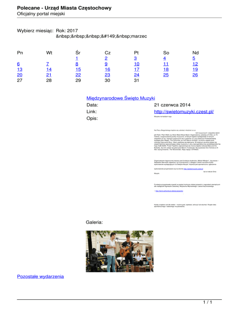 Polecane - Urząd Miasta Częstochowy Oficjalny portal miejski Wybierz miesiąc: Rok: 2017 • marzec • luty • styczeń Pn Wt Rok: 2016Śr Cz Pt So Nd 1 2 3 4 5 • grudzień 6 7 • listopad 8 9 10 11 12 13 14 • październik 15 16 17 18 19 20 21 • wrzesień 22 23 24 25 26 27 28 • sierpień 29 30 31 • lipiec • czerwiec • maj Międzynarodowe Święto Muzyki • kwiecień Data: 21 czerwca 2014 • marzec Link: http://swietomuzyki.czest.pl/ • luty Opis: • styczeń Rok: 2015 • grudzień • listopad • październik • wrzesień • sierpień • lipiec • czerwiec • maj • kwiecień • marzec • luty • styczeń Rok: 2014 • grudzień • listopad • październik • wrzesień Galeria: • sierpień • lipiec • czerwiec • maj • kwiecień • marzec • luty • styczeń Muzyka na każdym rogu Na Placu Biegańskiego będzie się udzielać młodzież ze sz kół muzycznych i zespołów takich jak Flesh, Plain Walk czy Silver Black Blues Band. Organizatorzy ustawią w III Alei, co 70 metrów, zorganizowane punkty muzyczne, w których będzie występowało 6 różnych zespołów na raz. Impreza rozpoczyna się o godzinie 15, przy ławeczce Poświatowskiej wystąpią Alex Meglio, The Perfumes, po nich Marcin Grodzki i na końcu kapela puck rockowa Ojszczane Mury. Obok usadowią się bębniarze. W kolejnym punkcie pojawi się zespół Gamma reprezentujący sklep muzyczny z ulicy Jasnogórskiej oraz przedstawiciele hip hopu NJB SQAD. Przed Topollino zaprezentuje się mocna kapela rockowa Bats and the Butterfly. Za nimi ustawi się gitarzysta Marcin Trzewiczek. Na wysokości Don Kichota w III Alei: Dying Dreamer, The Neverender, Rapu Opcja i STRADO. Organizatorem tegorocznej imprezy jest fundacja studencka „Młodzi-Młodym”. Jej prezes – Sebastian Biernacki zapewnia, że w porównaniu z ubiegłym rokiem wzrośnie liczba wykonawców występujących na Święcie Muzyki. Impreza jest spontaniczna: zgłoszenia wykonawców przyjmowane są na stronie http://swietomuzyki.czest.pl lub w trakcie Dnia Muzyki. Fundacja przygotowała nowość w postaci konkursu dobrej piosenki z nagrodami pieniężnymi dla następców Agnieszki Osieckiej, Wojciecha Młynarskiego i Jacka Kaczmarskiego – http://fsmm.pl/konkurs-dobrej-piosenki/ . Każdy znajdzie coś dla siebie – można grać, śpiewać, tańczyć lub słuchać. Rządzi idea spontanicznego i radosnego muzykowania. Pozostałe wydarzenia 1/1 Powered by TCPDF (www.tcpdf.org)