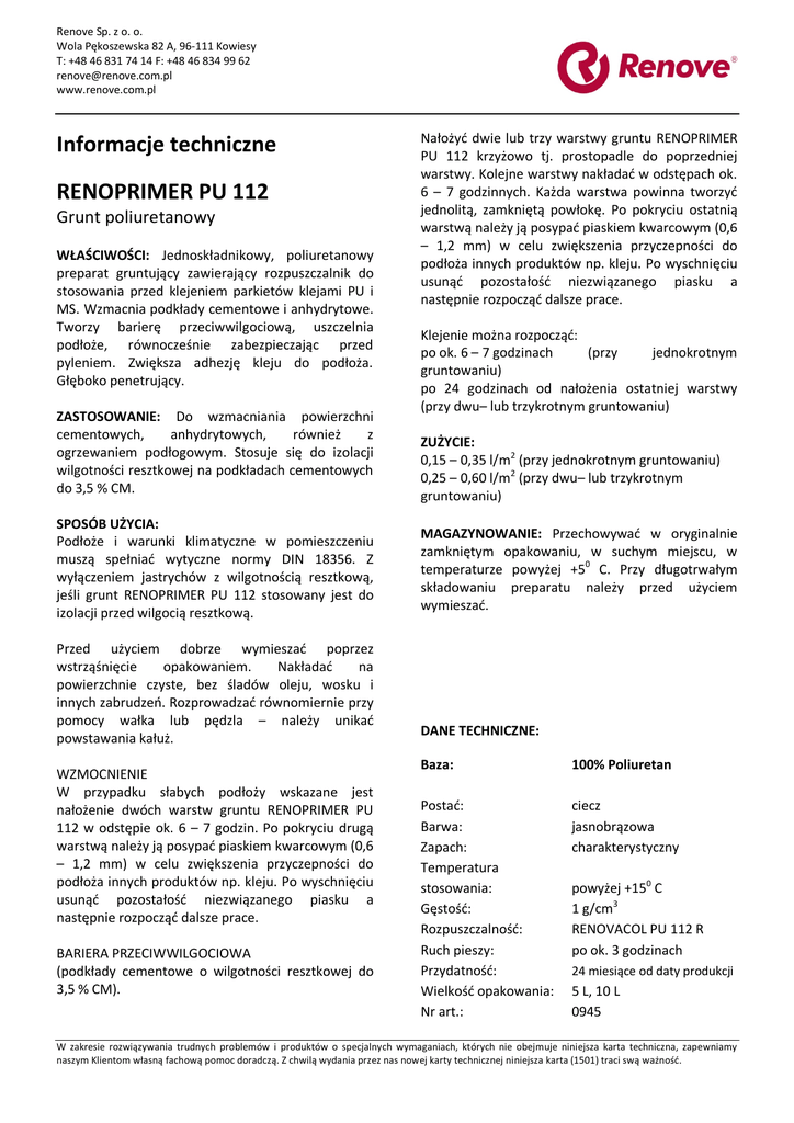 Renove Sp. z o. o. Wola Pękoszewska 82 A, 96-111 Kowiesy T: +48 46 831 74 14 F: +48 46 834 99 62 [email protected] www.renove.com.pl Informacje techniczne RENOPRIMER PU 112 Grunt poliuretanowy WŁAŚCIWOŚCI: Jednoskładnikowy, poliuretanowy preparat gruntujący zawierający rozpuszczalnik do stosowania przed klejeniem parkietów klejami PU i MS. Wzmacnia podkłady cementowe i anhydrytowe. Tworzy barierę przeciwwilgociową, uszczelnia podłoże, równocześnie zabezpieczając przed pyleniem. Zwiększa adhezję kleju do podłoża. Głęboko penetrujący. ZASTOSOWANIE: Do wzmacniania powierzchni cementowych, anhydrytowych, również z ogrzewaniem podłogowym. Stosuje się do izolacji wilgotności resztkowej na podkładach cementowych do 3,5 % CM. SPOSÓB UŻYCIA: Podłoże i warunki klimatyczne w pomieszczeniu muszą spełniać wytyczne normy DIN 18356. Z wyłączeniem jastrychów z wilgotnością resztkową, jeśli grunt RENOPRIMER PU 112 stosowany jest do izolacji przed wilgocią resztkową. Przed użyciem dobrze wymieszać poprzez wstrząśnięcie opakowaniem. Nakładać na powierzchnie czyste, bez śladów oleju, wosku i innych zabrudzeń. Rozprowadzać równomiernie przy pomocy wałka lub pędzla – należy unikać powstawania kałuż. WZMOCNIENIE W przypadku słabych podłoży wskazane jest nałożenie dwóch warstw gruntu RENOPRIMER PU 112 w odstępie ok. 6 – 7 godzin. Po pokryciu drugą warstwą należy ją posypać piaskiem kwarcowym (0,6 – 1,2 mm) w celu zwiększenia przyczepności do podłoża innych produktów np. kleju. Po wyschnięciu usunąć pozostałość niezwiązanego piasku a następnie rozpocząć dalsze prace. BARIERA PRZECIWWILGOCIOWA (podkłady cementowe o wilgotności resztkowej do 3,5 % CM). Nałożyć dwie lub trzy warstwy gruntu RENOPRIMER PU 112 krzyżowo tj. prostopadle do poprzedniej warstwy. Kolejne warstwy nakładać w odstępach ok. 6 – 7 godzinnych. Każda warstwa powinna tworzyć jednolitą, zamkniętą powłokę. Po pokryciu ostatnią warstwą należy ją posypać piaskiem kwarcowym (0,6 – 1,2 mm) w celu zwiększenia przyczepności do podłoża innych produktów np. kleju. Po wyschnięciu usunąć pozostałość niezwiązanego piasku a następnie rozpocząć dalsze prace. Klejenie można rozpocząć: po ok. 6 – 7 godzinach (przy jednokrotnym gruntowaniu) po 24 godzinach od nałożenia ostatniej warstwy (przy dwu– lub trzykrotnym gruntowaniu) ZUŻYCIE: 0,15 – 0,35 l/m2 (przy jednokrotnym gruntowaniu) 0,25 – 0,60 l/m2 (przy dwu– lub trzykrotnym gruntowaniu) MAGAZYNOWANIE: Przechowywać w oryginalnie zamkniętym opakowaniu, w suchym miejscu, w temperaturze powyżej +50 C. Przy długotrwałym składowaniu preparatu należy przed użyciem wymieszać. DANE TECHNICZNE: Baza: 100% Poliuretan Postać: Barwa: Zapach: Temperatura stosowania: Gęstość: Rozpuszczalność: Ruch pieszy: Przydatność: Wielkość opakowania: Nr art.: ciecz jasnobrązowa charakterystyczny powyżej +150 C 1 g/cm3 RENOVACOL PU 112 R po ok. 3 godzinach 24 miesiące od daty produkcji 5 L, 10 L 0945 W zakresie rozwiązywania trudnych problemów i produktów o specjalnych wymaganiach, których nie obejmuje niniejsza karta techniczna, zapewniamy naszym Klientom własną fachową pomoc doradczą. Z chwilą wydania przez nas nowej karty technicznej niniejsza karta (1501) traci swą ważność.