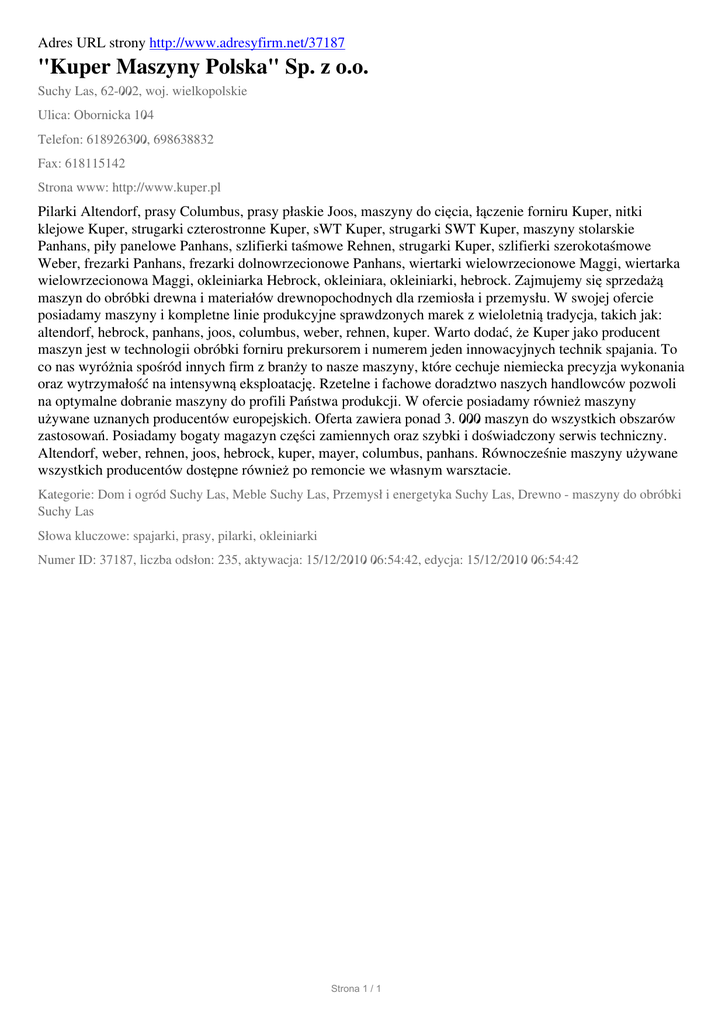 Adres URL strony http://www.adresyfirm.net/37187 "Kuper Maszyny Polska" Sp. z o.o. Suchy Las, 62-002, woj. wielkopolskie Ulica: Obornicka 104 Telefon: 618926300, 698638832 Fax: 618115142 Strona www: http://www.kuper.pl Pilarki Altendorf, prasy Columbus, prasy płaskie Joos, maszyny do cięcia, łączenie forniru Kuper, nitki klejowe Kuper, strugarki czterostronne Kuper, sWT Kuper, strugarki SWT Kuper, maszyny stolarskie Panhans, piły panelowe Panhans, szlifierki taśmowe Rehnen, strugarki Kuper, szlifierki szerokotaśmowe Weber, frezarki Panhans, frezarki dolnowrzecionowe Panhans, wiertarki wielowrzecionowe Maggi, wiertarka wielowrzecionowa Maggi, okleiniarka Hebrock, okleiniara, okleiniarki, hebrock. Zajmujemy się sprzedażą maszyn do obróbki drewna i materiałów drewnopochodnych dla rzemiosła i przemysłu. W swojej ofercie posiadamy maszyny i kompletne linie produkcyjne sprawdzonych marek z wieloletnią tradycja, takich jak: altendorf, hebrock, panhans, joos, columbus, weber, rehnen, kuper. Warto dodać, że Kuper jako producent maszyn jest w technologii obróbki forniru prekursorem i numerem jeden innowacyjnych technik spajania. To co nas wyróżnia spośród innych firm z branży to nasze maszyny, które cechuje niemiecka precyzja wykonania oraz wytrzymałość na intensywną eksploatację. Rzetelne i fachowe doradztwo naszych handlowców pozwoli na optymalne dobranie maszyny do profili Państwa produkcji. W ofercie posiadamy również maszyny używane uznanych producentów europejskich. Oferta zawiera ponad 3. 000 maszyn do wszystkich obszarów zastosowań. Posiadamy bogaty magazyn części zamiennych oraz szybki i doświadczony serwis techniczny. Altendorf, weber, rehnen, joos, hebrock, kuper, mayer, columbus, panhans. Równocześnie maszyny używane wszystkich producentów dostępne również po remoncie we własnym warsztacie. Kategorie: Dom i ogród Suchy Las, Meble Suchy Las, Przemysł i energetyka Suchy Las, Drewno - maszyny do obróbki Suchy Las Słowa kluczowe: spajarki, prasy, pilarki, okleiniarki Numer ID: 37187, liczba odsłon: 235, aktywacja: 15/12/2010 06:54:42, edycja: 15/12/2010 06:54:42 Strona 1 / 1