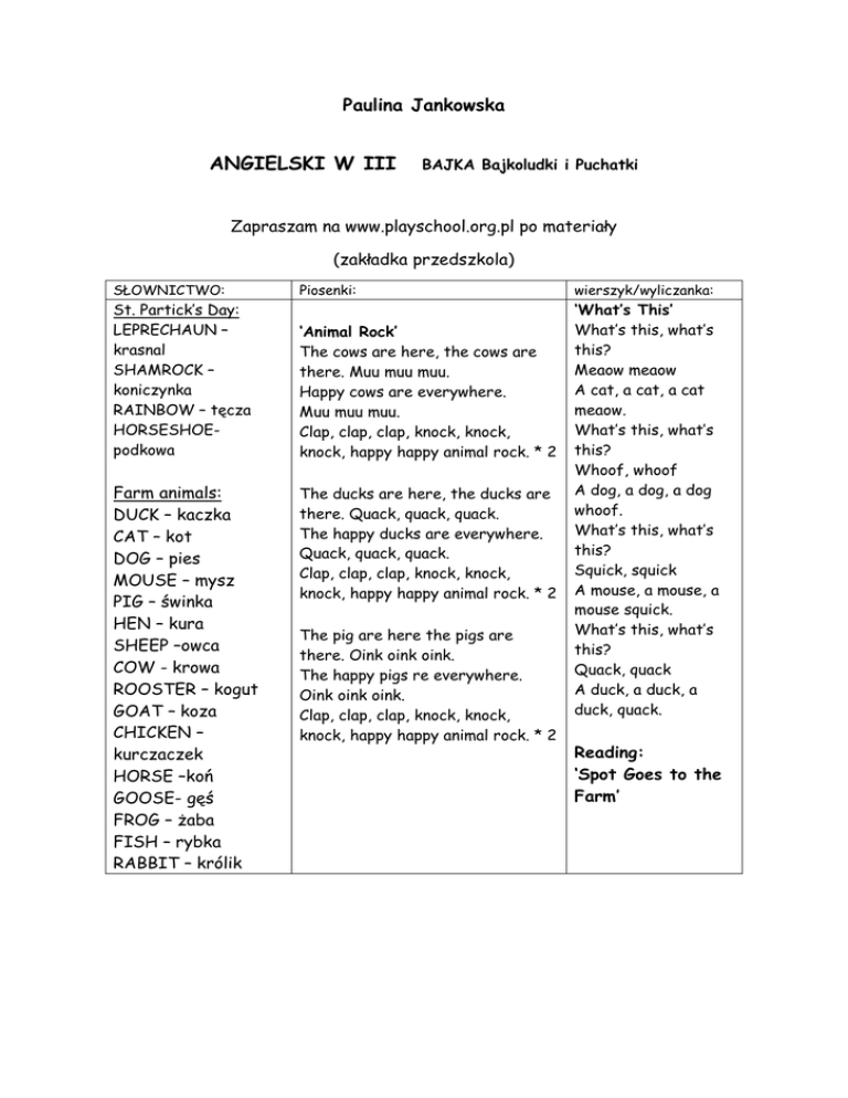 Paulina Jankowska ANGIELSKI W III BAJKA Bajkoludki i Puchatki Zapraszam na www.playschool.org.pl po materiały (zakładka przedszkola) SŁOWNICTWO: St. Partick’s Day: LEPRECHAUN – krasnal SHAMROCK – koniczynka RAINBOW – tęcza HORSESHOEpodkowa Farm animals: DUCK – kaczka CAT – kot DOG – pies MOUSE – mysz PIG – świnka HEN – kura SHEEP –owca COW - krowa ROOSTER – kogut GOAT – koza CHICKEN – kurczaczek HORSE –koń GOOSE- gęś FROG – żaba FISH – rybka RABBIT – królik Piosenki: ‘Animal Rock’ The cows are here, the cows are there. Muu muu muu. Happy cows are everywhere. Muu muu muu. Clap, clap, clap, knock, knock, knock, happy happy animal rock. * 2 The ducks are here, the ducks are there. Quack, quack, quack. The happy ducks are everywhere. Quack, quack, quack. Clap, clap, clap, knock, knock, knock, happy happy animal rock. * 2 The pig are here the pigs are there. Oink oink oink. The happy pigs re everywhere. Oink oink oink. Clap, clap, clap, knock, knock, knock, happy happy animal rock. * 2 wierszyk/wyliczanka: ‘What’s This’ What’s this, what’s this? Meaow meaow A cat, a cat, a cat meaow. What’s this, what’s this? Whoof, whoof A dog, a dog, a dog whoof. What’s this, what’s this? Squick, squick A mouse, a mouse, a mouse squick. What’s this, what’s this? Quack, quack A duck, a duck, a duck, quack. Reading: ‘Spot Goes to the Farm’