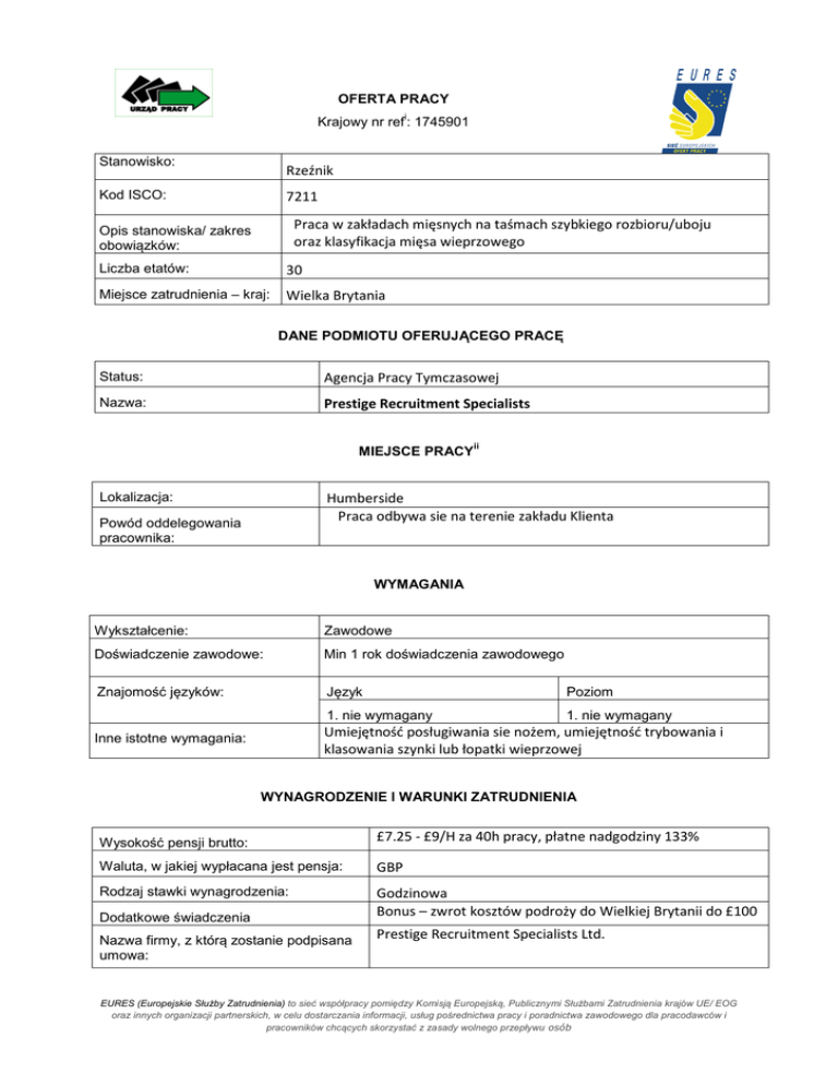 OFERTA PRACY i Krajowy nr ref : 1745901 Stanowisko: Rzeźnik Kod ISCO: 7211 Praca w zakładach mięsnych na taśmach szybkiego rozbioru/uboju oraz klasyfikacja mięsa wieprzowego Opis stanowiska/ zakres obowiązków: Liczba etatów: 30 Miejsce zatrudnienia – kraj: Wielka Brytania DANE PODMIOTU OFERUJĄCEGO PRACĘ Status: Agencja Pracy Tymczasowej Nazwa: Prestige Recruitment Specialists MIEJSCE PRACY Lokalizacja: ii Humberside Praca odbywa sie na terenie zakładu Klienta Powód oddelegowania pracownika: WYMAGANIA Wykształcenie: Zawodowe Doświadczenie zawodowe: Min 1 rok doświadczenia zawodowego Znajomość języków: Język Poziom 1. nie wymagany 1. nie wymagany Inne istotne wymagania: Umiejętność posługiwania sie nożem, umiejętność trybowania i klasowania szynki lub łopatki wieprzowej WYNAGRODZENIE I WARUNKI ZATRUDNIENIA Wysokość pensji brutto: £7.25 - £9/H za 40h pracy, płatne nadgodziny 133% Waluta, w jakiej wypłacana jest pensja: GBP Rodzaj stawki wynagrodzenia: Godzinowa Bonus – zwrot kosztów podroży do Wielkiej Brytanii do £100 Dodatkowe świadczenia Nazwa firmy, z którą zostanie podpisana umowa: Prestige Recruitment Specialists Ltd. EURES (Europejskie Służby Zatrudnienia) to sieć współpracy pomiędzy Komisją Europejską, Publicznymi Służbami Zatrudnienia krajów UE/ EOG oraz innych organizacji partnerskich, w celu dostarczania informacji, usług pośrednictwa pracy i poradnictwa zawodowego dla pracodawców i pracowników chcących skorzystać z zasady wolnego przepływu osób Rodzaj umowy: Umowa o pracę, umowa zlecenie Wymiar czasu pracy Pełen etat Czas trwania umowy: Nieokreślony Liczba godzin tygodniowo: 40-60 h tygodniowo Zmiany i praca w dni wolne: Możliwa praca w sobotę Data rozpoczęcia: od zaraz Data wygaśnięcia umowy : SPOSÓB SKŁADANIA WNIOSKU Wymagane dokumenty CV Język, w którym muszą być sporządzone przedkładane dokumenty: j. polski Do kogo należy wysłać dokumenty: Do DORADCY EURES Gdzie należy wysłać dokumenty: Adres email [email protected] z dopiskiem: rzeźnik - Humberside Dane teleadresowe doradcy EURES lub przedstawiciela pracodawcy: [email protected] WAŻNOŚĆ Data publikacji: 16.09.2013 Termin przedkładania podań o pracę / zakończenia ważności oferty: Do odwołania Uprzejmie informujemy, że skontaktujemy się wyłącznie z wybranymi kandydatami. UWAGA: 1. Umowa z zagranicznym pracodawcą zostanie zawarta zgodnie z prawem kraju zatrudnienia. Oznacza to, że wszystkie roszczenia odnośnie do warunków, które obejmuje umowa, można kierować wyłącznie do odpowiedniego sądu w kraju zatrudnienia. Publiczne służby zatrudnienia (EURES) nie mogą pośredniczyć ani reprezentować pracownika w sądzie kraju zatrudnienia w przypadku sporu z pracodawcą. 2. Publiczne służby zatrudnienia (EURES) dokładają wszelkich starań, aby zapewnić rzetelność i wiarygodność ofert pracy zgłoszonych w lokalnym urzędzie pracy. Należy wyjaśnić, że oferta pracy została zgłoszona przez stronę trzecią i EURES nie odpowiada za ewentualne rozbieżności między warunkami pracy określonymi w ofercie pracy i warunkami oferowanymi przez potencjalnego pracodawcę. 3. Publiczne służby zatrudnienia (EURES) informują, że będą zbierać, przetwarzać i przekazywać potencjalnym pracodawcom zgodnie z przepisami dotyczącymi ochrony danych osobowych wszystkie dane osobowe dostarczone przez osoby poszukujące pracy. i Krajowy nr ref. na portalu EURES www.eures.europa.eu . Dotyczy ofert pracy publicznych służb zatrudnienia, których bazy danych ofert pracy są połączone z portalem EURES. ii Miejsce, w którym będzie wykonywana praca. Należy wypełnić w przypadku gdy: 1) miejsce wykonywania pracy jest inne niż siedziba podmiotu oferującego pracę, 2) pracę oferuje agencja pośrednictwa pracy/ agencja pracy tymczasowej. EURES (Europejskie Służby Zatrudnienia) to sieć współpracy pomiędzy Komisją Europejską, Publicznymi Służbami Zatrudnienia krajów UE/ EOG oraz innych organizacji partnerskich, w celu dostarczania informacji, usług pośrednictwa pracy i poradnictwa zawodowego dla pracodawców i pracowników chcących skorzystać z zasady wolnego przepływu osób