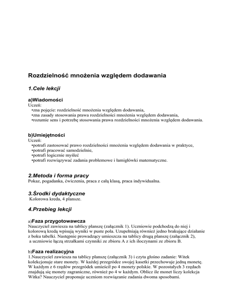 Rozdzielność mnożenia względem dodawania 1.Cele lekcji a)Wiadomości Uczeń: •zna pojęcie: rozdzielność mnożenia względem dodawania, •zna zasady stosowania prawa rozdzielności mnożenia względem dodawania, •rozumie sens i potrzebę stosowania prawa rozdzielności mnożenia względem dodawania. b)Umiejętności Uczeń: •potrafi zastosować prawo rozdzielności mnożenia względem dodawania w praktyce, •potrafi pracować samodzielnie, •potrafi logicznie myśleć •potrafi rozwiązywać zadania problemowe i łamigłówki matematyczne. 2.Metoda i forma pracy Pokaz, pogadanka, ćwiczenia, praca z całą klasą, praca indywidualna. 3.Środki dydaktyczne Kolorowa kreda, 4 plansze. 4.Przebieg lekcji a)Faza przygotowawcza Nauczyciel zawiesza na tablicy planszę (załącznik 1). Uczniowie podchodzą do niej i kolorową kredą wpisują wyniki w puste pola. Uzupełniają również jedno brakujące działanie z boku tabelki. Następnie prowadzący umieszcza na tablicy drugą planszę (załącznik 2), a uczniowie łączą strzałkami czynniki ze zbioru A z ich iloczynami ze zbioru B. b)Faza realizacyjna 1.Nauczyciel zawiesza na tablicy planszę (załącznik 3) i czyta głośno zadanie: Witek kolekcjonuje stare monety. W każdej przegródce swojej kasetki przechowuje jedną monetę. W każdym z 6 rzędów przegródek umieścił po 4 monety polskie. W pozostałych 3 rzędach znajdują się monety zagraniczne, również po 4 w każdym. Oblicz ile monet liczy kolekcja Witka? Nauczyciel proponuje uczniom rozwiązanie zadania dwoma sposobami. I sposób: Obliczamy ilość monet polskich (4 x 6), potem ilość monet zagranicznych (4 x 3) i sumujemy iloczyny. Otrzymujemy działanie: 4 x 6 + 4 x 3 = 24 + 12 = 36. II sposób: Obliczamy sumę rzędów w kasetce (6 + 3)i mnożymy przez ilość monet w każdym rzędzie (4). Otrzymujemy działanie: 4 x (6 + 3) = 4 x 9 = 36. Ponieważ otrzymaliśmy takie same wyniki, możemy powiedzieć, że 4 x ( 6 + 3) = = 4 x 6 + 4 x 3. Taką własność ma każda trójka liczb, czyli możemy ją zapisać w formie wzoru: a x (b + c) = a x b + a x c. Jest to prawo rozdzielności mnożenia względem dodawania. 2.Uczniowie przerysowują do zeszytu rysunek z tablicy oraz przepisują działanie: 4 x (6 + 3) = 4 x 6 + 4 x 3 i wzór: a x ( b + c) = a x b + a x c. 3.Przerwa śródlekcyjna – zabawa ze śpiewem: „Nitka” (załącznik 4). Dzieci śpiewają piosenkę wraz z nauczycielem i maszerują między ławkami w rytm piosenki. Prowadzi nauczyciel. Zabawę powtarza się kilkakrotnie w zależności od potrzeb. 4.Nauczyciel umieszcza na tablicy kolejną planszę (załącznik 5). Czyta głośno następne zadanie. Ogrodnik sadził w sadzie drzewka owocowe: jabłonie i grusze. Było 8 rzędów jabłoni po 6 w każdym i 3 rzędy grusz po 6 w każdym. Ile drzew owocowych posadził ogrodnik? Uczniowie zapisują działanie na tablicy: 6 x ( 8 + 3) = 6 x 8 + 6 x 3 = 48 +18 = = 66. 5.Ochotnicy rozwiązują na tablicy działania: 4 x 18, 5 x 26, 8 x 16, 9 x 22, stosując poznane prawo. Pozostali uczniowie przepisują przykłady z tablicy do zeszytu. c)Faza podsumowująca Uczniowie przypominają, jakie prawo poznali na dzisiejszej lekcji i jakie korzyści z niego wynikają. Nauczyciel podkreśla, że prawo to ma szczególne zastosowanie w mnożeniu liczb dwucyfrowych, bo wtedy znacznie ułatwia nam szybkie obliczenie iloczynu. 5.Bibliografia R.Trześniowski , Gry i zabawy ruchowe, Wydawnictwo „Sport i Turystyka”, Warszawa 1987. 6.Załączniki a) Plansze do rachunku pamięciowego załącznik 1. załącznik 2. b) Plansze do zadań tekstowych załącznik 3. 6 3 4 6+3 załącznik 5. 8 3 6 8+3 c) Zabawa ze śpiewem: „Nitka” załącznik 4. „Nitka” Nitko, nitko, hej niteczko. Zwijaj mi się równiuteńko, W ładne kółko mi się zwiń, Tylko mi się nie zerwij. 7.Czas trwania lekcji 45 minut 8.Uwagi do scenariusza brak