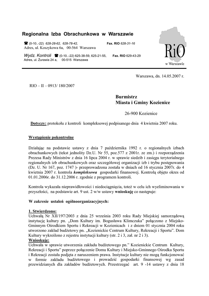 Regionalna Izba Obrachunkowa w Warszawie (0-10..-22) 628-28-62, 628-78-42, Adres, ul. Koszykowa 6a, 00-564 Warszawa Fax. RIO 628-31-16 Wydz. Kontroli (0-10..-22) 625-38-59, 625-21-55, Adres, ul. śurawia 24 a, Fax. RIO 629-43-29 00-515 Warszawa Warszawa, dn. 14.05.2007 r. RIO – II – 0913/ 180/2007 Burmistrz Miasta i Gminy Kozienice 26-900 Kozienice Dotyczy: protokołu z kontroli kompleksowej podpisanego dnia 4 kwietnia 2007 roku. Wystąpienie pokontrolne Działając na podstawie ustawy z dnia 7 października 1992 r. o regionalnych izbach obrachunkowych (tekst jednolity Dz.U. Nr 55, poz.577 z 2001r. ze zm.) i rozporządzenia Prezesa Rady Ministrów z dnia 16 lipca 2004 r. w sprawie siedzib i zasięgu terytorialnego regionalnych izb obrachunkowych oraz szczegółowej organizacji izb i trybu postępowania (Dz. U. Nr 167, poz. 1747 )- przeprowadzona została w dniach od 16 stycznia 2007r. do 4 kwietnia 2007 r. kontrola kompleksowa gospodarki finansowej. Kontrolą objęto okres od 01.01.2006r. do 31.12.2006 r. zgodnie z programem kontroli. Kontrola wykazała nieprawidłowości i niedociągnięcia, toteŜ w celu ich wyeliminowania w przyszłości, na podstawie art. 9 ust. 2 w/w ustawy wnioskuję co następuje: W zakresie ustaleń ogólnoorganizacyjnych: 1. Stwierdzono: Uchwałą Nr XII/197/2003 z dnia 25 września 2003 roku Rady Miejskiej samorządową instytucję kultury pn. „Dom Kultury im. Bogusława Klimczuka” połączono z MiejskoGminnym Ośrodkiem Sportu i Rekreacji w Kozienicach i z dniem 01 stycznia 2004 roku utworzono zakład budŜetowy pn. „Kozienickie Centrum Kultury, Rekreacji i Sportu”. Dom Kultury wykreślono z rejestru instytucji kultury (str. 2 i 3, zał. nr 2 i 3). Wnioskuję: Uchwała w sprawie utworzenia zakładu budŜetowego pn.” Kozienickie Centrum Kultury, Rekreacji i Sportu” poprzez połączenie Domu Kultury i Miejsko-Gminnego Ośrodka Sportu i Rekreacji została podjęta z naruszeniem prawa. Instytucje kultury nie mogą funkcjonować w formie zakładu budŜetowego i prowadzić gospodarki finansowej wg zasad przewidzianych dla zakładów budŜetowych. Przestrzegać art. 9 -14 ustawy z dnia 18 2 stycznia 1991 roku o organizowaniu i prowadzeniu działalności kulturalnej (t.j. Dz. U. z 2001 r. Nr 13, poz. 123 ze zm.). 2. Stwierdzono: W § 15 Statutu KCKRiS im. B. Klimczuka (zakładu budŜetowego) zapisano, Ŝe przy Centrum działa Społeczna Rada Programowa, którą powołuje Rada Miejska i która jest organem doradczym kierownika zakładu budŜetowego. Rady tej zgodnie z wewnętrznymi ustaleniami nie powołano (str. 2 i 3, zał. nr 2 i 3). Wnioskuję: Podejmować działania wynikające z własnych uregulowań organizacyjno-prawnych a ponadto przestrzegać przepisów art.18 a ust.1 i 2 ustawy z dnia 18 stycznia 1996 roku o kulturze fizycznej (t.j. Dz. U. z 2001 r. Nr 81, poz. 889 ze zm.) zobowiązujących organ wykonawczy do powołania rady sportu, która w szczególności opiniuje projekty rozwoju i budŜetu w części dotyczącej kultury fizycznej. 3. Stwierdzono: Nie przestrzegano terminowości przekazywania uchwał budŜetowych. W badanym okresie 2006 rok. 15 uchwał przekazano do RIO Z/Radom po terminie ustawowym (str. 4, zał. nr 4 i 5). Wnioskuję: Przestrzegać terminowości przekazywania uchwał organowi nadzoru zgodnie z wymogami określonymi w art. 90 ust. 2 ustawy z dnia 08 marca 1990 roku o samorządzie gminnym (t.j. Dz. U. z 2001 r. Nr 142, poz. 1591 ze zm.) 4. Stwierdzono: Zakładowych planów kont opracowanych dla organu finansowego i jednostki nie uzupełniono o wykaz kont ksiąg pomocniczych prowadzonych do poszczególnych kont księgi głównej. W wewnętrznych regulacjach prawnych dotyczących dokumentacji opisującej zasady i sposób prowadzenia ksiąg rachunkowych dla gminy i urzędu brak wykazu kont ksiąg pomocniczych oraz zasad ich powiązania z kontami księgi głównej (str. 4, zał. nr 6). Wnioskuję: Ustalić wykaz kont ksiąg pomocniczych a takŜe zasady ich powiązania z ewidencją syntetyczną stosownie do wymogów wynikających z art. 10 ust. 1 pkt. 3a ustawy z dnia 29 września 1994 roku o rachunkowości ( t.j. z 2002 roku Dz. U. Nr 76, poz. 694 z późn. zm.) oraz § 12 ust. 1 pkt. 2 rozporządzenia Ministra Finansów z dnia 28 lipca 2006 roku w sprawie szczególnych zasad rachunkowości oraz planów kont dla budŜetu państwa, budŜetów jednostek samorządu terytorialnego oraz niektórych jednostek sektora finansów publicznych ( Dz. U. Nr 142, poz. 1020). 5. Stwierdzono: Nie opracowano zasad odpisów amortyzacyjnych dla środków trwałych i wartości niematerialnych i prawnych a w szczególności metody amortyzacji i okresu rozpoczęcia odpisów amortyzacyjnych.(str. 4 i 5, zał. nr 7). Wnioskuję: Zasady amortyzacji środków trwałych i wartości niematerialnych i prawnych opracować stosownie do wymogów wskazanych w art. 32 i 33 ustawy z dnia 29 września 1994r. o rachunkowości. 6. Stwierdzono: W okresie objętym kontrolą kierownik Urzędu Miejskiego nie opracował procedur kontroli finansowej stosowanych dla tej jednostki oraz harmonogramu kontroli finansowej 3 stosownie do ustaleń zawartych w § 29 pkt.2 rozdz. VI regulaminu organizacyjnego urzędu (str. 5 i 6, zał. nr 9). Wnioskuję: Przestrzegać przepisów własnych regulacji organizacyjno-prawnych. Procedury kontroli finansowej opracować zgodnie z art. 47 ust. 3 ustawy z dnia 30 czerwca 2005 roku o finansach publicznych ( Dz. U. Nr 249, poz. 2104 ze zm.). 7. Stwierdzono: Nie przeprowadzono w 2006 roku Ŝadnej kontroli finansowej w podległych i nadzorowanych jednostkach sektora finansów publicznych (str. 5 i 6, zał. nr 9). Wnioskuję: W podległych jednostkach przeprowadzać kontrolę zgodnie z przepisami wynikającymi z art. 187 ust. 2 i 3 ustawy z dnia 30 czerwca 2005 roku o finansach publicznych. W nadzorowanych jednostkach zaliczanych do sektora finansów publicznych przeprowadzać kontrolę stosownie do wymogów zawartych w art. 187 ust. 2 w zwią