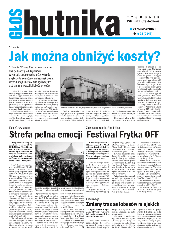 t y g o d n i k ISD Huty Częstochowa l 24 czerwca 2016 r. l nr 23 (2643) Stalownia Jak można obniżyć koszty? Stalownia ISD Huty Częstochowa stara się obniżyć koszty produkcji wsadu. W tym celu przeprowadza próby wytopów z wykorzystaniem różnych mieszanek złomu. Optymalizacja kosztów musi być związana z utrzymaniem wysokiej jakości wyrobów. Stalownia, która po kilkumiesięcznej przerwie wznowiła produkcję 1 czerwca, bez komplikacji przeszła okres rozruchu. Obecnie pracuje już w normalnym rytmie, produkując slaby zgodnie z bieżącym zapotrzebowaniem walcowni Blach Grubych. – Produkowany wsad utrzymuje wskaźniki jakościowe – mówi Jarosław Huptyś, szef Wydziału Stalownia. Po ustabilizowaniu produkcji po okresie rozruchu, Stalownia przystąpiła do rozszerzenia asortymentu oraz prac nad optymalizacją kosztów. – 16 czerwca, po raz pierwszy od czasu ponownego uruchomienia Stalowni przystąpiliśmy do odlewania wlewków o formacie 150. Próby zakończyły się powodzeniem – dodaje Jarosław Huptyś. Przypomina, że podstawowy format wytwarzanych wlewków to 225. W czerwcu Stalownia ISD Huty Częstochowa wyprodukuje 30 tysięcy ton wsadu na potrzeby walcowni. Oprócz utrzymania i stałego poprawiania jakości wsadu, celem Stalowni jest teraz obniżenie kosztów funkcjonowania. Głównie chodzi o koszty produkcji, na które składają się m.in. zużycie energii elektrycznej, złomu i materiałów pomocniczych. Jedną z dróg do redukcji kosztów jest stosowanie jako wsadu do pieca tańszych mieszanek złomu. Huta kupuje złom w kilku klasach, różniących się Euro 2016 w Alejach Zaproszenie na ulicę Piłsudskiego Dużą popularnością cieszy się strefa kibica EURO GOL 2016 na Placu Biegańskiego, gdzie na telebimie można oglądać mecze piłkarskich Mistrzostw Europy. Rekord frekwencji może paść w sobotę podczas spotkania Polska - Szwajcaria. W najbliższy weekend, 24 i 25 czerwca, na ulicy Piłsudskiego odbędzie się kolejna edycja Festiwalu Kultury Alternatywnej Frytka OFF. Gwiazdą będzie zespół Voo Voo, ale atrakcji zaplanowano znacznie więcej. jakością i formatem, a co za tym idzie ceną. Następnie – w odpowiednich proporcjach – złom ten trafia jako wsad do pieca. Trwające obecnie w Stalowni eksperymenty maja dać odpowiedź jakie mieszanki złomu można stosować, aby obniżyć koszty bez pogorszenia jakości, czyli uzyskać optymalne wskaźniki wytwarzania płynnej stali. W trakcie trzech tygodni funkcjonowania Stalownia wyprodukowała 22,2 tys. ton wsadu, a do końca czerwca wykona planowane 30 tys. ton. Dzięki temu od początku czerwca Walcownia Blach Grubych ISD Huty Częstochowa, która borykała się z brakiem dostaw slabów z Alczewska, może prowadzić produkcję blachy w oparciu o własny wsad. N Strefa pełna emocji Festiwal Frytka OFF Strefę kibica zorganizował Urząd Miasta i Ośrodek Promocji Kultury „Gaude Mater” przy wsparciu sponsorów. Na trybunach jest 300 miejsc siedzących na wprost telebimu (25 metrów kw. powierzchni), a obok scena, namiot z napojami, toalety i boisko ze sztuczną nawierzchnią, na którym rywalizują głównie najmłodsi. Strefa zaczęła działać wraz z otwarciem Mistrzostw Europy we Francji i będzie funkcjonowała aż do finału – 10 lipca. W przerwach meczów odbywają się dla publiczności konkursy z nagrodami. Tylko w ubiegły piątek z powodu porywistego wiatru, który zagrażał namiotom i scenie, strefa na jeden dzień musiała zawiesić działalność. Największym zainteresowaniem cieszyły się rzecz jasna mecze Polaków. Kibice zjawiają się wówczas w barwach narodowych Strefa kibica na Placu Biegańskiego w trakcie meczu Polska - Irlandia Północna. Zdjęcie Łukasza Raczka ze strony www.czestochowa.pl i z gadżetami do dopingowania, podobnie jak na stadionie. Strefa była wypełniona zarówno podczas pojedynku z Irlandią Północną, jak i Niemcami, a podczas wtorkowe spotkania z Ukrainą niemal zabrakło miejsc. Prawdopodobnie jeszcze więcej osób zjawi się w sobotę podczas meczu ze Szwajcarią, a potem na środowym ćwierćfinale o ile zagra w nim Polska. Jednak, co ciekawe, trybuny w strefie zapełniają się także w czasie transmisji in- nych spotkań, zwłaszcza wieczornych. Najwidoczniej, nie brakuje osób zainteresowanych piłką nożną, które lubią oglądać mecze na otwartym powietrzu i w towarzystwie innych kibiców. Dodatkowo, wydarzeniom piłkarskim, towarzyszą w strefie kibica koncerty. Gościli tam już m.in. Red Lips i Mezo (przed meczem Polska - Ukraina), a zapowiadane są występy orkiestr dętych (3 lipca) i koncert jazzu tradycyjnego (7 lipca). N Festiwal, którego nazwa pochodzi od popularnych budek z frytkami, stojących wzdłuż ul. Piłsudskiego, odbywa się bezpośrednio na ulicy oraz na scenach ustawionych w okolicy dworca PKP. Jego celem jest propagowanie kultury alternatywnej, a szczególnie oryginalnych nurtów muzyki – od elektroniki po folk. W piątek na ałej scenie muzycznej zaprezentują się: Krzywe Nogi (godz. 17), EXTRA (godz. 18), Daniel Bloom (godz. 19.30), grupa „twocolors” z Berlina (godz. 21) i Rebeka (godz. 22.40). Również najmłodsi znajdą coś dla siebie. Na scenie teatralnej od godz. 16 będą animacje dla dzieci, pokaz Stowarzyszenia Kultury Hip Hop Przybij Piątkę, wystąpi teatr Terminus. Jak co roku, w piątek o godz. 20.30, odbędzie się również Wielka Parada Frytkowa. Wśród atrakcji teatralnych największym wydarzeniem będzie występ Lwowskiego Teatru Woskresinnia ze spektaklem, będącym interpretacją dramatu Antoniego Czechowa „Wiśniowy sad” (w piątek o godz. 22). Dodatkowo w ramach festiwalu Frytka OFF będzie funkcjonował namiot Stowarzyszenia „YAWA”, Centrum Promocji Młodych, a także zaplanowano warsztaty filmowe Multimedia Off i warsztaty fotograficzne. Natomiast w sobotę dominować będzie muzyka. Na dużej scenie zagrają kolejno: Ampera (godz. 16.30), Marcelina
