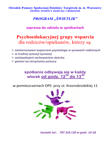 Ośrodek Pomocy Społecznej Dzielnicy Targówek m. st. Warszawy ZESPÓŁ POMOCY DZIECKU I RODZINIE PROGRAM „ŚWIETLIK” zaprasza do udziału w spotkaniach Psychoedukacyjnej grupy wsparcia dla rodziców/opiekunów, którzy są: zainteresowani wsparciem psychologa w sprawach rodzinnych w trudnej sytuacji życiowej zaniepokojeni zachowaniem dziecka gotowi na otrzymanie pomocy spotkania odbywają się w każdy 30 30 wtorek od godz. 12 do 13 w pomieszczeniach OPS przy ul. Krasnobrodzkiej 11 kontakt tel.: 797 318 130 w godz. 14-18