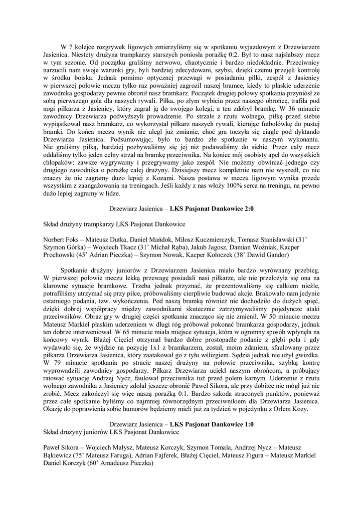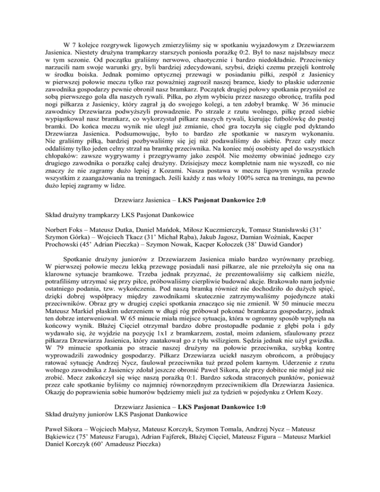 W 7 kolejce rozgrywek ligowych zmierzyliśmy się w spotkaniu wyjazdowym z Drzewiarzem Jasienica. Niestety drużyna trampkarzy starszych poniosła porażkę 0:2. Był to nasz najsłabszy mecz w tym sezonie. Od początku graliśmy nerwowo, chaotycznie i bardzo niedokładnie. Przeciwnicy narzucili nam swoje warunki gry, byli bardziej zdecydowani, szybsi, dzięki czemu przejęli kontrolę w środku boiska. Jednak pomimo optycznej przewagi w posiadaniu piłki, zespół z Jasienicy w pierwszej połowie meczu tylko raz poważniej zagroził naszej bramce, kiedy to płaskie uderzenie zawodnika gospodarzy pewnie obronił nasz bramkarz. Początek drugiej połowy spotkania przyniósł ze sobą pierwszego gola dla naszych rywali. Piłka, po złym wybiciu przez naszego obrońcę, trafiła pod nogi piłkarza z Jasienicy, który zagrał ją do swojego kolegi, a ten zdobył bramkę. W 36 minucie zawodnicy Drzewiarza podwyższyli prowadzenie. Po strzale z rzutu wolnego, piłkę przed siebie wypiąstkował nasz bramkarz, co wykorzystał piłkarz naszych rywali, kierując futbolówkę do pustej bramki. Do końca meczu wynik nie uległ już zmianie, choć gra toczyła się ciągle pod dyktando Drzewiarza Jasienica. Podsumowując, było to bardzo złe spotkanie w naszym wykonaniu. Nie graliśmy piłką, bardziej pozbywaliśmy się jej niż podawaliśmy do siebie. Przez cały mecz oddaliśmy tylko jeden celny strzał na bramkę przeciwnika. Na koniec mój osobisty apel do wszystkich chłopaków: zawsze wygrywamy i przegrywamy jako zespół. Nie możemy obwiniać jednego czy drugiego zawodnika o porażkę całej drużyny. Dzisiejszy mecz kompletnie nam nie wyszedł, co nie znaczy że nie zagramy dużo lepiej z Kozami. Nasza postawa w meczu ligowym wynika przede wszystkim z zaangażowania na treningach. Jeśli każdy z nas włoży 100% serca na treningu, na pewno dużo lepiej zagramy w lidze. Drzewiarz Jasienica – LKS Pasjonat Dankowice 2:0 Skład drużyny trampkarzy LKS Pasjonat Dankowice Norbert Foks – Mateusz Dutka, Daniel Mańdok, Miłosz Kuczmierczyk, Tomasz Stanisławski (31’ Szymon Górka) – Wojciech Tkacz (31’ Michał Rąba), Jakub Jagosz, Damian Woźniak, Kacper Prochowski (45’ Adrian Pieczka) – Szymon Nowak, Kacper Kołoczek (38’ Dawid Gandor) Spotkanie drużyny juniorów z Drzewiarzem Jasienica miało bardzo wyrównany przebieg. W pierwszej połowie meczu lekką przewagę posiadali nasi piłkarze, ale nie przełożyła się ona na klarowne sytuacje bramkowe. Trzeba jednak przyznać, że prezentowaliśmy się całkiem nieźle, potrafiliśmy utrzymać się przy piłce, próbowaliśmy cierpliwie budować akcje. Brakowało nam jedynie ostatniego podania, tzw. wykończenia. Pod naszą bramką również nie dochodziło do dużych spięć, dzięki dobrej współpracy między zawodnikami skutecznie zatrzymywaliśmy pojedyncze ataki przeciwników. Obraz gry w drugiej części spotkania znacząco się nie zmienił. W 50 minucie meczu Mateusz Markiel płaskim uderzeniem w długi róg próbował pokonać bramkarza gospodarzy, jednak ten dobrze interweniował. W 65 minucie miała miejsce sytuacja, która w ogromny sposób wpłynęła na końcowy wynik. Błażej Cięciel otrzymał bardzo dobre prostopadłe podanie z głębi pola i gdy wydawało się, że wyjdzie na pozycję 1x1 z bramkarzem, został, moim zdaniem, sfaulowany przez piłkarza Drzewiarza Jasienica, który zaatakował go z tyłu wślizgiem. Sędzia jednak nie użył gwizdka. W 79 minucie spotkania po stracie naszej drużyny na połowie przeciwnika, szybką kontrę wyprowadzili zawodnicy gospodarzy. Piłkarz Drzewiarza uciekł naszym obrońcom, a próbujący ratować sytuację Andrzej Nycz, faulował przeciwnika tuż przed polem karnym. Uderzenie z rzutu wolnego zawodnika z Jasienicy zdołał jeszcze obronić Paweł Sikora, ale przy dobitce nie mógł już nic zrobić. Mecz zakończył się więc naszą porażką 0:1. Bardzo szkoda straconych punktów, ponieważ przez całe spotkanie byliśmy co najmniej równorzędnym przeciwnikiem dla Drzewiarza Jasienica. Okazję do poprawienia sobie humorów będziemy mieli już za tydzień w pojedynku z Orłem Kozy. Drzewiarz Jasienica – LKS Pasjonat Dankowice 1:0 Skład drużyny juniorów LKS Pasjonat Dankowice Paweł Sikora – Wojciech Małysz, Mateusz Korczyk, Szymon Tomala, Andrzej Nycz – Mateusz Bąkiewicz (75’ Mateusz Faruga), Adrian Fajferek, Błażej Cięciel, Mateusz Figura – Mateusz Markiel Daniel Korczyk (60’ Amadeusz Pieczka) Krzysztof Hoder