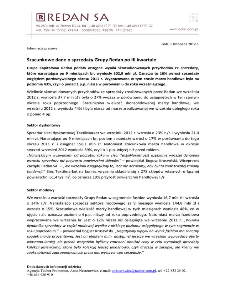 Łódź, 5 listopada 2012 r. Informacja prasowa Szacunkowe dane o sprzedaży Grupy Redan po III kwartale Grupa Kapitałowa Redan podała wstępne wyniki skonsolidowanych przychodów ze sprzedaży, które narastająco po 9 miesiącach br. wyniosły 302,9 mln zł. Oznacza to 16% wzrost sprzedaży względem porównywalnego okresu 2011 r. Wypracowana w tym czasie marża handlowa była na poziomie 43%, czyli o ponad 1 p.p. niższa w porównaniu do roku wcześniejszego. Wielkość skonsolidowanych przychodów ze sprzedaży zrealizowanych przez Redan we wrześniu 2012 r. wyniosła 37,7 mln zł i była o 27% wyższa w porównaniu do osiągniętych w tym samym okresie roku poprzedniego. Szacunkowa wielkość skonsolidowanej marży handlowej we wrześniu 2012 r. wyniosła 44% i była niższa od marzy zrealizowanej we wrześniu ubiegłego roku o ponad 4 pp. Sektor dyskontowy Sprzedaż sieci dyskontowej TextilMarket we wrześniu 2012 r. wzrosła o 23% r./r. i wyniosła 21,0 mln zł. Narastająco po 9 miesiącach br. poziom sprzedaży wzrósł o 17% w porównaniu do tego okresu 2011 r. i osiągnął 158,1 mln zł. Natomiast szacunkowa marża handlowa w okresie styczeń-wrzesień 2012 wyniosła 39%, czyli o 1 p.p. więcej niż przed rokiem. „Największym wyzwaniem od początku roku w sieci TextilMarket jest uzyskanie wyższej dynamiki wzrostu sprzedaży niż przyrostu powierzchni sklepów” – powiedział Bogusz Kruszyński, Wiceprezes Zarządu Redan SA. – „We wrześniu osiągnęliśmy to, lecz nie oceniamy, aby był to znak trwałej zmiany tendencji.” Sieć Textilmarket na koniec wrzesnia składała się z 278 sklepów własnych o łącznej powierzchni 61,4 tys. m2, co oznacza 19% przyrost powierzchni handlowej r./r. Sektor modowy We wrześniu wartość sprzedaży Grupy Redan w segmencie fashion wyniosła 16,7 mln zł i wzrosła o 34% r./r. Narastająco sprzedaż sektora modowego za 9 miesięcy wyniosła 144,8 mln zł i wzrosła o 15%. Szacunkowa wielkość marży handlowej w tych miesiącach wyniosła 48%, co w ujęciu r./r. oznacza poziom o 4 p.p. niższy od roku poprzedniego. Natomiast marża handlowa wypracowana we wrześniu br. jest o 12% niższa niż osiągnięta we wrześniu 2011 r. „Wysoka dynamika sprzedaży w części modowej wynika z niskiego poziomu osiągniętego w tym segmencie w roku poprzednim.” – powiedział Bogusz Kruszyński. „Negatywny wpływ na wynik fashion ma znaczny spadek marży procentowej. Jest on efektem m.in. dostępnej jeszcze we wrześniu wyprzedaży oferty wiosenno-letniej, ale przede wszystkim byliśmy zmuszeni obniżać ceny w celu stymulacji sprzedaży kolekcji jesień/zima, która była kolekcją lepszą jakościowo, czyli droższą w zakupie, ale klienci nie zaakceptowali zaproponowanych przez nas wyższych cen sprzedaży.” Dodatkowych informacji udziela: Agencja Tauber Promotion, Anna Nesterowicz, e-mail: [email protected], tel. +22 833 35 02, +48 664 926 910 W sieci sprzedaży marek modowych: Top Secret, Troll i Drywash w Polsce i za granicą na koniec września funkcjonowało 220 sklepów własnych i franczyzowych o łącznej powierzchni 35,1 tys. m2, co oznacza wzrost powierzchni handlowej o 15% r/r. *** Redan SA jest operatorem znanych detalicznych marek odzieżowych: Top Secret, Troll i Drywash oraz sieci sklepów TextilMarket. Spółka funkcjonuje w ramach Grupy Kapitałowej, która zajmuje się projektowaniem, marketingiem oraz dystrybucją odzieży. Redan zleca swoją produkcję fabrykom w Polsce, Chinach, Indiach Turcji, Korei i Bangladeszu. W Polsce Grupa Kapitałowa zatrudnia dwa tysiące osób. Sprzedaż jest prowadzona w 4 sieciach detalicznych: Top Secret, Top Secret&Friends, Troll oraz Textilmarket liczących ponad 490 sklepów. Redan powstał w 1995 roku, a w 2003 roku akcje Spółki zostały dopuszczone do publicznego obrotu na Giełdzie Papierów Wartościowych w Warszawie. Spółka aktywnie wspiera Fundację Happy Kids. Dodatkowych informacji udziela: Agencja Tauber Promotion, Anna Nesterowicz, e-mail: [email protected], tel. +22 833 35 02, +48 664 926 910