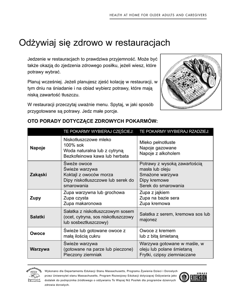 H E A LT H AT H O M E F O R O L D E R A D U LT S A N D C A R E G I V E R S Odżywiaj się zdrowo w restauracjach Jedzenie w restauracjach to prawdziwa przyjemność. Może być także okazją do zjedzenia zdrowego posiłku, jeżeli wiesz, które potrawy wybrać. Planuj wcześniej. Jeżeli planujesz zjeść kolację w restauracji, w tym dniu na śniadanie i na obiad wybierz potrawy, które mają niską zawartość tłuszczu. W restauracji przeczytaj uważnie menu. Spytaj, w jaki sposób przygotowane są potrawy. Jedz małe porcje. OTO PORADY DOTYCZĄCE ZDROWYCH POKARMÓW: TE POKARMY WYBIERAJ CZĘŚCIEJ: Napoje Zakąski Zupy Sałatki Owoce Warzywa Niskotłuszczowe mleko 100% sok Woda naturalna lub z cytryną Bezkofeinowa kawa lub herbata Śweże owoce Świeże warzywa Koktajl z owoców morza Dipy niskotłuszczowe lub serek do smarowania Zupa warzywna lub grochowa Zupa czysta Zupa makaronowa Sałatka z niskotłuszczowym sosem (ocet, cytryna, sos niskotłuszczowy lub sosbeztłuszczowy) Świeże lub gotowane owoce z małą ilością cukru Świeże warzywa (gotowane na parze lub pieczone) Pieczony ziemniak TE POKARMY WYBIERAJ RZADZIEJ: Mleko pełnotłuste Napoje gazowane Napoje z alkoholem Potrawy z wysoką zawartością masła lub oleju Smażone warzywa Dipy kremowe Serek do smarowania Zupa z jajkiem Zupa na bazie sera Zupa kremowa Sałatka z serem, kremowa sos lub majonez Owoce z kremem lub z bitą śmietaną Warzywa gotowane w maśle, w oleju lub polane śmietaną Frytki, czipsy ziemniaczane Wykonano dla Departamentu Edukacji Stanu Massachusetts, Programu Żywienia Dzieci i Dorosłych przez Uniwersytet stanu Massachusetts, Program Rozwojowy Edukacji dotyczącej Odżywiania jako dodatek do podręcznika źródłowego o odżywianiu To Więcej Niż Posiłek dla programów dziennych zdrowia dorosłych. Odżywiaj się zdrowo w restauracjach 2 Ryby Drób TE POKARMY WYBIERAJ CZĘŚCIEJ: TE POKARMY WYBIERAJ RZADZIEJ: Kurczak, indyk lub kura (gotowane w lekkich sosach i z usuniętą skórą) Smażone lub z panierką z masła Gęś lub kaczka Pieczone w piekarniku,gotowane na parze lub pieczone na ruszcie z niewielką ilością dodanego oleju lub tłuszczu Chude kawałki mięsa z odkrojonym tłuszczem (i bez panierki z bułki), takie jak: Mięso • Wołowina Schabowy, polędwica, zrzowy lub comber Chuda mielona wołowina • Wieprzowina Polędwica Wędliny Niskotłuszczowe wędliny Chleb Inne produkty zbożowe Tłuszcze oleje (używać rzadko) Przyprawy Desery Ryby z dodtkiem oleju lub tłuszczu (smażone, sos tatarski, sosy kremowe lub masło) Tłuste kawałki, takie jak: • Wołowina „Pierwszej jakości” wołowina Normalna mielona wołowina • Wieprzowina Żeberka Mięso w panierce z bułki Wędliny Mielonka Kiełbasa lub boczek Hot dogi i kiełbaski Chleb pełnoziarnisty, pałeczki chlebowe pełnopszenny chleb pita Biały chleb, bułeczki, rogaliki, bułki maślane, ciasta, pączki Niskotłuszczowy sos do sałatek Majonez niskotłuszczowy Wysokotłuszczowy sos do sałatek Majonez pełnotłuszczowy Masło lub margaryna Tłuszcz spod boczku lub smalec Gotowany w wodzie lub na parze lub brązowy ryż Makaron pełnoziarnisty Zioła, przyprawy, ocet Sos sojowy z niewielką ilością sodu Ciasto biszkoptowe Świeże owoce Zamrożone owoce Jogurt smakowy niskotłuszzowy Zamrożony jogurt niskotłuszczowy Smażony ryż, biały ryż, makaron nie zrobiony z całych ziaren Sos A-1, sos sojowy Sos Worcestershire Ciasta lub ciasteczka Deser z owoców lub herbatniki Krem lub bita śmietana Kisiel Lody Źródło: University of Massachusetts Extension Nutrition Education Program, Eating Out the Low-Fat Way. Departament Edukacji stanu Massachusetts, pracodawca stosujący Działania Afirmacyjne, oddany jest sprawie udostępnienia wszystkich swoich programów i placówek. Nie dyskryminujemy na podstawie wieku, koloru skóry, kalectwa, pochodzenia narodowego, rasy, religii, płci ani orientacji seksualnej. © 2006 Departament Edukacji stanu Massachusetts. Niniejszym zezwala się na tworzenie kopii całego lub części niniejszego dokumentu dla niekomercyjnych celów edukacyjnych. Jako źródło proszę podać „Departament Edukacji stanu Massachusetts” Translation provided by the University of Massachusetts Amherst Translation Center - Polish 8/06