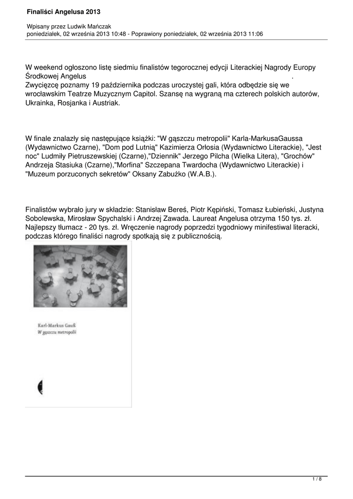Finaliści Angelusa 2013 Wpisany przez Ludwik Mańczak poniedziałek, 02 września 2013 10:48 - Poprawiony poniedziałek, 02 września 2013 11:06 W weekend ogłoszono listę siedmiu finalistów tegorocznej edycji Literackiej Nagrody Europy Środkowej Angelus . Zwycięzcę poznamy 19 października podczas uroczystej gali, która odbędzie się we wrocławskim Teatrze Muzycznym Capitol. Szansę na wygraną ma czterech polskich autorów, Ukrainka, Rosjanka i Austriak. W finale znalazły się następujące książki: "W gąszczu metropolii" Karla-MarkusaGaussa (Wydawnictwo Czarne), "Dom pod Lutnią" Kazimierza Orłosia (Wydawnictwo Literackie), "Jest noc" Ludmiły Pietruszewskiej (Czarne),"Dziennik" Jerzego Pilcha (Wielka Litera), "Grochów" Andrzeja Stasiuka (Czarne),"Morfina" Szczepana Twardocha (Wydawnictwo Literackie) i "Muzeum porzuconych sekretów" Oksany Zabużko (W.A.B.). Finalistów wybrało jury w składzie: Stanisław Bereś, Piotr Kępiński, Tomasz Łubieński, Justyna Sobolewska, Mirosław Spychalski i Andrzej Zawada. Laureat Angelusa otrzyma 150 tys. zł. Najlepszy tłumacz - 20 tys. zł. Wręczenie nagrody poprzedzi tygodniowy minifestiwal literacki, podczas którego finaliści nagrody spotkają się z publicznością. 1/8 Finaliści Angelusa 2013 Wpisany przez Ludwik Mańczak poniedziałek, 02 września 2013 10:48 - Poprawiony poniedziałek, 02 września 2013 11:06 ***** W GĄSZCZU METROPOLII - Karl Markus Gauss (WYD. CZARNE) "Na pozór są to zapiski z podróży do względnie cywilizowanych miejsc, gdzie narratorowi nie może przydarzyć się nic z wyjątkiem niestrawności i koincydencji literackich, będących okazją do tysięcznych dygresji. A jednak podczas tych wycieczek do Starej i Nowej Europy - w Brukseli i w Bukareszcie, w Wiedniu, Opolu i Belgradzie - wytrawny reporter i eseista odkrywa te same oznaki rozkładu. Jak na tym pchlim targu w Brukseli, niegdyś eleganckim, dziś zawalonym klamotami, które jeszcze niedawno piętrzyły się na targowisku w Odessie... Niepokojąca książka o końcu europejskiego marzenia ". Aleksander Kaczorowski "Karl Markus Gauß już dawno wyrobił sobie markę pisarza przemierzającego granice europejskich krajów i opisującego obrzeża naszego kontynentu z perspektywy wnikliwego badacza, równocześnie jednak dowcipnie i przede wszystkim lekko. Ta książka także jest wielkim opowiadaniem o podróży - opowiadaniem, w którym autor, mistrz montażu literackiego, prowadzi nas przez najrozmaitsze zakątki, ukazując sploty ludzkich losów, snując dygresje, dodając pozornie luźne obserwacje, by stworzyć w końcu bardzo gęsty obraz - równie dokładny, jak i niepokojący obraz Europy" . Martin Pollack 2/8 Finaliści Angelusa 2013 Wpisany przez Ludwik Mańczak poniedziałek, 02 września 2013 10:48 - Poprawiony poniedziałek, 02 września 2013 11:06 ***** JEST NOC - Ludmiła Pietruszewska (WYD. CZARNE) Jest noc to znakomite studium rosyjskiego wcielenia figury Matki Polki, monodram bezrobotnej poetki, która zamartwia się niewesołym losem swoich dorosłych dzieci. Syn siedzi w więzieniu, córka zjawia się rzadko w kwaterunkowym moskiewskim mieszkanku, za to niemal zawsze w kolejnej ciąży, a najstarszy wnuk po opieką umęczonej babci nie dojada... Ludmiła Pietruszewska w duchu najlepszej tradycji literatury rosyjskiej - która jak żadna inna potrafi uchwycić i ubrać w słowa wibracje ludzkiego cierpienia - tworzy portret kobiety samotnej i bez reszty oddanej rodzinie. ***** GROCHÓW - Andrzej Stasiuk (WYD. CZARNE) "Kiedyś nas nie będzie. Są ludzie i zdarzenia, które pomagają nam przyzwyczaić się do tej myśli. Bo to w końcu przychodzi. I to tak jakoś szybko i zwyczajnie, jakby zawsze było obok ". 3/8 Finaliści Angelusa 2013 Wpisany przez Ludwik Mańczak poniedziałek, 02 września 2013 10:48 - Poprawiony poniedziałek, 02 września 2013 11:06 O babce, która wierzyła w duchy, o starym psie, pisarzu z Izdebek i przyjacielu, z którym złaził Grochów i przejechał pół Polski — Stasiuk pisze o umieraniu i namacalności życia, o materialności wspomnień, o bliskości śmierci i jej wiecznej niedostępności. Bury kot zwija się w kłębek w cieple stygnącego ciała starej suki, babka, „cała w czerni, szczupła i spokojna”, przechodzi do świata, który zawsze był obok, Guścio choć niewiele już może powiedzieć, złośliwie pluje pestkami. A przyjaciel, „odlatując przez komin”, przynosi zapach pociągu do Łupkowa, dzikich jabłoni na ulicy Makowskiej i chłodnej wiosny w portowym Piranie. Cztery opowiadania Andrzeja Stasiuka to boleśnie piękna opowieść o śmierci, o zwyczajnej kropce na końcu życia. ***** DOM POD LUTNIĄ - Kazimierz Orłość (WYD. LITERACKIE) Piękna opowieść obyczajowo-historyczna i miłosna, pokazująca odmiany uczuć, napięcia i związki między bohaterami. Utwór traktuje o losie jednej, nie do końca typowej, rodziny inteligenckiej zaraz po drugiej wojnie światowej. W enklawie mazurskiej wsi, powojenni rozbitkowie znaleźli swoją małą ojczyznę. Mieszkają tu Ukraińcy, Polacy, niemieckojęzyczni Mazurzy, a miarą ich postępowania nie jest przynależność narodowa czy wyznanie, lecz zwykła, ludzka przyzwoitość. Wprawdzie w tym sielankowym miejscu panoszy się nowy aparat władzy oraz skłonni do samosądów partyzanci, ale w 4/8 Finaliści Angelusa 2013 Wpisany przez Ludwik Mańczak poniedziałek, 02 września 2013 10:48 - Poprawiony poniedziałek, 02 września 2013 11:06 ekstremalnych sytuacjach nawet "ci źli" działają niestereotypowo. Stereotypowi wymyka się również główny bohater powieści, pułkownik Józef Bronowicz - bohater wojenny, który wbrew konwenansom realizuje swoje nowe, dość awanturnicze życie. W niecodzienną sytuację wchodzi chłopiec, którego okoliczności zmusiły do zamieszkania z półkownikiem. I tak zaczęło się jego dorastanie wśród baśniowej przyrody w niecodziennej społeczności i w "ciekawym czasie". 