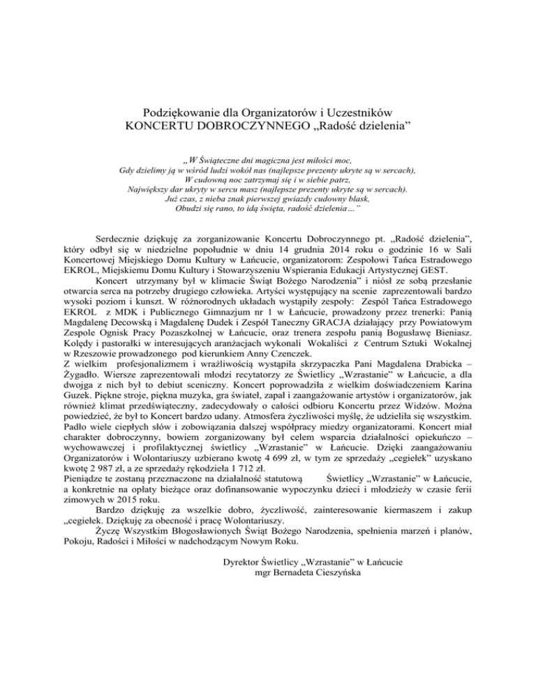 Podziękowanie dla Organizatorów i Uczestników KONCERTU DOBROCZYNNEGO „Radość dzielenia” „W Świąteczne dni magiczna jest miłości moc, Gdy dzielimy ją w wśród ludzi wokół nas (najlepsze prezenty ukryte są w sercach), W cudowną noc zatrzymaj się i w siebie patrz, Największy dar ukryty w sercu masz (najlepsze prezenty ukryte są w sercach). Już czas, z nieba znak pierwszej gwiazdy cudowny blask, Obudzi się rano, to idą święta, radość dzielenia…” Serdecznie dziękuję za zorganizowanie Koncertu Dobroczynnego pt. „Radość dzielenia”, który odbył się w niedzielne popołudnie w dniu 14 grudnia 2014 roku o godzinie 16 w Sali Koncertowej Miejskiego Domu Kultury w Łańcucie, organizatorom: Zespołowi Tańca Estradowego EKROL, Miejskiemu Domu Kultury i Stowarzyszeniu Wspierania Edukacji Artystycznej GEST. Koncert utrzymany był w klimacie Świąt Bożego Narodzenia” i niósł ze sobą przesłanie otwarcia serca na potrzeby drugiego człowieka. Artyści występujący na scenie zaprezentowali bardzo wysoki poziom i kunszt. W różnorodnych układach wystąpiły zespoły: Zespól Tańca Estradowego EKROL z MDK i Publicznego Gimnazjum nr 1 w Łańcucie, prowadzony przez trenerki: Panią Magdalenę Decowską i Magdalenę Dudek i Zespół Taneczny GRACJA działający przy Powiatowym Zespole Ognisk Pracy Pozaszkolnej w Łańcucie, oraz trenera zespołu panią Bogusławę Bieniasz. Kolędy i pastorałki w interesujących aranżacjach wykonali Wokaliści z Centrum Sztuki Wokalnej w Rzeszowie prowadzonego pod kierunkiem Anny Czenczek. Z wielkim profesjonalizmem i wrażliwością wystąpiła skrzypaczka Pani Magdalena Drabicka – Żygadło. Wiersze zaprezentowali młodzi recytatorzy ze Świetlicy „Wzrastanie” w Łańcucie, a dla dwojga z nich był to debiut sceniczny. Koncert poprowadziła z wielkim doświadczeniem Karina Guzek. Piękne stroje, piękna muzyka, gra świateł, zapał i zaangażowanie artystów i organizatorów, jak również klimat przedświąteczny, zadecydowały o całości odbioru Koncertu przez Widzów. Można powiedzieć, że był to Koncert bardzo udany. Atmosfera życzliwości myślę, że udzieliła się wszystkim. Padło wiele ciepłych słów i zobowiązania dalszej współpracy miedzy organizatorami. Koncert miał charakter dobroczynny, bowiem zorganizowany był celem wsparcia działalności opiekuńczo – wychowawczej i profilaktycznej świetlicy „Wzrastanie” w Łańcucie. Dzięki zaangażowaniu Organizatorów i Wolontariuszy uzbierano kwotę 4 699 zł, w tym ze sprzedaży „cegiełek” uzyskano kwotę 2 987 zł, a ze sprzedaży rękodzieła 1 712 zł. Pieniądze te zostaną przeznaczone na działalność statutową Świetlicy „Wzrastanie” w Łańcucie, a konkretnie na opłaty bieżące oraz dofinansowanie wypoczynku dzieci i młodzieży w czasie ferii zimowych w 2015 roku. Bardzo dziękuję za wszelkie dobro, życzliwość, zainteresowanie kiermaszem i zakup „cegiełek. Dziękuję za obecność i pracę Wolontariuszy. Życzę Wszystkim Błogosławionych Świąt Bożego Narodzenia, spełnienia marzeń i planów, Pokoju, Radości i Miłości w nadchodzącym Nowym Roku. Dyrektor Świetlicy „Wzrastanie” w Łańcucie mgr Bernadeta Cieszyńska