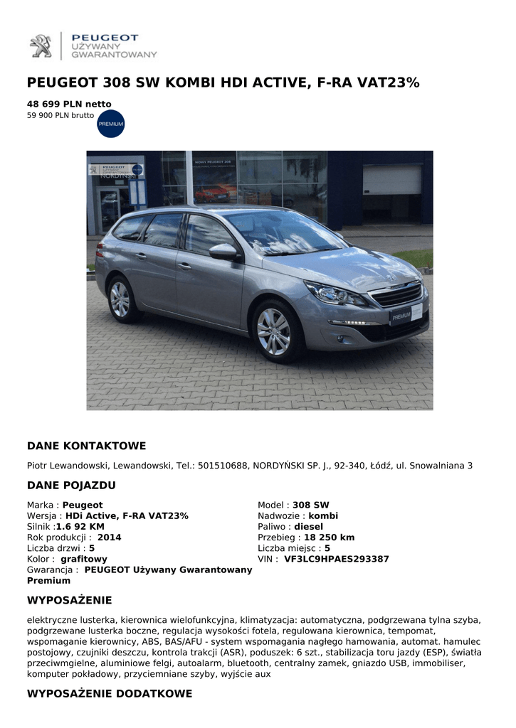 PEUGEOT 308 SW KOMBI HDI ACTIVE, F-RA VAT23% 48 699 PLN netto 59 900 PLN brutto DANE KONTAKTOWE Piotr Lewandowski, Lewandowski, Tel.: 501510688, NORDYŃSKI SP. J., 92-340, Łódź, ul. Snowalniana 3 DANE POJAZDU Marka : Peugeot Wersja : HDi Active, F-RA VAT23% Silnik :1.6 92 KM Rok produkcji : 2014 Liczba drzwi : 5 Kolor : grafitowy Gwarancja : PEUGEOT Używany Gwarantowany Premium Model : 308 SW Nadwozie : kombi Paliwo : diesel Przebieg : 18 250 km Liczba miejsc : 5 VIN : VF3LC9HPAES293387 WYPOSAŻENIE elektryczne lusterka, kierownica wielofunkcyjna, klimatyzacja: automatyczna, podgrzewana tylna szyba, podgrzewane lusterka boczne, regulacja wysokości fotela, regulowana kierownica, tempomat, wspomaganie kierownicy, ABS, BAS/AFU - system wspomagania nagłego hamowania, automat. hamulec postojowy, czujniki deszczu, kontrola trakcji (ASR), poduszek: 6 szt., stabilizacja toru jazdy (ESP), światła przeciwmgielne, aluminiowe felgi, autoalarm, bluetooth, centralny zamek, gniazdo USB, immobiliser, komputer pokładowy, przyciemniane szyby, wyjście aux WYPOSAŻENIE DODATKOWE bezwypadkowy, pierwszy właściciel, serwisowany w ASO OPIS POJAZDU Pierwszy właściciel;Bezwypadkowy;Kupiony w ASO w Polsce;Pojazd regularnie serwisowany;F-RA VAT 23% Zamek centralny z pilotem, Światła LED do jazdy dziennej, Zestaw głośnomówiący Bluetooth, Automatyczne włączanie świateł (czujnik zmierzchu), Automatyczne włączanie świateł w przypadku nagłego hamowania, Tylny podłokietnik ze schowkiem, Wycieraczka + ogrzewanie tylnej szyby, Zagłówki przednie i tylne z regulacją wysokości, Uchwyty na kubki w konsoli środkowej, Uchwyty ISOFIX do mocowania fotelika dziecięcego - tył, Zabezpieczenie tylnych drzwi przed otwarciem przez dzieci, Wspomaganie układu kierowniczego, Tylna kanapa składana, dzielona 2/3 - 1/3, Tempomat z organicznikiem prędkości, Tapicerka materiałowa, System domykania szyb podczas zamykania samochodu, Szyba przednia akustyczna, Sterowanie radiem z kierownicy, Sygnalizacja niezapiętych pasów bezpieczeństwa - przód i tył, Schowek w desce rozdzielczej przed pasażerem, zamykany, podświetlany, klimatyzowany, Przedni podłokietnik ze schowkiem, REF - system rozdziału sił hamowania, Szyby barwione, Radio CD/MP3 z funkcją Streaming Audio i kolor. dotykowym ekranem LCD 9,7 cala (wyświetlacz 7 cali), Lampki do czytania w konsoli sufitowej z przodu, Pasy bezpieczeństwa tylne (skrajne) 3-punktowe, Pasy bezpieczeństwa przednie z napinaczami i ogranicznikami napięcia, Koło zapasowe dojazdowe, Komputer pokładowy, Lakier uni, Osłony przeciwsłoneczne z podświetlanymi lusterkami, Lusterka boczne regulowane elektrycznie i ogrzewane, Lusterko wsteczne przyciemniające się automatycznie, Klimatyzacja automatyczna, dwustrefowa, Kolumna kierownicy z regulacją w dwóch płaszczyznach, Klamki zewnętrzne w kolorze nadwozia, Immobilizer, Kierunkowskazy w obudowie lusterek zewnętrznych, Kierownica skórzana, 3-ramienna, Kieszenie w oparciach foteli przednich, Elektryczna blokada otwarcia drzwi tylnych i szyb, Instalacja radiowa + 6 głośników, Hamulec postojowy manualny z funkcją Hill Assist, Fotel kierowcy z regulacją podparcia lędźwiowego, Gniazda AUX i USB, Gniazdo 12V, Felgi aluminiowe 16 Quartz z ogumieniem 205/55, Fotel pasażera z mech. regulacją wysokości, Elektryczne podnoszenie szyb, przód i tył (sterowane sekwencyjnie z blokadą przycięcia), ESP - system stabilizacji toru jazdy, Dźwignia hamulca ręcznego wykończona skórą, ABS, Fotel kierowcy z mech. regulacją wysokości, Czujnik deszczu (automatycznie włączane wycieraczki), Lakier metalik, ASR system kontroli trakcji, Światła przeciwmgielne, Alarm, pakiet, Airbag 6 sztuk: poduszki powietrzne czołowe i boczne dla kierowcy i pasażera, kurtyny powietrzne, Czujnik ciśnienia w oponach, AFU - system wspomagania hamowania Pierwszy właściciel, Bezwypadkowy, Kupiony w ASO w Polsce, Pojazd regularnie serwisowany, faktura vat 23% Samochód sprzedawany w programie PEUGEOT Używany Gwarantowany PREMIUM: Roczna Gwarancja Umowna Certyfikat Jakości Pojazdu Dekra Opieka Peugeot Assitance Specjalna Oferta Ubezpieczeniowa Specjalna Oferta Finansowania Zakupu Wymiana w 30 Dni Dowiedz się więcej na : http://www.UzywanyGwarantowany.pl QR CODE DLA OGŁOSZENIA W SERWISIE UZYWANYGWARANTOWANY.PL Powered by TCPDF (www.tcpdf.org)