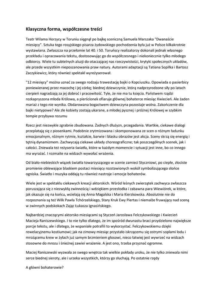 Klasyczna forma, współczesne treści Teatr Wilama Horzycy w Toruniu sięgnął po bajkę sceniczną Samuela Marszaka "Dwanaście miesięcy". Sztuka tego rosyjskiego pisarza żydowskiego pochodzenia była już w Polsce kilkakrotnie wystawiana. Zwłaszcza na przełomie lat 40. i 50. Toruńscy realizatorzy dokonali jednak własnego przekładu i opracowania tekstu, dostosowując go do współczesnego i niekoniecznie tylko młodego odbiorcy. Wiele tu subtelnych aluzji do otaczającej nas rzeczywistości, krytyki społecznych układów, ale przede wszystkim nieposzanowania praw natury. Autorami adaptacji są Tatiana Sopiłka i Bartosz Zaczykiewicz, który również spektakl wyreżyserował. "12 miesięcy" można uznać za swego rodzaju trawestację bajki o Kopciuszku. Opowiada o pasierbicy poniewieranej przez macochę i jej córkę; biednej dziewczynie, którą nadprzyrodzone siły po latach cierpień nagradzają za jej dobroć i pracowitość. Tyle, że nie ma tu księcia. Państwem rządzi rozkapryszona młoda Królowa, a pierścionek ofiaruje głównej bohaterce miesiąc Kwiecień. Ale żaden mariaż z tego nie wynika. Obdarowana bogactwem dziewczyna pozostaje wolna. Zakończenie dla bajki nietypowe? Ale złe kobiety zostają ukarane, a młodej pysznej i próżnej Królowej w szybkim tempie przybywa rozumu Rzecz jest niezwykle zgrabnie zbudowana. Żadnych dłużyzn, przegadania. Wartkie, ciekawe dialogi przeplatają się z piosenkami. Podobnie zrytmizowana i skomponowana ze scen o różnym ładunku emocjonalnym, różnym rytmie, kształcie, barwie i blasku obrazów jest akcja. Sceny skrzą się energią i tętnią dynamizmem. Zachwycają ciekawe układy choreograficzne; tak poszczególnych scenek, jak i całości. Zniewala też reżyseria światła, które w każdym momencie i sytuacji jest inne, bo co innego ma wyrażać. I rozmaite na widzach wywołać wrażenia. Od biało-niebieskich wiązek światła towarzyszącego w scenie zamieci Styczniowi, po ciepłe, złociste promienie oblewające blaskiem postaci miesięcy rozstawionych wokół symbolizującego słońce ogniska. Światło i muzyka oddają tu również nastroje i emocje bohaterów. Wiele jest w spektaklu ciekawych kreacji aktorskich. Wśród leśnych zwierzątek zachwyca zwłaszcza poruszająca się z niezwykłą zwinnością i wdziękiem przesłodka i zabawna para Wiewiórek, w które, jak okazuje się na końcu, wcielają się Anna Magalska i Maria Kierzkowska. Absolutnie nie do rozpoznania są też Wilk Pawła Tchórzelskiego, Stary Kruk Ewy Piertas i niemalże fruwający nad sceną w zwinnych podskokach Zając Łukasza Ignasińskiego. Najbardziej znaczącymi aktorsko miesiącami są Styczeń Jarosława Felczykowskiego i Kwiecień Macieja Raniszewskiego. I to nie tylko dlatego, że im spośród dwunastu braci przydzielono największe porcje tekstu, ale i dlatego, że wspaniale potrafili to wykorzystać. Felczykowskiemu dzięki rewelacyjnemu kostiumowi; jak na zimowy miesiąc przystało iskrzącemu się ostrymi soplami lodu i mrożącemu krew w żyłach już samym brzmieniem głosowi, nieco łatwiej jest wywrzeć na widzach stosowne do mrozu i śnieżnej zawiei wrażenie. A jest ono, trzeba przyznać ogromne. Maciej Raniszewski wyzwala ze swego wnętrza tak wielkie pokłady uroku, że nie tylko zniewala nimi serce biednej sieroty, ale i urzeka wszystkich, którzy go słuchają. Po ostatnie rzędy A główni bohaterowie? Wcielająca się postać Pasierbicy Julia Sobiesiak nie tylko zachwyca dziewczęcym wdziękiem, talentem wokalnym, ale też w niezwykły sposób operując ciałem, każdym ruchem oddaje to cierpienie przemarzniętej do szpiku kości, zagubionej w lesie, targanej wichrem istotki, to radość, jaka w niej rozkwita, kiedy np. dostrzega zebrane wokół ogniska miesiące. Gra nie tylko głosem, twarzą, ale też każdą cząstką ciała. Przeciwwagą dla jej postaci jest nieletnia Królowa. Też sierota, ale w innej znajdująca się sytuacji. To ona rządzi tłumem dorosłych, nawet bardzo wykształconych ludzi, wydając często absurdalne polecenia i niezbyt mądre dekrety, jak żądanie wiosennych kwiatów zimą czy dodawanie miesiącom dni. Matylda Podfilipska jest w tej roli raz rozkoszna, sympatyczna, to znów trzpiotowata, rozkapryszona i bezmyślna. Postać Królowej mieni się różnorodnością i porywa dynamiką. W trakcie przedstawienia jej postać dojrzewa, co znacząco daje się zauważyć w doborze aktorskich środków. Do ciekawie groteskowej konwencji ucieka się tu duet Macochy i jej Córki. Anna Romanowicz-Kozanecka i Mirosława Sobik oscylują nieco w kierunku groteski. Ich złe charaktery są fantastycznie przerysowane. Mirosława Sobik nienaturalnie np. obniża głos, przydając tym postaci po trosze bezwzględności a po trosze komizmu. To jedna z bardziej interesujących ról w tym spektaklu. -(Recenzja emitowana 18 grudnia 2016 na antenie Polskiego Radia Pik w "Śniadaniu z Muzami") Anita Nowak 19-12-2016