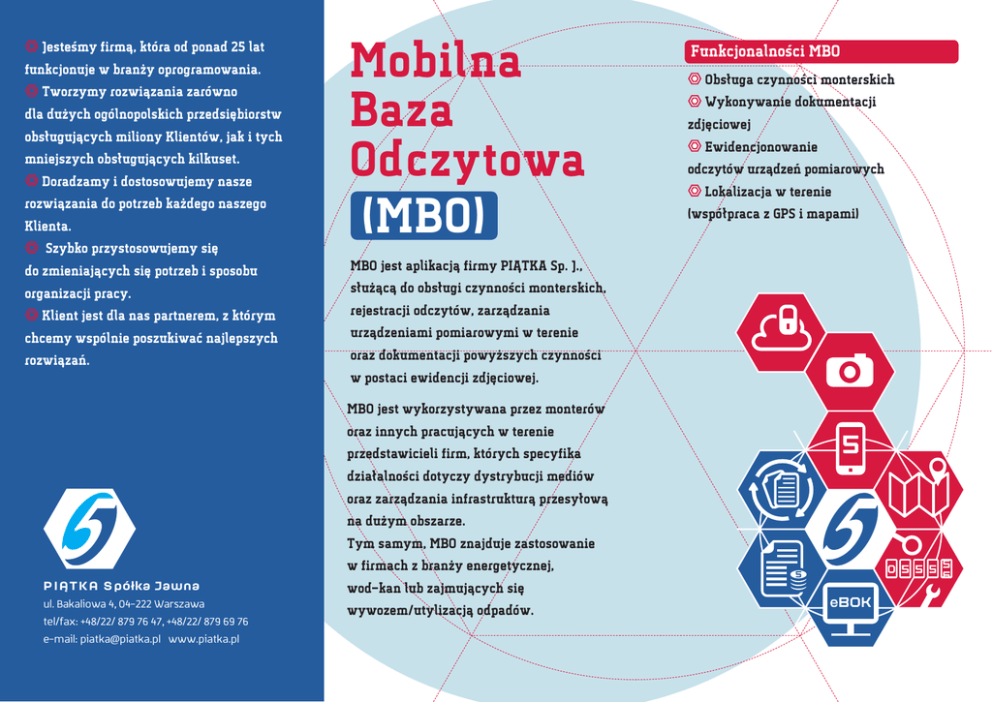 Jesteśmy firmą, która od ponad 25 lat funkcjonuje w branży oprogramowania. Tworzymy rozwiązania zarówno dla dużych ogólnopolskich przedsiębiorstw obsługujących miliony Klientów, jak i tych mniejszych obsługujących kilkuset. Doradzamy i dostosowujemy nasze rozwiązania do potrzeb każdego naszego Klienta. Szybko przystosowujemy się do zmieniających się potrzeb i sposobu organizacji pracy. Klient jest dla nas partnerem, z którym chcemy wspólnie poszukiwać najlepszych rozwiązań. Mobilna Baza Odczytowa (MBO) MBO jest aplikacją firmy PIĄTKA Sp. J., służącą do obsługi czynności monterskich, rejestracji odczytów, zarządzania urządzeniami pomiarowymi w terenie oraz dokumentacji powyższych czynności w postaci ewidencji zdjęciowej. MBO jest wykorzystywana przez monterów oraz innych pracujących w terenie przedstawicieli firm, których specyfika działalności dotyczy dystrybucji mediów oraz zarządzania infrastrukturą przesyłową na dużym obszarze. Tym samym, MBO znajduje zastosowanie w firmach z branży energetycznej, P I Ą T K A S półka Jawna ul. Bakaliowa 4, 04-222 Warszawa tel/fax: +48/22/ 879 76 47, +48/22/ 879 69 76 e-mail: [email protected] www.piatka.pl wod-kan lub zajmujących się wywozem/utylizacją odpadów. Funkcjonalności MBO Obsługa czynności monterskich Wykonywanie dokumentacji zdjęciowej Ewidencjonowanie odczytów urządzeń pomiarowych Lokalizacja w terenie (współpraca z GPS i mapami) Prostota architektury Skalowalność Współpraca z innymi systemami Aplikacja jest częścią Centralnej Bazy Odczytowej (CBO) Aplikacja charakteryzuje się rozdzieleniem interfejsu Jako część Centralnej Bazy Odczytowej, MBO stanowiącej źródło danych dla MBO. Przechowywana graficznego od serwera bazy danych, co zapewnia zachowuje z nią pełną integralność, a dane jest w chmurze, co sprawia, że nie wymaga instalacji wysoką wydajność i bezpieczeństwo danych. wprowadzone w aplikacji mobilnej są – pod warunkiem i konfiguracji. Umożliwia pracę zarówno na tabletach, Lekki, nieskomplikowany interfejs Mobilnej Bazy dostępu online – widoczne w czasie rzeczywistym. jak i smartfonach. Architektura systemu zakłada Odczytowej sprawia, że nawet gwałtowny wzrost liczby MBO poza odczytami i informacjami o wykonywanych możliwość rozwoju oraz implementacji nowych użytkowników, czy przekształcenia strukturalne firmy czynnościach monterskich zapewnia przekazywanie funkcjonalności. Dzięki temu, aplikacja może być nie stanowią dla niej problemu. dokumentacji zdjęciowej do aplikacji obsługiwanej przystosowywana do zmieniających się warunków rynkowych. Czytelny interfejs Prosty i intuicyjny interfejs pozwala na bezpośredni wybór każdej z dostępnych opcji. Dzięki temu możliwy jest szybki podgląd podstawowych danych o punkcie rozliczeniowym, zleconych czynnościach, czy też listy punktów, na których w danym dniu należy wykonać odczyt lub czynność. Użytkownik pracując w MBO w trybie online ma zapewniony wgląd do aktualnych danych o punkcie i zleconych czynnościach. w biurze.