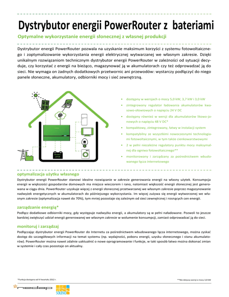 Dystrybutor energii PowerRouter z bateriami Optymalne wykorzystanie energii słonecznej z własnej produkcji Dystrybutor energii PowerRouter pozwala na uzyskanie maksimum korzyści z systemu fotowoltaicznego i zoptymalizowanie wykorzystania energii elektrycznej wytwarzanej we własnym zakresie. Dzięki unikalnym rozwiązaniom technicznym dystrybutor energii PowerRouter w zależności od sytuacji decyduje, czy korzystać z energii na bieżąco, magazynować ją w akumulatorach czy też odprowadzać ją do sieci. Nie wymaga on żadnych dodatkowych przetwornic ani przewodów: wystarczy podłączyć do niego panele słoneczne, akumulatory, odbiorniki mocy i sieć zewnętrzną. • dostępny w wersjach o mocy 5,0 kW, 3,7 kW i 3,0 kW • zintegrowany regulator ładowania akumulatorów kwasowo-ołowiowych o napięciu 24 V DC • dostępny również w wersji dla akumulatorów litowo-jonowych o napięciu 48 V DC* • kompaktowy, zintegrowany, łatwy w instalacji system • kompatybilny ze wszystkimi nowoczesnymi technologiami fotowoltaicznymi, w tym także cienkowarstwowymi • 2 w pełni niezależne regulatory punktu mocy maksymalnej dla ogniwa fotowoltaicznego** AKUMULATOR • monitorowany i zarządzany za pośrednictwem wbudowanego łącza internetowego optymalizacja użytku własnego Dystrybutor energii PowerRouter stanowi idealne rozwiązanie w zakresie generowania energii na własny użytek. Konsumpcja energii w większości gospodarstw domowych ma miejsce wieczorem i rano, natomiast większość energii słonecznej jest generowana w ciągu dnia. PowerRouter uzyskuje więcej z energii słonecznej przetwarzanej we własnym zakresie poprzez magazynowanie nadwyżek energetycznych w akumulatorach do późniejszego wykorzystania. Im więcej zużywa się energii wytworzonej we własnym zakresie (optymalizacja nawet do 70%), tym mniej pozostaje się zależnym od sieci zewnętrznej i rosnących cen energii. zarządzanie energią* Podłącz dodatkowe odbiorniki mocy, gdy występuje nadwyżka energii, a akumulatory są w pełni naładowane. Pozwoli to jeszcze bardziej zwiększyć udział energii generowanej we własnym zakresie w wolumenie konsumpcji, zamiast odprowadzać ją do sieci. monitoruj i zarządzaj Podłączając dystrybutor energii PowerRouter do Internetu za pośrednictwem wbudowanego łącza internetowego, można zyskać dostęp do szczegółowych informacji na temat systemu (np. wydajności, poboru energii, uzysku słonecznego i stanu akumulatorów). PowerRouter można nawet zdalnie uaktualnić o nowe oprogramowanie i funkcje, w taki sposób łatwo można dokonać zmian w systemie i cały czas pozostaje on aktualny. *Funkcja dostępna od IV kwartału 2012 r. **Nie dotyczy wersji o mocy 3,0 kW Specyfikacja dystrybutora energii PowerRouter z baterią kwasowo-ołowiową Wyjście prądu przemiennego PR50SB-BS/S24 PR37SB-BS/S24 PR30SB-BS/S24 Ciągła moc wyjściowa w temperaturze 40°C (moc nominalna) 5000 W (DE: 4600 W) 3700 W (DE/UK/PT: 3680 W) 3000 W Prąd wyjściowy 25 A (DE: 22 A) 16 A 13 A Współczynnik mocy (cos ϕ) 1 (DE: 0,9 indukcyjny … 0,9 pojemnościowy regulowany) Nominalne napięcie wyjściowe 230 V prądu przemiennego, 50 Hz Zakres wyjścia prądu przemiennego 180‒264 V prądu przemiennego 45‒55 Hz (ograniczony lokalnymi przepisami dot. pracy wyspowej) Napięcie wyjściowe prądu przemiennego (wyjście lokalne) 230 V AC ±2%, 50 Hz ±0,2%, czysta sinusoida <3% wskaźnika zawartości harmonicznych, pojedyncza faza Moc szczytowa (wyjście lokalne) Zabezpieczenie 2× moc nominalna, 10 s elektroniczne, z bezpiecznikami Straty w stanie gotowości ≤11W Interfejs użytkownika wyświetlacz z 4-przyciskową obsługą Łączność Ethernet RJ45, TCP/IP Czujnik jednofazowy w zestawie: do kontrolowania odprowadzanej energii i monitorowania zużycia energii Czujnik trójfazowy opcjonalny: do monitorowania zużycia energii Przekaźniki zarządzania energią przewidziane 2, normalnie otwarty/normalnie zamknięty, 250 V prądu przem., 1 A, 24 V prądu st., 5 A Panele słoneczne PR50SB-BS/S24 PR37SB-BS/S24 PR30SB-BS/S24 Wejście maksymalne 5,5 kWp i 15 A na ciąg ogniw 4 kWp i 15 A na ciąg ogniw 3,3 kWp i 15 A Liczba wejść 2 2 1 Liczba regulatorów punktu mocy maksymalnej (MPPT) Rozłącznik prądu stałego 2, w pełni niezależne 4-biegunowy, 600 V, 15 A 2, w pełni niezależne 4-biegunowy, 600 V, 15 A 1 2-biegunowy, 600 V, 15 A Napięcie w panelu słonecznym 100‒600 V prądu stałego na szereg paneli Napięcie w punkcie mocy maksymalnej 180‒480 V prądu stałego na szereg paneli Złącza paneli słonecznych MC4 Wydajność maksymalna 94% (93% EU) Maksymalna wydajność punktu mocy maksymalnej 99,9% Akumulatorkwasowo-ołowiowy(mokry/żelowy)zseparatoremzmatyszklanej PR50SB-BS/S24 PR37SB-BS/S24 PR30SB-BS/S24 Zakres napięcia akumulatora (napięcie wyjściowe) 21‒31 V prądu stałego Prąd ładowania 25‒125 A ciągły, programowalny Pojemność akumulatora 25‒200 A ciągły, 25‒155 A ciągły, programowalny programowalny min. 100 Ah, przy prądzie ładowania 25 A Krzywa ładowania Zabezpieczenie przeciwzwarciowe 3-stopniowa adaptywna z podtrzymaniem elektroniczne, przy maksymalnym prądzie ładowania, wyłączenie <1 s Kompensacja temperaturowa akumulatora włączona Czujnik napięcia akumulatora wbudowany Bocznik prądowy wbudowany Parametry środowiskowe PR50SB-BS/S24 Zakres temperatur podczas eksploatacji (pełna moc) −10°C do +50°C (przewymiarowany z 40 °C) Temperatura przechowywania −40°C do +70°C Wilgotność maximum 95%, bez kondensacji Posiadane certyfikaty i spełniane normy CE, VDE-AR-N 4105:2011-08, EEG 2012, C-Tick Bezpieczeństwo Emisja EN 60950-1, EN 62109-1, EN 60335-2-29 EN 55014-1, EN 61000-3-2, EN 61000-3-3, EN 61000-6-3 Odporność EN 55014-2, EN 61000-6-2 Zabezpieczenie przed pracą wyspową VDE 0126.1.1, G83/1(UK), RD1663/2000(ESP), DK5940 E.d. 2.2, CEI 0-21 w toku Gwarancja (IT), AS4777 (pełen przegląd dostępny pod adresem www.PowerRoute