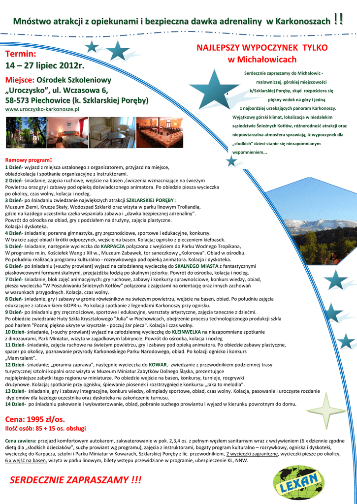 Mnóstwo atrakcji z opiekunami i bezpieczna dawka adrenaliny w Karkonoszach Termin: 14 – 27 lipiec 2012r. !! NAJLEPSZY WYPOCZYNEK TYLKO w Michałowicach Serdecznie zapraszamy do Michałowic - Miejsce: Ośrodek Szkoleniowy „Uroczysko”, ul. Wczasowa 6, 58-573 Piechowice (k. Szklarskiej Poręby) www.uroczysko-karkonosze.pl Ramowy program: malowniczej, górskiej miejscowości k/Szklarskiej Poręby, to skąd rozpościera się Opis miejscowości: Michałowice obecnie dzielnica widok na góry i jedną Piechowic. Założone piękny zostały przez protestanckich Michałów (podobno byłopanoram ich trzech), którzy z najbardziej urzekających Karkonoszy. uciekli przed prześladowaniami religijnymi. Wyjątkowy górski klimat, lokalizacja w niedalekim Obecnie jest to typowa osada turystyczna sąsiedztwie Śnieżnych Kotłów, różnorodnośd atrakcji oraz położona za lasem i górką Piechowic. niepowtarzalna atmosfera sprawiają, iż wypoczynek dla Malownicze położona z widokiem na „słodkich” dzieci stanie się niezapomnianym główny grzbiet Karkonoszy stanowi wspomnieniem... zarówno bazę wypadową jak i cel pieszych wędrówek. 1 Dzieo- wyjazd z miejsca ustalonego z organizatorem, przyjazd na miejsce, obiadokolacja i spotkanie organizacyjne z instruktorami. 2 Dzieo- śniadanie, zajęcia ruchowe, wejście na basen ,dwiczenia wzmacniające na świeżym Powietrzu oraz gry i zabawy pod opieką doświadczonego animatora. Po obiedzie piesza wycieczka po okolicy, czas wolny, kolacja i nocleg. 3 Dzieo- po śniadaniu zwiedzanie największych atrakcji SZKLARSKIEJ PORĘBY : Muzeum Ziemi, Krucze Skały, Wodospad Szklarki oraz wizyta w parku linowym Trollandia, gdzie na każdego uczestnika czeka wspaniała zabawa i „dawka bezpiecznej adrenaliny”. Powrót do ośrodka na obiad, gry z podziałem na drużyny, zajęcia plastyczne. Kolacja i dyskoteka. 4 Dzieo- śniadanie; poranna gimnastyka, gry zręcznościowe, sportowe i edukacyjne, konkursy. W trakcie zajęd obiad i krótki odpoczynek, wejście na basen. Kolacja; ognisko z pieczeniem kiełbasek. 5 Dzieo- śniadanie, następnie wycieczka do KARPACZA połączona z wejściem do Parku Wodnego Tropikana, W programie m.in. Kościołek Wang z XII w., Muzeum Zabawek, tor saneczkowy „Kolorowa”. Obiad w ośrodku. Po południu realizacja programu kulturalno - rozrywkowego pod opieką animatora. Kolacja i dyskoteka. 6 Dzieo- po śniadaniu (+suchy prowiant) wyjazd na całodzienną wycieczkę do SKALNEGO MIASTA z fantastycznymi piaskowcowymi formami skalnymi, przejażdżka łodzią po skalnym jeziorku. Powrót do ośrodka, kolacja i nocleg. 7 Dzieo- śniadanie, blok zajęd animacyjnych: gry ruchowe, zabawy i konkursy sprawnościowe, konkurs wiedzy, obiad, piesza wycieczka "W Poszukiwaniu Śnieżnych Kotłów" połączona z zajęciami na orientację oraz innych zachowao w warunkach przygodnych. Kolacja, czas wolny. 8 Dzieo- śniadanie, gry i zabawy w gronie rówieśników na świeżym powietrzu, wejście na basen, obiad. Po południu zajęcia edukacyjne z ratownikiem GOPR-u. Po kolacji spotkanie z legendami Karkonoszy przy ognisku. 9 Dzieo- po śniadaniu gry zręcznościowe, sportowe i edukacyjne, warsztaty artystyczne, zajęcia taneczne z dziedmi. Po obiedzie zwiedzanie Huty Szkła Kryształowego "Julia" w Piechowicach, obejrzenie procesu technologicznego produkcji szkła pod hasłem "Poznaj piękno ukryte w krysztale - poczuj żar pieca". Kolacja i czas wolny. 10 Dzieo- śniadanie, (+suchy prowiant) wyjazd na całodzienną wycieczkę do KLEINWELKA na niezapomniane spotkanie z dinozaurami, Park Miniatur, wizyta w zagadkowym labiryncie. Powrót do ośrodka, kolacja i nocleg 11 Dzieo- śniadanie, zajęcia ruchowe na świeżym powietrzu, gry i zabawy pod opieką animatora. Po obiedzie zabawy plastyczne, spacer po okolicy, poznawanie przyrody Karkonoskiego Parku Narodowego, obiad. Po kolacji ognisko i konkurs „Mam talent”. 12 Dzieo- śniadanie; „poranna zaprawa”, następnie wycieczka do KOWAR,- zwiedzanie z przewodnikiem podziemnej trasy turystycznej sztolni kopalni oraz wizyta w Muzeum Miniatur Zabytków Dolnego Śląska, prezentujące najpiękniejsze zabytki tego regionu w miniaturze. Po obiedzie wejście na basen, konkursy, turnieje, rozgrywki drużynowe. Kolacja; spotkanie przy ognisku, śpiewanie piosenek i rozstrzygnięcie konkursu „Jaka to melodia”. 13 Dzieo- śniadanie, gry i zabawy integracyjne, konkurs wiedzy, olimpiady sportowe, obiad, czas wolny. Kolacja, pasowanie i uroczyste rozdanie dyplomów dla każdego uczestnika oraz dyskoteka na zakooczenie turnusu. 14 Dzieo- po śniadaniu pakowanie i wykwaterowanie, obiad, pobranie suchego prowiantu i wyjazd w kierunku powrotnym do domu. Cena: 1995 zł/os. Ilośd osób: 85 + 15 os. obsługi Cena zawiera: przejazd komfortowym autokarem, zakwaterowanie w pok. 2,3,4 os. z pełnym węzłem sanitarnym wraz z wyżywieniem (6 x dziennie zgodne dietą dla „słodkich dzieciaków”, suchy prowiant wg programu), zajęcia z instruktorami, bogaty program kulturalno – rozrywkowy, ogniska i dyskoteki, wycieczkę do Karpacza, sztolni i Parku Miniatur w Kowarach, Szklarskiej Poręby z lic. przewodnikiem, 2 wycieczki zagraniczne, wycieczki piesze po okolicy, 6 x wejśd na basen, wizyta w parku linowym, bilety wstępu przewidziane w programie, ubezpieczenie KL, NNW. SERDECZNIE ZAPRASZAMY !!!