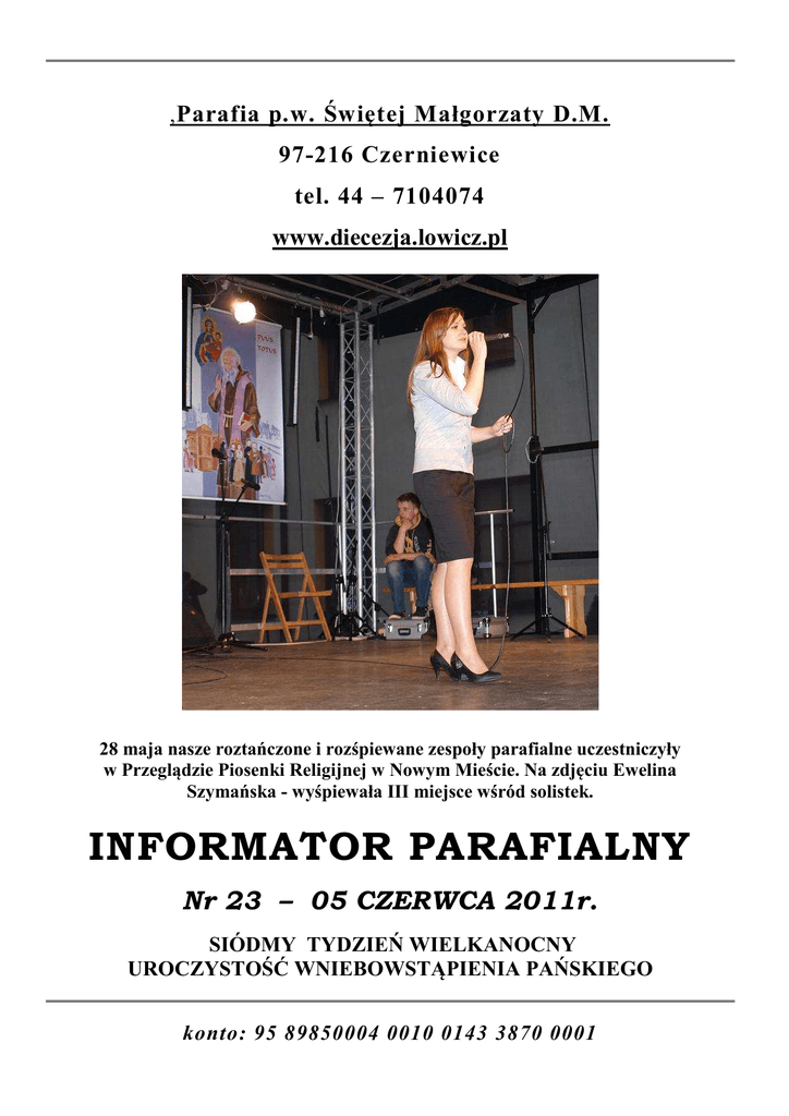 , Parafia p.w. Świętej Małgorzaty D.M. 97-216 Czerniewice tel. 44 – 7104074 www.diecezja.lowicz.pl 28 maja nasze roztańczone i rozśpiewane zespoły parafialne uczestniczyły w Przeglądzie Piosenki Religijnej w Nowym Mieście. Na zdjęciu Ewelina Szymańska - wyśpiewała III miejsce wśród solistek. INFORMATOR PARAFIALNY Nr 23 – 05 CZERWCA 2011r. SIÓDMY TYDZIEŃ WIELKANOCNY UROCZYSTOŚĆ WNIEBOWSTĄPIENIA PAŃSKIEGO konto: 95 89850004 0010 0143 3870 0001 EWANGELIA NA VII NIEDZIELĘ WIELKANOCNĄ Mt 28, 16-20 Dana Mi jest wszelka władza w niebie i na ziemi. Jedenastu uczniów udało się do Galilei na górę, tam gdzie Jezus im polecił. A gdy Go ujrzeli, oddali Mu pokłon. Niektórzy jednak wątpili. Wtedy Jezus zbliżył się do nich i przemówił tymi słowami: „Dana Mi jest wszelka władza w niebie i na ziemi. Idźcie więc i nauczajcie wszystkie narody, udzielając im chrztu w imię Ojca i Syna, i Ducha Świętego. Uczcie je zachowywać wszystko, co wam przykazałem. A oto Ja jestem z wami przez wszystkie dni, aż do skończenia świata”. ●●● We Wniebowstąpieniu najważniejsza jest cisza Cisza pełna miłości w domu Ojca i cisza pokoju w sercach które zostały na ziemi Pokój miałeś w sercu i pewność moich słów: „Ja jestem z wami po wszystkie dni, aż do skończenia świata”. Moje spojrzenie niech stanie się dla ciebie jak rosa i jasny promień słońca. Spojrzenie, w którym zawsze możesz schować się przed złym światem. Patrzę na ciebie z miłością. Wtedy tylko kochać potrafisz. Moje spojrzenie przekonuje cię, że nie mam względu na to, jak bardzo często upadasz. Kocham cię dlatego, że jesteś i że się podnosisz. I choć często zniekształcasz mój obraz w sobie, nie przestaję kochać, a nawet kocham jeszcze bardziej, bo wiem, jak bardzo potrzebujesz Mnie i mojego miłosnego spojrzenia. Patrz więc na Mnie wstępującego do nieba, powtarzając w sercu: Tylko Bóg! Patrz w niebo, bo tylko stamtąd możesz spodziewać się pomocy, i oddaj Mi pokłon. Bo jestem z tobą zawsze, aż do skończenia świata. Nie jesteś sam, gdy pragniesz głosić i wprowadzać w życie Ewangelię Miłości. Zawsze wracaj do mojego Ojca, do którego Ja idę dziś, do Jego kochanych ramion, byś dla wszystkich był znakiem – żywym i przekonującym – Jego miłosiernej Miłości. Czekam każdego dnia na twoje spojrzenie, na spotkania z tobą. Patrz w niebo, bo wtedy wiem, że ty ciągle o Mnie pamiętasz i pozwalasz, bym uważnie patrzył na twoje życie. Pamiętaj, że Ja jestem z tobą aż do skończenia świata. OGŁOSZENIA 1. Zapraszamy na Nabożeństwa Czerwcowe zaraz po Mszy św. o godz. 18.00. 2. Informuję, że w Uroczystość Zesłania Ducha Świętego, tj. 12 VI br. o g. 11.00 23 dzieci z naszej parafii będzie przeżywać I Komunię Św., a tydzień później, tj. 19 VI br. o g. 12.00 Rocznicę I Komunii Św. i Promocję Ministrancką. W związku z tym zapraszam dzieci I Komun., rodziców i chrzestnych do Sakr. Pojed w najbliższy piątek /10 VI/ od g. 16.00, a w czwartek, tj. 9 czerwca o g. 16.00, rodziców dzieci I Komun. do pomocy przy dokładnym sprzątaniu kościoła i myciu szyb. ●●● SAKRAMENTALNY ZWIĄZEK MAŁŻEŃSKI MAJĄ ZAMIAR ZAWRZEĆ: TOMASZ PIWOWARSKI, KAW. Z TOMASZOWA MAZ. I ANNA DRYŃSKA, PANNA Z PAR. TUT. MICHAŁ PRZEORSKI, KAW. Z SUCHEDNIOWA I AGNIESZKA RYBAK, PANNA Z PAR. TUT. ●●● DO WSPÓLNOTY PARAFIALNEJ PRZYJĘLIŚMY POPRZEZ SAKRAMENT CHRZTU: BARTŁOMIEJA – FLORIANA MOCZARSKIEGO – NIECH BÓG PROWADZI GO PRZEZ ŻYCIE DROGĄ WIARY, PRAWDY I MIŁOŚCI. ●●● UŚMIECHNIJ SIĘ Mosze zgubił zegarek. Biegnie więc do bożnicy i modli się: - Uczyń Panie Boże cud, abym znalazł ten zegarek, a złożę w ofierze dolara na biednych. Wychodząc z bożnicy znajduje zgubę. Wraca do bożnicy i znów się modli: - A teraz Panie Boże uczyń drugi cud, abym znalazł obiecanego dolara. Przegląd Piosenki Religijnej uświetnił zespół „Angels” … INTENCJE PONIEDZIAŁEK 06. 06. 2011 18.00 Za +Mariannę w 10 rocz. śmierci, Zdzisława i Henryka Niedźwieckich, Anny i Jana Kołodziejów oraz dziadków Niedźwieckich. WTOREK 07. 06. 2011 18.00 Za +Stanisława, Jana i Mariannę Pasików oraz Jana, Zofię, Bartłomieja i Antoninę Grzelków. ŚRODA 08. 06. 2011 18.00 Nowenna do Matki Bożej Nieustającej Pomocy. Za +Józefę i Józefa Galińskich oraz Zofię i Jana Gierachów; +Stanisławę Goleń /int. od syna z dziećmi/; +rodziców Boneckich i Leopolda oraz Wacława Błazińskiego; + Mariana Goździka /int. od siostry Ewy z rodziną/; +Jana Szczura /int. od córki Pauliny z Sebastianem/; +Franciszkę w 1 rocz. śmierci i Czesława Dulembów; +Krystynę Woźniak /int. od brata Henryka z rodziną/; +Stefana w 30 rocz. śmierci, Genowefę i Czesława Staruchów oraz Teresę Szymańską. CZWARTEK 09. 06. 2011 18.00 int. wolna PIĄTEK 10. 06. 2011 16.00 Spowiedź. 18.00 Za +Mariana w 13 rocz. śmierci, Stanisława i Tadeusza Pawlaków, dziadków Pawlaków i Haraśnych oraz Zygmunta Świderka. SOBOTA 11. 06. 2011 16.00 O Boże błogosławieństwo dla Pawła Kamińskiego z racji 18 rocz. urodzin. NIEDZIELA 12. 06. 2011 ZESŁANIE DUCHA ŚWIĘTEGO 9.00 Za zmarłych Parafian; Za +Antoniego i Annę Rutkowskich oraz Ignacego i Antoninę Żerków. 11.00 W intencji Dzieci Komunijnych. 18.00 Za +Władysława, Kamila, Ewę i Marcina Goleniów oraz Józefa, Władysława i Krzysztofa Pijanowskich. … i „Małe Aniołki”.