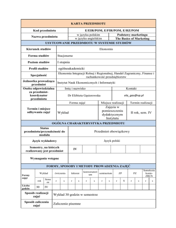 KARTA PRZEDMIOTU Kod przedmiotu E/EIR/POM, E/FIR/POM, E/HZ/POM w języku polskim Podstawy marketingu w języku angielskim The Basics of Marketing Nazwa przedmiotu USYTUOWANIE PRZEDMIOTU W SYSTEMIE STUDIÓW Kierunek studiów Ekonomia Forma studiów Stacjonarne Poziom studiów I stopnia ogólnoakademicki Profil studiów Ekonomia Integracji Rolnej i Regionalnej, Handel Zagraniczny, Finanse i rachunkowość przedsiębiorstw Specjalność Jednostka prowadząca Instytut Nauk Ekonomicznych i Informatyki przedmiot Osoba odpowiedzialna Imię i nazwisko Kontakt za przedmiotkoordynator [email protected] Dr Elżbieta Gąsiorowska przedmiotu Forma zajęć Miejsce realizacji Termin realizacji Termin i miejsce odbywania zajęć Zajęcia w pomieszczeniu dydaktycznym Instytutu Wykład II rok, sem. IV OGÓLNA CHARAKTERYSTYKA PRZEDMIOTU Status przedmiotu/przynależność do modułu Przedmiot obowiązkowy Język wykładowy Język polski Semestry, na których realizowany jest przedmiot IV Wymagania wstępne FORMY, SPOSOBY I METODY PROWADZENIA ZAJĘĆ Wykład Formy zajęć rok Liczba godzin 30 Seme str ćwiczenia r s lektorat r s konwersatori seminarium um r s IV Sposób realizacji zajęć Wykład 30 godzin w semestrze Sposób zaliczenia zajęć Zaliczenie pisemne r s ZP r Samokszta łcenieZBUN PZ S r s r s Metody dydaktyczne Przedmioty powiązane/moduł Wykład z prezentacją multimedialną, dyskusja. Mikroekonomia, Makroekonomia, Statystyka 1.Ph. Kotler, Marketing. Analiza, planowanie, wdrażanie, kontrola, wyd. Gebethner&Ska, Warszawa 2000 Podstawowa 2.E. Garbarski, I. Rutkowski, W. Wrzosek, Marketing. Punk zwrotny nowoczesnej firmy, PWE, Warszawa 2001 Wykaz literatury 1.B. Dobiegała-Korona, T. Doligalski, B. Korona, Konkurowanie o Uzupełni klienta e-marketingiem, Difin, Warszawa 2004 ająca 2.Ph. Kotler, H. Kartajaya, I. Setiwan, Marketing 3,0. Dobry produkt? Zadowolony klient? Spełniony człowiek!, wyd. MT Biznes, 2010. CELE, TREŚCI I EFEKTY KSZTAŁCENIA Cele przedmiotu (ogólne, szczegółowe) 1.Nauczyć podstawowych pojęć, mechanizmów i technik marketingowych w odniesieniu do różnych organizacji. 2.Nauczyć kreatywnego sposobu myślenia o nabywcach i ich potrzebach. 3.Zapoznać z zasadami, sposobami i technikami marketingowymi, strategiami i różnymi metodami badań oraz uwarunkowaniem tych zjawisk ze szczególnym uwzględnieniem zmieniających się warunków zarówno w otoczeniu zewnętrznym, jak i wewnętrznym organizacji. Treści programowe Efekty kształce nia (kody) W01 W02 U01 W03 U02K02 Forma zajęć Temat Suma Liczba liczby godzin godzin wykład Istota, pojęcie i funkcje marketingu 2 wykład Elementy otoczenia marketingowego wykład Podstawy decyzji marketingowych i postępowanie 2 nabywców na rynku W03U03 wykład K02 W03U03 wykład K03 2 Wybór rynku docelowego 2 Analiza konkurencji 2 U03 wykład System informacji marketingowej w przedsiębiorstwie 2 U03 wykład Badania marketingowe 2 Produkt i działania związane z produktem 3 Decyzje dotyczące opakowania i marki 3 Ceny – funkcje, kształtowanie i zmiany cen 3 W02U02 wykład K01 W02U02 wykład K01 U02K01 wykład K02K01 wykład U02 wykład Dystrybucja produktów Aktywizacja sprzedaży i marketing bezpośredni 3 2 Efekty kształcenia Student, który zaliczył przedmiot Odniesienie do efektów kształcenia w zakresie WIEDZY dla kierunku kod W01 Zna pojęcia, mechanizmy i techniki marketingowe w odniesieniu do różnych organizacji, ze szczególnym zwróceniem uwagi na organizacje rolnictwa i agrobiznesu. K_W19 W02 Kreatywnie myśli o nabywcach i przewidywać ich potrzeby i zachowania. K_W20 W03 Zna zasady, sposoby i techniki marketingowe, strategie oraz różne metody badań. K_W21 w zakresie UMIEJĘTNOŚCI U01 U02 U03 Potrafi zastosować pojęcia marketingowe oraz rozpoznać stosowane techniki marketingowe oraz dostosować je do zmieniających się warunków. Umie kreatywnie myśleć o nabywcach i przewidywać ich potrzeby i zachowania. Potrafi zastosować w praktyce znane zasady, sposoby i techniki marketingowe oraz przeprowadzić badania i umiejętnie przeanalizować ich wyniki. K_U23 K_U24 K_U25 w zakresie KOMPETENCJI K01 Potrafi współdziałać w grupie, przyjmując w niej różne role, rozwija umiejętności skutecznego porozumiewania się. K_K18 K02 Potrafi zastosować priorytety w działalności marketingowej wewnątrz organizacji oraz na zewnątrz niej. K_K19 K03 Potrafi myśleć i działać w sposób kreatywny przedsiębiorczy, rozwiązując podstawowe problemy. K_K20 i Realizacja efektów kształcenia w poszczególnych formach Metody oceny (F- formułująca, P- podsumowująca) Egzamin ustny Egzamin pisemny Projekt F Kolokwium Zadania domowe Referat/ prezentacja Sprawozdanie Dyskusje X P X Metody weryfikacji efektów kształcenia Egzamin ustny Efekty kształce nia (kody) Egzamin pisemny Projekt W01, W02 W03 U01, U02 U03 K01, K02 K03 W02 U02 U03 K01 K02 K03 Kolokwium Sprawozdanie Referat/ prezentacja Inne Punkty ECTS Forma aktywności Obciążenie studenta Liczba punktów Liczba godzin ECTS Godziny kontaktowe z nauczycielem akademickim, w tym: Forma zajęć Wykład Konsultacje przedmiotowe Łącznie liczba godzin/punktów ECTS wynikających z zajęć kontaktowych z nauczycielem akademickim 30 1,0 6 0,3 36 1,3 Godziny bez udziału nauczyciela akademickiego wynikające z nakładu pracy studenta, w tym: Przygotowanie się do egzaminu/zdawanie egzaminu Przygotowanie się do kolokwium zaliczeniowego 10 0,3 Przygotowanie raportu, projektu, prezentacji, dyskusji Sumaryczna liczba godzin/ECTS dla przedmiotu wynikająca z całego nakładu pracy studenta 5 5 0,2 0,2 20 0,7 ODSETEK GODZIN/ECTS WYNIKAJĄCYCH Z ZAJĘĆ KONTAKTOWYCH Z NAUCZYCIELEM 65% 65% Przygotowanie się do zajęć, w tym studiowanie zalecanej literatury