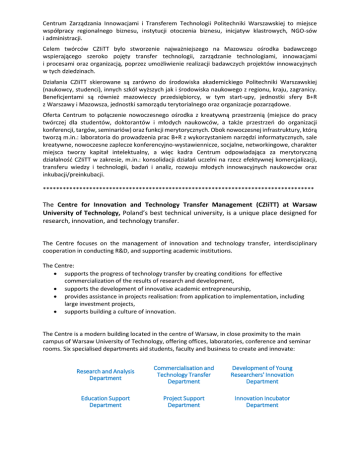 Centrum Zarządzania Innowacjami i Transferem Technologii Politechniki Warszawskiej to miejsce współpracy regionalnego biznesu, instytucji otoczenia biznesu, inicjatyw klastrowych, NGO-sów i administracji. Celem twórców CZIiTT było stworzenie najważniejszego na Mazowszu ośrodka badawczego wspierającego szeroko pojęty transfer technologii, zarządzanie technologiami, innowacjami i procesami oraz organizacją, poprzez umożliwienie realizacji badawczych projektów innowacyjnych w tych dziedzinach. Działania CZIiTT skierowane są zarówno do środowiska akademickiego Politechniki Warszawskiej (naukowcy, studenci), innych szkół wyższych jak i środowiska naukowego z regionu, kraju, zagranicy. Beneficjentami są również mazowieccy przedsiębiorcy, w tym start-upy, jednostki sfery B+R z Warszawy i Mazowsza, jednostki samorządu terytorialnego oraz organizacje pozarządowe. Oferta Centrum to połączenie nowoczesnego ośrodka z kreatywną przestrzenią (miejsce do pracy twórczej dla studentów, doktorantów i młodych naukowców, a także przestrzeń do organizacji konferencji, targów, seminariów) oraz funkcji merytorycznych. Obok nowoczesnej infrastruktury, którą tworzą m.in.: laboratoria do prowadzenia prac B+R z wykorzystaniem narzędzi informatycznych, sale kreatywne, nowoczesne zaplecze konferencyjno-wystawiennicze, socjalne, networkingowe, charakter miejsca tworzy kapitał intelektualny, a więc kadra Centrum odpowiadająca za merytoryczną działalność CZIiTT w zakresie, m.in.: konsolidacji działań uczelni na rzecz efektywnej komercjalizacji, transferu wiedzy i technologii, badań i analiz, rozwoju młodych innowacyjnych naukowców oraz inkubacji/preinkubacji. ********************************************************************************** The Centre for Innovation and Technology Transfer Management (CZIiTT) at Warsaw University of Technology, Poland’s best technical university, is a unique place designed for research, innovation, and technology transfer. The Centre focuses on the management of innovation and technology transfer, interdisciplinary cooperation in conducting R&D, and supporting academic institutions. The Centre: supports the progress of technology transfer by creating conditions for effective commercialization of the results of research and development, supports the development of innovative academic entrepreneurship, provides assistance in projects realisation: from application to implementation, including large investment projects, supports building a culture of innovation. The Centre is a modern building located in the centre of Warsaw, in close proximity to the main campus of Warsaw University of Technology, offering offices, laboratories, conference and seminar rooms. Six specialised departments aid students, faculty and business to create and innovate: Research and Analysis Department Commercialisation and Technology Transfer Department Development of Young Researchers' Innovation Department Education Support Department Project Support Department Innovation Incubator Department