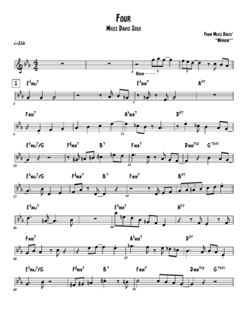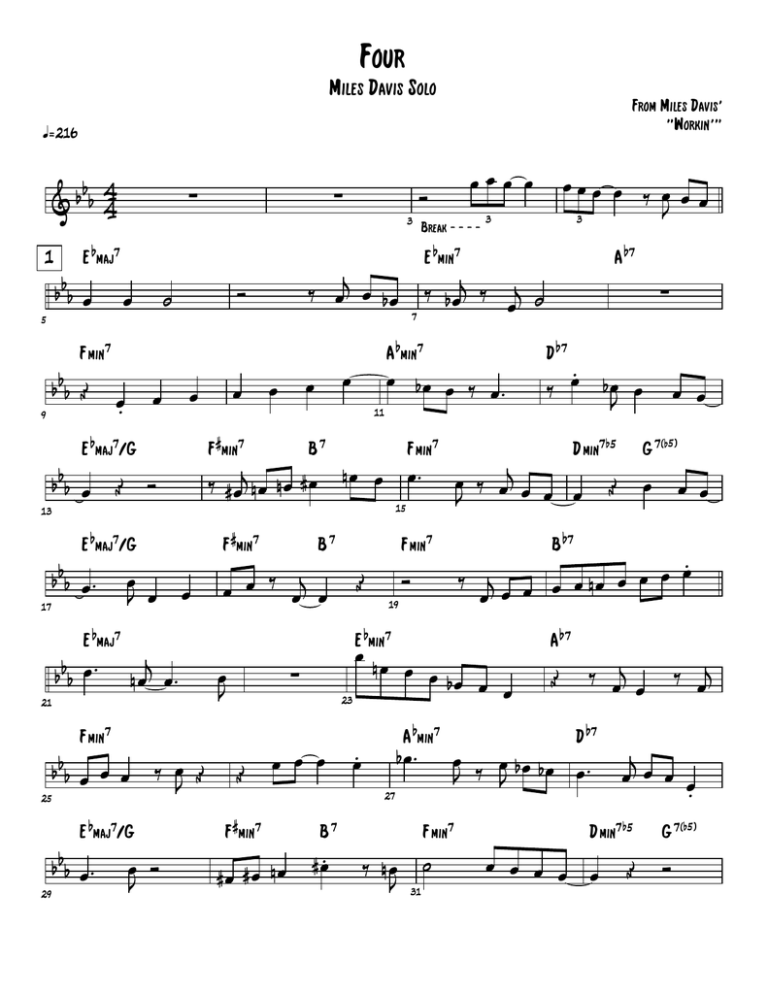 Four Miles Davis Solo From Miles Davis' "Workin'" ã216 b &bb 1 5 b 4 4 ∑ ∑ E maj7 bbb œ œ ˙ F min7 9 bbb Œ œ. œ bbb œ Œ Ó b E maj7/G 13 b œ 17 b œ J œ E maj7 21 F min7 25 bbb œ œ œ b E maj7/G 29 bbb œ . # F min7 œ ‰ œ Œ J œ Ó J B7 ‰ # œj n œ n œ # œ j nœ œ. bbb œ . # œ œ œ ‰ œj œ œ J # F min7 11 Œ œ 23 œ œ œ #œ #œ nœ b B7 # œ. 3 7 œ bœ œ ‰ œ . F min7 15 b œ. 27 ‰ nœ J 31 b7 b G 7( 5) Œ A Œ b7 œ ‰ œj œ D b7 œ ‰ œ bœ bœ œ. J J F min7 ˙ b œ œ œ œ . ‰ j œ œ œ œ nœ œ œ œ œ œ nœ œ œ bœ œ œ bœ. b7 B Ó b ∑ . œ bœ œ ‰ J D œ ‰ œj œ œ œ J œ. A min7 b7 D min7 5 F min7 19 A ‰ b œj ‰ œj ˙ E min7 ∑ Œ Break - - - - œœœ œ ‰ œ œ œ J 3 E min7 b nœ œ B7 œœœ œ A min7 œ œ F min7 E maj7/G bbb œ . œ 3 ‰ œj œ b œ Ó Ó j œ œ œ œ . b D min7 5 œ œ œ œ œ ‰ œj Œ b G 7( 5) Ó Four - Miles Davis 2 G min7 33 b &bb Œ 2 37 b œ œ. J bœ F min7 bbb ˙ 41 œ œ œ ‰ œ œ œ œ œ. b ‰ bbb œ . b ‰ Ó E maj7/G 49 53 57 bbb œ . b bbb E maj7 bbb F min7 œ ˙ b œ bœ œ. Ó 61 65 bbb # œ œ œ Œ G min7 F min7 b œ œ J D 51 F min7 B 7 ∑ œ 55 b 59 b˙ D bœ ˙ 3 B b7 œ b 67 œ œ G 7( 5) œ. œ b7 b7 Œ b œ œ ‰ œj œ œ nœ œ b˙ ‰ œj œ œ ‰ œJ ‰ œJ E maj7 b œ J b7 j œ œ bœ œ œ œ œ œ œ œ nœ œ œ œ Ó F min7 œ œ J 3 œ. 3 b7 œ bœ œ œ. ‰ B A F min7 63 œ J b ˙ A min7 3 b7 n˙. E min7 j œ œ Ó b7 D min7 5 œ œ œ œ œ œ nœ b A ∑ œ œ œ bœ bœ œ J F min7 3 œ nœ œ œ. J 47 œ œ. J # 7 39 F min7 Œ œ œ œ œ œ Œ b #˙ ∑ F min7 B œ œ ‰ œ œ œ Ó J 35 B7 ‰ œj # œ œ œ. J Ó 43 3 E maj7/G b E maj7 A min7 F min7 # b7 œ œ œ œ b œ E min œ nœ bœ œ Ó ‰ J ‰ Ó # œ œ J B F min7 B 7 œ Ó J bbb œ œ œ œœœ bœ œ. J E maj7/G 45 F min7 lay back E maj7 bbb ‰ # F min7 3 b 3 œ F min7 b 7 ( 5) G ˙ D min7 5 Œ B b7 œ œ œ œ œ œ œ œ Four - Miles Davis 3 69 73 b 7 E maj b w &bb bb b Fœmin . 7 œ J b œ. œ œ œœ J J E maj7/G 77 bbb œ œ œ œ œ b E maj7/G 81 bbb œ . b E maj7 85 F min7 89 bbb Œ b 93 bbb Ó G min7 97 101 œ bbb # # F min7 œ 3 œ F min7 83 b œ œ œ œ. ‰ nœ J b ˙ E maj7 œ b7 œ A Œ D œ nœ œ œ F min7 95 b G 7( 5) ‰ j œ nœ œ œ œ nœ œ œ œ œ 87 j œ œ œ œ œ œj b œ . 91 b7 b7 œ œ œ œ œ J œ B Ó b B ∑ b ‰ œJ ‰ œJ œ œ b œ B7 3 D min7 5 œ. Œ A min7 3 Œ œ 79 Œ D E min7 #œ nœ #œ œ Œ F min7 œ B7 F min7 Œ F min7 Œ n˙ 3 E maj7 œ. #œ œ. b b7 b œ b œ œ b œ œ ‰ œj œ œ œ œ œ bœ œ œ 75 B7 œ œ œ œ œ J œ ˙ b b b ‰ œj œ œ b # F min7 # œ œ œ œ nœ E maj7/G œ œ œ bœ bœ 3 ‰ œ n œ. n œ J #œ œ œ œ. J bbb œ . j œ Ó œ. 71 A A min7 F min7 œ Œ J 7 E min œ œ œ œ œ J œ œœ œ œ b œ œ œ ‰ œ œ J J 99 ˙ 3 b7 b7 ∑ œ œ œ b œ œ œ œ œ F min7 b G 7( 5) D min7 5 Œ B b7 Ó ‰ œJ œ œ œ œ œ œ œ
