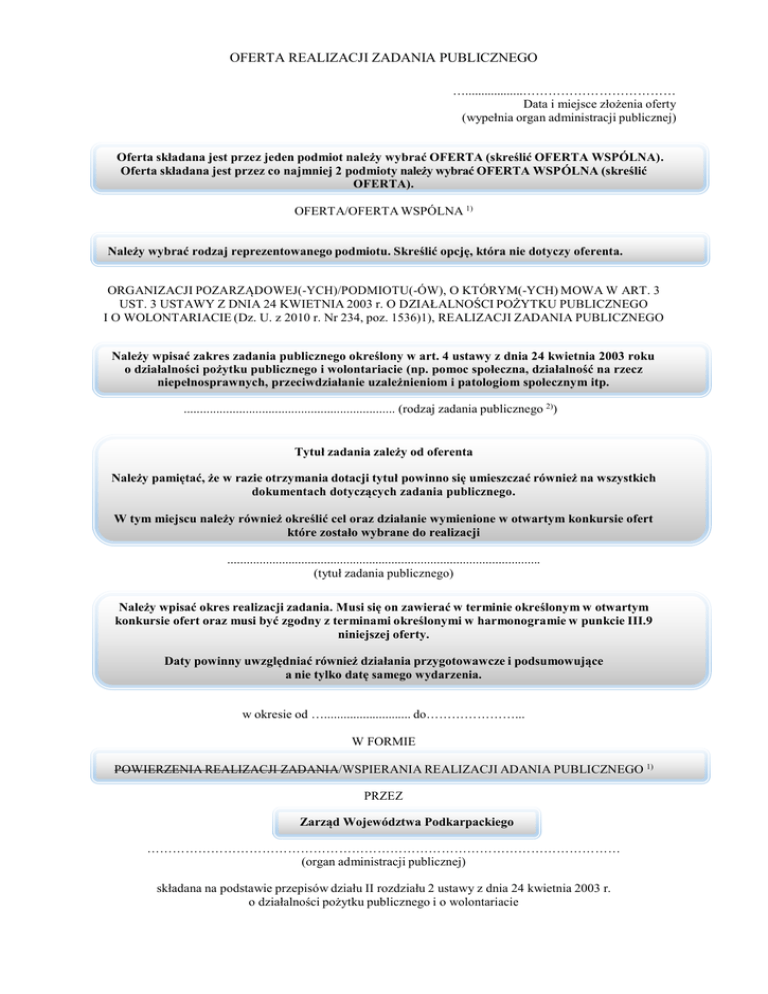 OFERTA REALIZACJI ZADANIA PUBLICZNEGO …..................……………………………… Data i miejsce złożenia oferty (wypełnia organ administracji publicznej) Oferta składana jest przez jeden podmiot należy wybrać OFERTA (skreślić OFERTA WSPÓLNA). Oferta składana jest przez co najmniej 2 podmioty należy wybrać OFERTA WSPÓLNA (skreślić OFERTA). OFERTA/OFERTA WSPÓLNA 1) Należy wybrać rodzaj reprezentowanego podmiotu. Skreślić opcję, która nie dotyczy oferenta. ORGANIZACJI POZARZĄDOWEJ(-YCH)/PODMIOTU(-ÓW), O KTÓRYM(-YCH) MOWA W ART. 3 UST. 3 USTAWY Z DNIA 24 KWIETNIA 2003 r. O DZIAŁALNOŚCI POŻYTKU PUBLICZNEGO I O WOLONTARIACIE (Dz. U. z 2010 r. Nr 234, poz. 1536)1), REALIZACJI ZADANIA PUBLICZNEGO Należy wpisać zakres zadania publicznego określony w art. 4 ustawy z dnia 24 kwietnia 2003 roku o działalności pożytku publicznego i wolontariacie (np. pomoc społeczna, działalność na rzecz niepełnosprawnych, przeciwdziałanie uzależnieniom i patologiom społecznym itp. ................................................................. (rodzaj zadania publicznego 2)) Tytuł zadania zależy od oferenta Należy pamiętać, że w razie otrzymania dotacji tytuł powinno się umieszczać również na wszystkich dokumentach dotyczących zadania publicznego. W tym miejscu należy również określić cel oraz działanie wymienione w otwartym konkursie ofert które zostało wybrane do realizacji ................................................................................................. (tytuł zadania publicznego) Należy wpisać okres realizacji zadania. Musi się on zawierać w terminie określonym w otwartym konkursie ofert oraz musi być zgodny z terminami określonymi w harmonogramie w punkcie III.9 niniejszej oferty. Daty powinny uwzględniać również działania przygotowawcze i podsumowujące a nie tylko datę samego wydarzenia. w okresie od …........................... do…………………... W FORMIE POWIERZENIA REALIZACJI ZADANIA/WSPIERANIA REALIZACJI ADANIA PUBLICZNEGO 1) PRZEZ Zarząd Województwa Podkarpackiego ………………………………………………………………………………………………… (organ administracji publicznej) składana na podstawie przepisów działu II rozdziału 2 ustawy z dnia 24 kwietnia 2003 r. o działalności pożytku publicznego i o wolontariacie I. Dane oferenta/oferentów 1) 3) , Jeżeli oferta składana jest przez jeden podmiot wybierz „oferenta” (skreśl „oferentów”). Jeżeli oferta składana jest przez co najmniej 2 podmioty wybierz „oferentów” (skreśl „oferenta”). 1) nazwa: Należy podać pełną nazwę reprezentowanego podmiotu. 2) forma stowarzyszenia Należy wybrać formę prawną ( ) stowarzyszenie ( ) kościelna osoba prawna ( ) spółdzielnia socjalna ( ) fundacja ( ) kościelna jednostka organizacyjna ( ) inna 3) numer w Krajowym Rejestrze Sądowym , w innym rejestrze lub ewidencji: : 5) Należy podać numer i nazwę rejestru do którego wpisany jest podmiot 4) data wpisu, rejestracji lub utworzenia: 6) Należy podać datę powstania organizacji wskazaną w dokumencie rejestrowym 5) nr NIP: .............................................................. nr REGON: ............................ ........................................... 6) adres miejscowość: .................................................................... ul.: ...................................... ............................... dzielnica lub inna jednostka pomocnicza: 7) …....................................................………………………… gmina: ............................................................................ powiat: 8) ............................................................. województwo: ......................................................................... kod pocztowy: …………..........…… poczta: ………............................................. . 7) tel.: .................................................................................... faks: ....................................................... e-mail: ..................................................................... http:// .................................................................. 8) numer rachunku bankowego: …………………………….................................................................. nazwa banku: …………………………............................................................................................... 9) nazwiska i imiona osób upoważnionych do reprezentowania oferenta/oferentów 1): Należy wymienić osoby upoważnione do reprezentacji podmiotu wykazane w KRS lub innym właściwym rejestrze lub które posiadają stosowne upoważnienia (pamiętaj, że upoważnienie należy dołączyć do wniosku). 10) nazwa, adres i telefon kontaktowy jednostki organizacyjnej bezpośrednio wykonującej zadanie, o którym mowa w ofercie: 9) Należy wypełnić tylko w sytuacji, kiedy oferta składana jest przez oddział główny organizacji, a zadanie realizowane będzie przez jej jednostkę, nie posiadającą osobowości prawnej. W przeciwnym wypadku należy wpisać - nie dotyczy. 11) osoba upoważniona do składania wyjaśnień dotyczących oferty (imię i nazwisko oraz nr telefonu kontaktowego) Należy wpisać dane osoby, która wie najwięcej o zadaniu. Najlepiej tej, która przygotowywała ofertę lub docelowo będzie realizowała zadanie i jest w stanie złożyć dodatkowe wyjaśnienia związane z jego realizacją. 12) przedmiot działalności pożytku publicznego: a) działalność nieodpłatna pożytku publicznego Należy wskazać działania, za które podmiot nie pobiera wynagrodzenia – zgodnie z zapisami statutu (skopiować zapisy znajdujące się najczęściej w dziale „Cele i sposób ich realizacji”). b) działalność odpłatna pożytku publicznego Należy wskazać działania, za które podmiot pobiera wynagrod