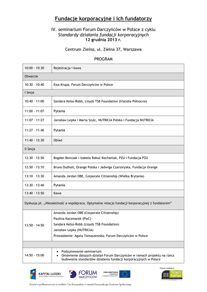Fundacje korporacyjne i ich fundatorzy IV. seminarium Forum Darczyńców w Polsce z cyklu Standardy działania fundacji korporacyjnych 12 grudnia 2013 r. Centrum Zielna, ul. Zielna 37, Warszawa PROGRAM 10:00 - 10:30 Rejestracja i kawa Otwarcie 10:30 – 10:40 Ewa Krupa, Forum Darczyńców w Polsce I Sesja 10:40 – 11:00 Sandara Kelso-Robb, Lloyds TSB Foundation (Irlandia Północna) 11:00 – 11:07 Pytania 11:07 – 11:27 Jarosław Lepka i Marta Szulc, NUTRICIA Polska i Fundacja NUTRICIA 11:27 – 11:40 Pytania 11:40 - 12:30 Obiad II Sesja 12:30 – 12:50 Bogdan Benczak i Izabela Rakuć-Kochaniak, PZU i Fundacja PZU 12:50 – 13:10 Bruno Duthoit, Orange Polska i Jadwiga Czartoryska, Fundacja Orange 13:10 – 13:30 Amanda Jordan OBE, Corporate Citizenship (Wielka Brytania) 13:30 – 13:40 Pytania 13:40 - 13:50 Kawa Dyskusja pt. „Niezależność a współpraca. Optymalne relacje fundacji korporacyjnej z fundatorem” Amanda Jordan OBE (Corporate Citizenship) Paulina Kaczmarek (PwC) 13:50 – 14:50 Sandara Kelso-Robb (Lloyds TSB Foundation) Jarosław Lepka (NUTRICIA) Prowadzenie: Agata Tomaszewska, Forum Darczyńców w Polsce 14:50 - 15:00 Podsumowanie seminarium Omówienie dalszych działań Forum Darczyńców w ramach projektu na rzecz budowania standardów działania fundacji korporacyjnych w Polsce Patron medialny: