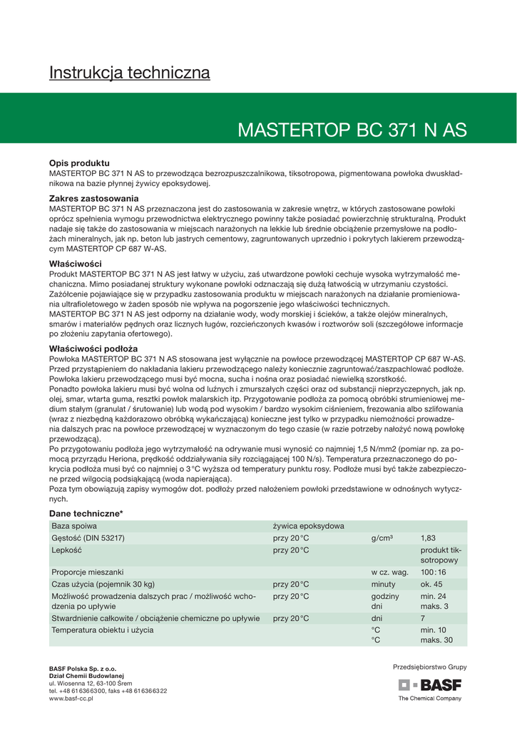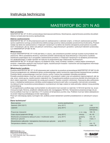 Instrukcja techniczna MASTERTOP BC 371 N AS Opis produktu MASTERTOP BC 371 N AS to przewodząca bezrozpuszczalnikowa, tiksotropowa, pigmentowana powłoka dwuskładnikowa na bazie płynnej żywicy epoksydowej. Zakres zastosowania MASTERTOP BC 371 N AS przeznaczona jest do zastosowania w zakresie wnętrz, w których zastosowane powłoki oprócz spełnienia wymogu przewodnictwa elektrycznego powinny także posiadać powierzchnię strukturalną. Produkt nadaje się także do zastosowania w miejscach narażonych na lekkie lub średnie obciążenie przemysłowe na podłożach mineralnych, jak np. beton lub jastrych cementowy, zagruntowanych uprzednio i pokrytych lakierem przewodzącym MASTERTOP CP 687 W-AS. Właściwości Produkt MASTERTOP BC 371 N AS jest łatwy w użyciu, zaś utwardzone powłoki cechuje wysoka wytrzymałość mechaniczna. Mimo posiadanej struktury wykonane powłoki odznaczają się dużą łatwością w utrzymaniu czystości. Zażółcenie pojawiające się w przypadku zastosowania produktu w miejscach narażonych na działanie promieniowania ultrafioletowego w żaden sposób nie wpływa na pogorszenie jego właściwości technicznych. MASTERTOP BC 371 N AS jest odporny na działanie wody, wody morskiej i ścieków, a także olejów mineralnych, smarów i materiałów pędnych oraz licznych ługów, rozcieńczonych kwasów i roztworów soli (szczegółowe informacje po złożeniu zapytania ofertowego). Właściwości podłoża Powłoka MASTERTOP BC 371 N AS stosowana jest wyłącznie na powłoce przewodzącej MASTERTOP CP 687 W-AS. Przed przystąpieniem do nakładania lakieru przewodzącego należy koniecznie zagruntować/zaszpachlować podłoże. Powłoka lakieru przewodzącego musi być mocna, sucha i nośna oraz posiadać niewielką szorstkość. Ponadto powłoka lakieru musi być wolna od luźnych i zmurszałych części oraz od substancji nieprzyczepnych, jak np. olej, smar, wtarta guma, resztki powłok malarskich itp. Przygotowanie podłoża za pomocą obróbki strumieniowej medium stałym (granulat / śrutowanie) lub wodą pod wysokim / bardzo wysokim ciśnieniem, frezowania albo szlifowania (wraz z niezbędną każdorazowo obróbką wykańczającą) konieczne jest tylko w przypadku niemożności prowadzenia dalszych prac na powłoce przewodzącej w wyznaczonym do tego czasie (w razie potrzeby nałożyć nową powłokę przewodzącą). Po przygotowaniu podłoża jego wytrzymałość na odrywanie musi wynosić co najmniej 1,5 N/mm2 (pomiar np. za pomocą przyrządu Heriona, prędkość oddziaływania siły rozciągającej 100 N/s). Temperatura przeznaczonego do pokrycia podłoża musi być co najmniej o 3 °C wyższa od temperatury punktu rosy. Podłoże musi być także zabezpieczone przed wilgocią podsiąkającą (woda napierająca). Poza tym obowiązują zapisy wymogów dot. podłoży przed nałożeniem powłoki przedstawione w odnośnych wytycznych. Dane techniczne* Baza spoiwa żywica epoksydowa Gęstość (DIN 53217) przy 20 °C Lepkość przy 20 °C Proporcje mieszanki g/cm³ 1,83 produkt tiksotropowy w cz. wag. 100 : 16 Czas użycia (pojemnik 30 kg) przy 20 °C minuty ok. 45 Możliwość prowadzenia dalszych prac / możliwość wchodzenia po upływie przy 20 °C godziny dni min. 24 maks. 3 Stwardnienie całkowite / obciążenie chemiczne po upływie przy 20 °C Temperatura obiektu i użycia BASF Polska Sp. z o.o. Dział Chemii Budowlanej ul. Wiosenna 12, 63-100 Śrem tel. +48 61 636 63 00, faks +48 61 636 63 22 www.basf-cc.pl dni 7 °C °C min. 10 maks. 30 Przedsiębiorstwo Grupy MASTERTOP BC 371 N AS Maksymalna dopuszczalna względna wilgotność powietrza % Odcienie barw (ok.) RAL 7032, 7030, 7023, 6011, 1001, 5024 Informacja na temat innych odcieni barw po złożeniu zapytania ofertowego % 75 Wielkość opakowania (standardowa) pojemnik Grubość powłoki i zużycie patrz przykłady zastosowania Czyszczenie narzędzi za pomocą oczyszczacza Reiniger 44 Oznakowanie zagrożeń patrz aktualna Karta bezpieczeństwa Po stwardnieniu Twardość D wg Shore’a Oporność upływowa po 28 dniach wg DIN EN 1081 kg V 30 80 104 - 106 * Dane te są wartościami orientacyjnymi i nie stanowią podstawy do sporządzenia specyfikacji Wskazówki dotyczące użycia MASTERTOP BC 371 N AS dostarczany jest z zachowaniem dokładnie dobranych proporcji składnika A (żywica) oraz składnika B (utwardzacz). Podczas mieszania składników należy przestrzegać następujących zaleceń: Najpierw należy wlać składnik B (utwardzacz) do pojemnika ze składnikiem A (żywica). Należy przy tym zwrócić uwagę, by opakowania składnika B zostało całkowicie opróżnione. W celu osiągnięcia jednolitej konsystencji oraz intensywnego wymieszania należy bardzo dokładnie wymieszać oba składniki przy użyciu mieszadła wolnoobrotowego z prędkością ok. 300 obr./min. Należy zadbać o dokładne wymieszanie materiału przy ściankach oraz dnie pojemnika. Mieszać składniki do uzyskania jednolitej masy bez smug, nie krócej jednak niż przez 3 minuty. Nie nakładać materiału z pojemnika, w którym został dostarczony! Po gruntownym wymieszaniu przelać masę do drugiego, czystego naczynia zarobowego i ponownie mieszać przez ok. 1 minutę. Temperatura obydwóch składników podczas mieszania winna wynosić 15 - 25 °C. Po wymieszaniu materiał nakładany jest na przygotowane podłoże za pomocą gumowej rakli zębatej. Wielkość zębów należy dobrać odpowiednio do żądanej grubości powłoki. Następnie przeprowadzić równomierne strukturowanie nałożonej powłoki w jednym kierunku za pomocą wałka strukturalnego. Czas użycia żywic reaktywnych zależy, oprócz temperatury otoczenia, przede wszystkim od temperatury podłoża. W niskich temperaturach reakcje chemiczne ulegają zasadniczo spowolnieniu; tym samym wydłuża się czas użycia oraz czas uzyskania stanu utwardzenia umożliwiającego prowadzenie dalszych prac i chodzenie po warstwie powłoki. Równocześnie zwięks