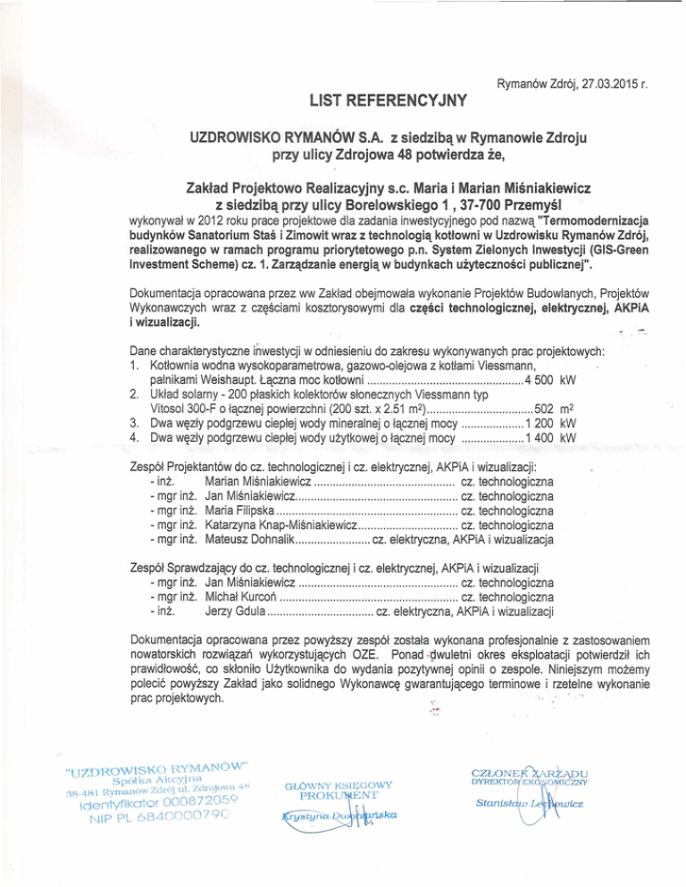 LIST REFERENCYJNY Rymanów Zdrój, 27.03.2015 r. UZDROWISKO RYMANÓW S.A. z siedzibą w Rymanowie Zdroju przy ulicy Zdrojowa 48 potwierdza że, Zakład Projektowo Realizacyjny s.c. Maria i Marian Miśniakiewicz z siedzibą przy ulicy Borelowskiego 1, 37-700 Przemyśl wykonywał w 2012 roku prace projektowe dla zadania inwestycyjnego pod nazwą "Termomodernizacja budynków Sanatorium Staś i Zimowit wraz z technologią kotłowni w Uzdrowisku Rymanów Zdrój, realizowanego w ramach programu priorytetowego p.n. System Zielonych Inwestycji (GIS-Green Im/estment Scheme) cz. 1. Zarządzanie energią w budynkach użyteczności publicznej". Dokumentacja opracowana przez ww Zakład obejmowała wykonanie Projektów Budowlanych, Projektów Wykonawczych wraz z częściami kosztorysowymi dla części technologicznej, elektrycznej, AKPiA i wizualizacji. Dane charakterystyczne inwestycji w odniesieniu do zakresu wykonywanych prac projektowych: 1. Kotłownia wodna wysokoparametrowa, gazowo-olejowa z kotłami Viessmann, palnikami Weishaupt. Łączna moc kotłowni....................................................4 500 kW 2. Układ solarny - 200 płaskich kolektorów słonecznych Viessmann typ Vitosol 300-F o łącznej powierzchni (200 szt. x 2.51 m2) ...................................502 m2 3. Dwa węzły podgrzewu ciepłej wody mineralnej o łącznej m ocy....................1 200 kW 4. Dwa węzły podgrzewu ciepłej wody użytkowej o łącznej m o c y ....................1 400 kW Zespół Projektantów do cz. technologicznej i cz. elektrycznej, AKPiA i wizualizacji: - inż. Marian Miśniakiewicz.............................................. cz. technologiczna - mgr inż. Jan Miśniakiewicz......................................................cz. technologiczna - mgr inż. Maria Filipska............................................................cz. technologiczna - mgr inż. Katarzyna Knap-Miśniakiewicz.................................cz. technologiczna - mgr inż. Mateusz Dohnalik........................ cz. elektryczna, AKPiA i wizualizacja Zespół Sprawdzający do cz. technologicznej i cz. elektrycznej, AKPiA i wizualizacji - mgr inż. Jan Miśniakiewicz.....................................................cz. technologiczna - mgr inż. Michał Kurcoń........................................................... cz. technologiczna - inż. Jerzy Gdula...................................cz. elektryczna, AKPiA i wizualizacji Dokumentacja opracowana przez powyższy zespół została wykonana profesjonalnie z zastosowaniem nowatorskich rozwiązań wykorzystujących OZE. Ponad dwuletni okres eksploatacji potwierdził ich prawidłowość, co skłoniło Użytkownika do wydania pozytywnej opinii o zespole. Niniejszym możemy polecić powyższy Zakład jako solidnego Wykonawcę gwarantującego terminowe i rzetelne wykonanie prac projektowych. .. . " GŁÓW NY KSIĘGOW Y