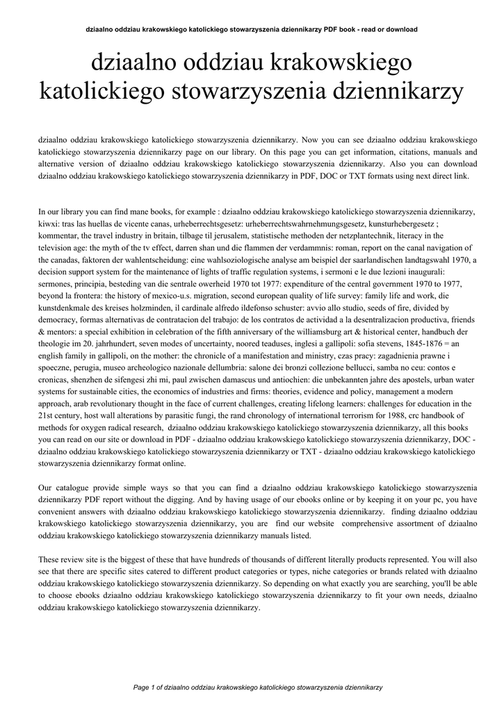 dziaalno oddziau krakowskiego katolickiego stowarzyszenia dziennikarzy PDF book - read or download dziaalno oddziau krakowskiego katolickiego stowarzyszenia dziennikarzy dziaalno oddziau krakowskiego katolickiego stowarzyszenia dziennikarzy. Now you can see dziaalno oddziau krakowskiego katolickiego stowarzyszenia dziennikarzy page on our library. On this page you can get information, citations, manuals and alternative version of dziaalno oddziau krakowskiego katolickiego stowarzyszenia dziennikarzy. Also you can download dziaalno oddziau krakowskiego katolickiego stowarzyszenia dziennikarzy in PDF, DOC or TXT formats using next direct link. In our library you can find mane books, for example : dziaalno oddziau krakowskiego katolickiego stowarzyszenia dziennikarzy, kiwxi: tras las huellas de vicente canas, urheberrechtsgesetz: urheberrechtswahrnehmungsgesetz, kunsturhebergesetz ; kommentar, the travel industry in britain, tilbage til jerusalem, statistische methoden der netzplantechnik, literacy in the television age: the myth of the tv effect, darren shan und die flammen der verdammnis: roman, report on the canal navigation of the canadas, faktoren der wahlentscheidung: eine wahlsoziologische analyse am beispiel der saarlandischen landtagswahl 1970, a decision support system for the maintenance of lights of traffic regulation systems, i sermoni e le due lezioni inaugurali: sermones, principia, besteding van die sentrale owerheid 1970 tot 1977: expenditure of the central government 1970 to 1977, beyond la frontera: the history of mexico-u.s. migration, second european quality of life survey: family life and work, die kunstdenkmale des kreises holzminden, il cardinale alfredo ildefonso schuster: avvio allo studio, seeds of fire, divided by democracy, formas alternativas de contratacion del trabajo: de los contratos de actividad a la desentralizacion productiva, friends & mentors: a special exhibition in celebration of the fifth anniversary of the williamsburg art & historical center, handbuch der theologie im 20. jahrhundert, seven modes of uncertainty, noored teaduses, inglesi a gallipoli: sofia stevens, 1845-1876 = an english family in gallipoli, on the mother: the chronicle of a manifestation and ministry, czas pracy: zagadnienia prawne i spoeczne, perugia, museo archeologico nazionale dellumbria: salone dei bronzi collezione bellucci, samba no ceu: contos e cronicas, shenzhen de sifengesi zhi mi, paul zwischen damascus und antiochien: die unbekannten jahre des apostels, urban water systems for sustainable cities, the economics of industries and firms: theories, evidence and policy, management a modern approach, arab revolutionary thought in the face of current challenges, creating lifelong learners: challenges for education in the 21st century, host wall alterations by parasitic fungi, the rand chronology of international terrorism for 1988, crc handbook of methods for oxygen radical research, dziaalno oddziau krakowskiego katolickiego stowarzyszenia dziennikarzy, all this books you can read on our site or download in PDF - dziaalno oddziau krakowskiego katolickiego stowarzyszenia dziennikarzy, DOC dziaalno oddziau krakowskiego katolickiego stowarzyszenia dziennikarzy or TXT - dziaalno oddziau krakowskiego katolickiego stowarzyszenia dziennikarzy format online. Our catalogue provide simple ways so that you can find a dziaalno oddziau krakowskiego katolickiego stowarzyszenia dziennikarzy PDF report without the digging. And by having usage of our ebooks online or by keeping it on your pc, you have convenient answers with dziaalno oddziau krakowskiego katolickiego stowarzyszenia dziennikarzy. finding dziaalno oddziau krakowskiego katolickiego stowarzyszenia dziennikarzy, you are find our website comprehensive assortment of dziaalno oddziau krakowskiego katolickiego stowarzyszenia dziennikarzy manuals listed. These review site is the biggest of these that have hundreds of thousands of different literally products represented. You will also see that there are specific sites catered to different product categories or types, niche categories or brands related with dziaalno oddziau krakowskiego katolickiego stowarzyszenia dziennikarzy. So depending on what exactly you are searching, you'll be able to choose ebooks dziaalno oddziau krakowskiego katolickiego stowarzyszenia dziennikarzy to fit your own needs, dziaalno oddziau krakowskiego katolickiego stowarzyszenia dziennikarzy. Page 1 of dziaalno oddziau krakowskiego katolickiego stowarzyszenia dziennikarzy