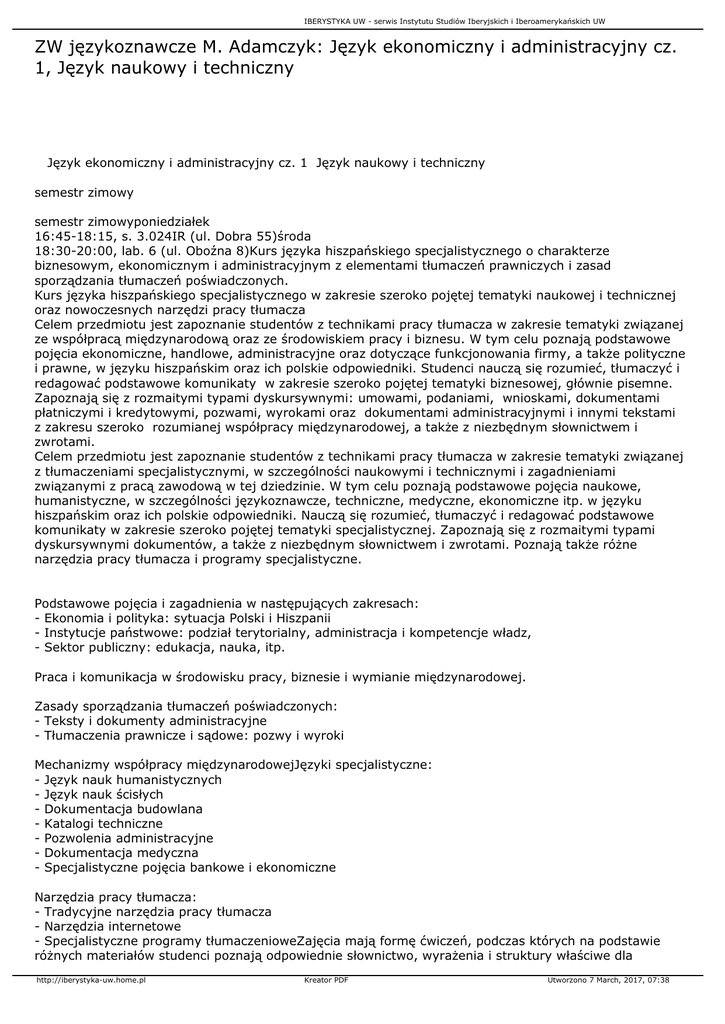 IBERYSTYKA UW - serwis Instytutu Studiów Iberyjskich i Iberoamerykańskich UW ZW językoznawcze M. Adamczyk: Język ekonomiczny i administracyjny cz. 1, Język naukowy i techniczny Język ekonomiczny i administracyjny cz. 1 Język naukowy i techniczny semestr zimowy semestr zimowyponiedziałek 16:45-18:15, s. 3.024IR (ul. Dobra 55)środa 18:30-20:00, lab. 6 (ul. Oboźna 8)Kurs języka hiszpańskiego specjalistycznego o charakterze biznesowym, ekonomicznym i administracyjnym z elementami tłumaczeń prawniczych i zasad sporządzania tłumaczeń poświadczonych. Kurs języka hiszpańskiego specjalistycznego w zakresie szeroko pojętej tematyki naukowej i technicznej oraz nowoczesnych narzędzi pracy tłumacza Celem przedmiotu jest zapoznanie studentów z technikami pracy tłumacza w zakresie tematyki związanej ze współpracą międzynarodową oraz ze środowiskiem pracy i biznesu. W tym celu poznają podstawowe pojęcia ekonomiczne, handlowe, administracyjne oraz dotyczące funkcjonowania firmy, a także polityczne i prawne, w języku hiszpańskim oraz ich polskie odpowiedniki. Studenci nauczą się rozumieć, tłumaczyć i redagować podstawowe komunikaty w zakresie szeroko pojętej tematyki biznesowej, głównie pisemne. Zapoznają się z rozmaitymi typami dyskursywnymi: umowami, podaniami, wnioskami, dokumentami płatniczymi i kredytowymi, pozwami, wyrokami oraz dokumentami administracyjnymi i innymi tekstami z zakresu szeroko rozumianej współpracy międzynarodowej, a także z niezbędnym słownictwem i zwrotami. Celem przedmiotu jest zapoznanie studentów z technikami pracy tłumacza w zakresie tematyki związanej z tłumaczeniami specjalistycznymi, w szczególności naukowymi i technicznymi i zagadnieniami związanymi z pracą zawodową w tej dziedzinie. W tym celu poznają podstawowe pojęcia naukowe, humanistyczne, w szczególności językoznawcze, techniczne, medyczne, ekonomiczne itp. w języku hiszpańskim oraz ich polskie odpowiedniki. Nauczą się rozumieć, tłumaczyć i redagować podstawowe komunikaty w zakresie szeroko pojętej tematyki specjalistycznej. Zapoznają się z rozmaitymi typami dyskursywnymi dokumentów, a także z niezbędnym słownictwem i zwrotami. Poznają także różne narzędzia pracy tłumacza i programy specjalistyczne. Podstawowe pojęcia i zagadnienia w następujących zakresach: - Ekonomia i polityka: sytuacja Polski i Hiszpanii - Instytucje państwowe: podział terytorialny, administracja i kompetencje władz, - Sektor publiczny: edukacja, nauka, itp. Praca i komunikacja w środowisku pracy, biznesie i wymianie międzynarodowej. Zasady sporządzania tłumaczeń poświadczonych: - Teksty i dokumenty administracyjne - Tłumaczenia prawnicze i sądowe: pozwy i wyroki Mechanizmy współpracy międzynarodowejJęzyki specjalistyczne: - Język nauk humanistycznych - Język nauk ścisłych - Dokumentacja budowlana - Katalogi techniczne - Pozwolenia administracyjne - Dokumentacja medyczna - Specjalistyczne pojęcia bankowe i ekonomiczne Narzędzia pracy tłumacza: - Tradycyjne narzędzia pracy tłumacza - Narzędzia internetowe - Specjalistyczne programy tłumaczenioweZajęcia mają formę ćwiczeń, podczas których na podstawie różnych materiałów studenci poznają odpowiednie słownictwo, wyrażenia i struktury właściwe dla http://iberystyka-uw.home.pl Kreator PDF Utworzono 7 March, 2017, 07:38 IBERYSTYKA UW - serwis Instytutu Studiów Iberyjskich i Iberoamerykańskich UW każdego typu omawianych dokumentów oraz zapoznają się z warsztatem pracy tłumacza. Praktyki tłumaczeniowe realizują indywidualnie w domu oraz pracują wspólnie na zajęciach. Samodzielnie szukają informacji i słownictwa uzupełniającego. Oceniani są na podstawie na bieżąco realizowanych praktyk tłumaczeniowych, a także testu końcowego sprawdzającego nabyte umiejętności, tj. znajomość słownictwa i poprawnej redakcji tekstu tłumaczenia różnych typów dokumentów. Język ekonomiczny i administracyjny cz. 1 Język kontaktów międzynarodowych semestr letni semestr letni [email protected] http://iberystyka-uw.home.pl Kreator PDF Utworzono 7 March, 2017, 07:38