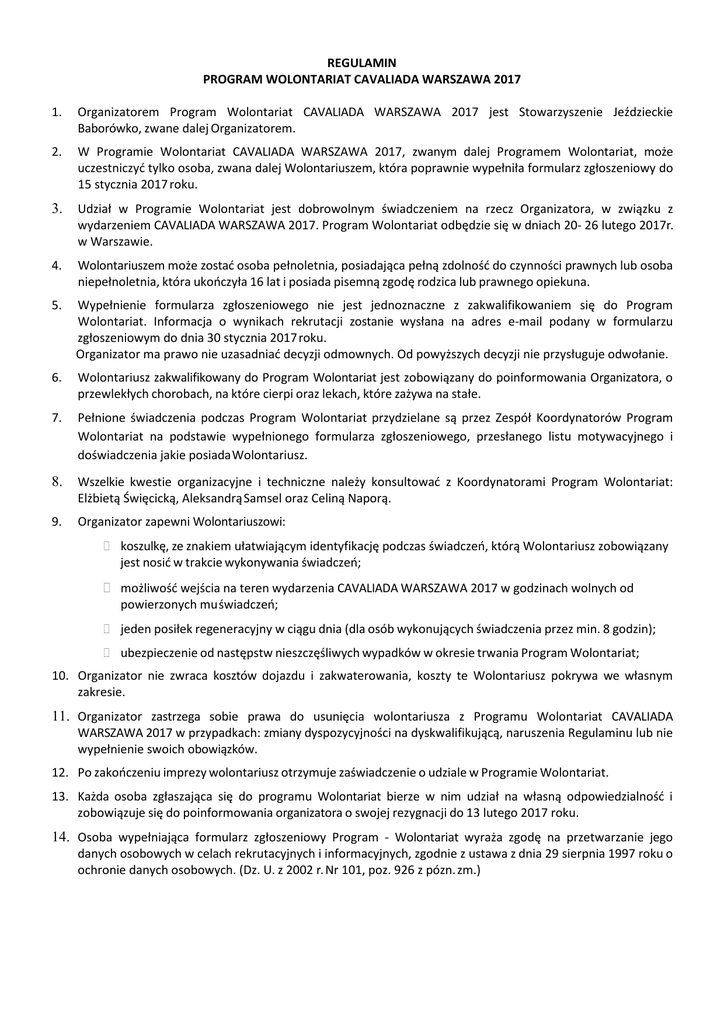 REGULAMIN PROGRAM WOLONTARIAT CAVALIADA WARSZAWA 2017 1. Organizatorem Program Wolontariat CAVALIADA WARSZAWA 2017 jest Stowarzyszenie Jeździeckie Baborówko, zwane dalej Organizatorem. 2. W Programie Wolontariat CAVALIADA WARSZAWA 2017, zwanym dalej Programem Wolontariat, może uczestniczyć tylko osoba, zwana dalej Wolontariuszem, która poprawnie wypełniła formularz zgłoszeniowy do 15 stycznia 2017 roku. 3. Udział w Programie Wolontariat jest dobrowolnym świadczeniem na rzecz Organizatora, w związku z wydarzeniem CAVALIADA WARSZAWA 2017. Program Wolontariat odbędzie się w dniach 20- 26 lutego 2017r. w Warszawie. 4. Wolontariuszem może zostać osoba pełnoletnia, posiadająca pełną zdolność do czynności prawnych lub osoba niepełnoletnia, która ukończyła 16 lat i posiada pisemną zgodę rodzica lub prawnego opiekuna. 5. Wypełnienie formularza zgłoszeniowego nie jest jednoznaczne z zakwalifikowaniem się do Program Wolontariat. Informacja o wynikach rekrutacji zostanie wysłana na adres e-mail podany w formularzu zgłoszeniowym do dnia 30 stycznia 2017 roku. Organizator ma prawo nie uzasadniać decyzji odmownych. Od powyższych decyzji nie przysługuje odwołanie. 6. Wolontariusz zakwalifikowany do Program Wolontariat jest zobowiązany do poinformowania Organizatora, o przewlekłych chorobach, na które cierpi oraz lekach, które zażywa na stałe. 7. Pełnione świadczenia podczas Program Wolontariat przydzielane są przez Zespół Koordynatorów Program Wolontariat na podstawie wypełnionego formularza zgłoszeniowego, przesłanego listu motywacyjnego i doświadczenia jakie posiada Wolontariusz. 8. Wszelkie kwestie organizacyjne i techniczne należy konsultować z Koordynatorami Program Wolontariat: Elżbietą Święcicką, Aleksandrą Samsel oraz Celiną Naporą. 9. Organizator zapewni Wolontariuszowi: koszulkę, ze znakiem ułatwiającym identyfikację podczas świadczeń, którą Wolontariusz zobowiązany jest nosić w trakcie wykonywania świadczeń; możliwość wejścia na teren wydarzenia CAVALIADA WARSZAWA 2017 w godzinach wolnych od powierzonych mu świadczeń; jeden posiłek regeneracyjny w ciągu dnia (dla osób wykonujących świadczenia przez min. 8 godzin); ubezpieczenie od następstw nieszczęśliwych wypadków w okresie trwania Program Wolontariat; 10. Organizator nie zwraca kosztów dojazdu i zakwaterowania, koszty te Wolontariusz pokrywa we własnym zakresie. 11. Organizator zastrzega sobie prawa do usunięcia wolontariusza z Programu Wolontariat CAVALIADA WARSZAWA 2017 w przypadkach: zmiany dyspozycyjności na dyskwalifikującą, naruszenia Regulaminu lub nie wypełnienie swoich obowiązków. 12. Po zakończeniu imprezy wolontariusz otrzymuje zaświadczenie o udziale w Programie Wolontariat. 13. Każda osoba zgłaszająca się do programu Wolontariat bierze w nim udział na własną odpowiedzialność i zobowiązuje się do poinformowania organizatora o swojej rezygnacji do 13 lutego 2017 roku. 14. Osoba wypełniająca formularz zgłoszeniowy Program - Wolontariat wyraża zgodę na przetwarzanie jego danych osobowych w celach rekrutacyjnych i informacyjnych, zgodnie z ustawa z dnia 29 sierpnia 1997 roku o ochronie danych osobowych. (Dz. U. z 2002 r. Nr 101, poz. 926 z pózn. zm.)
