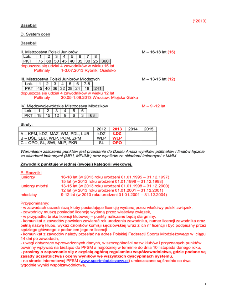 (*2013) Baseball D. System ocen Baseball II. Mistrzostwa Polski Juniorów Lok. 1 2 3 4 5 6 7 8 PKT 75 60 50 45 40 35 30 25 360 dopuszcza się udział 4 zawodników w wieku 15 lat Półfinały 1-3.07.2013 Rybnik, Osielsko M – 16-18 lat (15) III. Mistrzostwa Polski Juniorów Młodszych M – 13-15 lat (12) Lok. 1 2 3 4 5 6 7-8 PKT 45 40 36 32 28 24 18 241 dopuszcza się udział 4 zawodników w wieku 12 lat Półfinały 30.05-1.06.2013 Wrocław, Miejska Górka IV. Międzywojewódzkie Mistrzostwa Młodzików Lok. 1 2 3 4 5 6 PKT 18 15 12 9 6 3 63 M – 9 -12 lat Strefy: A – KPM, ŁDZ, MAZ, WM, PDL, LUB B – DŚL, LBU, WLP, POM, ZPM C – OPO, ŚL, ŚWI, MŁP, PKR 2012 ŁDZ WLP SL 2013 ŁDZ WLP OPO 2014 2015 Warunkiem zaliczenia punktów jest przesłanie do Działu Analiz wyników półfinałów i finałów łącznie ze składami imiennymi (MPJ, MPJMŁ) oraz wyników ze składami imiennymi z MMM. Zawodnik punktuje w jednej (swojej) kategorii wiekowej. E. Roczniki juniorzy juniorzy młodsi młodzicy 16-18 lat (w 2013 roku urodzeni 01.01.1995 – 31.12.1997) 15 lat (w 2013 roku urodzeni 01.01.1998 – 31.12.1998) 13-15 lat (w 2013 roku urodzeni 01.01.1998 – 31.12.2000) 12 lat (w 2013 roku urodzeni 01.01.2001 – 31.12.2001) 9-12 lat (w 2013 roku urodzeni 01.01.2001 – 31.12.2004) Przypominamy: - w zawodach uczestniczą kluby posiadające licencję wydaną przez właściwy polski związek, - zawodnicy muszą posiadać licencję wydaną przez właściwy związek, - w przypadku braku licencji klubowej – punkty naliczane będą dla gminy, - komunikat z zawodów powinien zawierać rok urodzenia zawodnika, numer licencji zawodnika oraz pełną nazwę klubu, wykaz członków komisji sędziowskiej wraz z ich nr licencji i być podpisany przez sędziego głównego z podaniem jego nr licencji - komunikat z zawodów należy przesłać na adres Polskiej Federacji Sportu Młodzieżowego w ciągu 14 dni po zawodach, - uwagi dotyczące wprowadzonych danych, w szczególności nazw klubów i przyznanych punktów powinny wpływać na bieżąco do PFSM a najpóźniej w terminie do dnia 10 listopada danego roku, - prosimy o zapoznanie się z częścią ogólną regulaminu współzawodnictwa, gdzie podane są zasady uczestnictwa i oceny wyników we wszystkich dyscyplinach systemu, - na stronie internetowej PFSM (www.sportmlodziezowy.pl) umieszczane są średnio co dwa tygodnie wyniki współzawodnictwa, 1