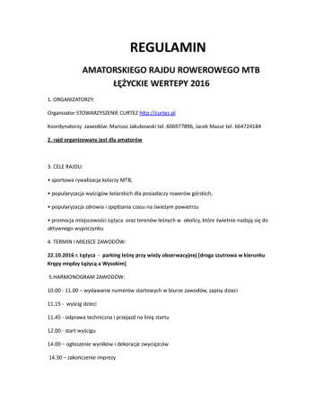 REGULAMIN AMATORSKIEGO RAJDU ROWEROWEGO MTB ŁĘŻYCKIE WERTEPY 2016 1. ORGANIZATORZY: Organizator STOWARZYSZENIE CURTEZ http://curtez.pl Koordynatorzy zawodów: Mariusz Jakubowski tel. 606977896, Jacek Mazur tel. 664724184 2. rajd organizowany jest dla amatorów 3. CELE RAJDU: • sportowa rywalizacja kolarzy MTB, • popularyzacja wyścigów kolarskich dla posiadaczy rowerów górskich, • popularyzacja zdrowia i spędzania czasu na świeżym powietrzu • promocja miejscowości Łężyca oraz terenów leśnych w okolicy, które świetnie nadają się do aktywnego wypoczynku 4. TERMIN I MIEJSCE ZAWODÓW: 22.10.2016 r. Łężyca - parking leśny przy wieży obserwacyjnej [droga szutrowa w kierunku Krępy między Łężycą a Wysokim] 5.HARMONOGRAM ZAWODÓW: 10.00 - 11.00 – wydawanie numerów startowych w biurze zawodów, zapisy dzieci 11.15 - wyścig dzieci 11.45 - odprawa techniczna i przejazd na linię startu 12.00 - start wyścigu 14.00 – ogłoszenie wyników i dekoracje zwycięzców 14.30 – zakończenie imprezy 6. ZGŁOSZENIA: Ilość miejsc dla zawodników dorosłych – 100 osób. Zapisy na rajd prowadzone będą on-line na stronie www.super-sport.com.pl, od dnia 04.10.2016 do dnia 21.10.2016 Przyjmowanie zgłoszeń dzieci w dniu zawodów 22 października 2016 od godz. 10.00 w biurze wyścigu (najpóźniej na 30 minut przed startem). 7. OPŁATA STARTOWA: - do wpłacenia na konto Stowarzyszenia tytułem „darowizna na rzecz stowarzyszenia CURTEZ” 76 1140 2004 0000 3002 7539 6642 lub gotówką w biurze zawodów w dniu wyścigu – wyścig główny 20 zł - dzieci – brak opłaty startowej Organizator nie zwraca opłaty startowej osobom, które nie ukończyły zawodów. 8. ŚWIADCZENIA DLA UCZESTNIKÓW: Wszyscy uczestnicy zawodów otrzymują: • pakiet startowy ( numer startowy, napój, baton ,gorący posiłek po zakończeniu zawodów) • elektroniczny pomiar czasu • podstawowe zabezpieczenie medyczne i ratownicze • medale dla trzech najwyżej sklasyfikowanych zawodników w każdej kategorii wiekowej • dyplomy dla wszystkich uczestników wyścigów • doskonałą kolarską atmosferę 9. WARUNKI UCZESTNICTWA: Prawo startu w imprezie mają wszystkie osoby, które: dokonają rejestracji on-line na stronie www.super-sport.com.pl - zapisy do dnia 21.10.2016. złożą oświadczenie o braku przeciwwskazań zdrowotnych. Wyrażą zgodę na uczestnictwo wyłącznie na własną odpowiedzialność (w przypadku zawodników niepełnoletnich na odpowiedzialność rodziców lub prawnych opiekunów). Prawo do startu mają osoby, które ukończyły 18 lat – zawodnicy niepełnoletni muszą posiadać pisemną zgodę rodziców. Każdy uczestnik zawodów jest zobowiązany do posiadania: kasku sztywnego przepisowego i sprawnego roweru dowodu tożsamości Wszyscy zawodnicy przed startem zobowiązani są do podpisania oświadczenia, iż zapoznali się z regulaminem 10. ZASADY PRZEPROWADZENIA WYŚCIGU : • wyścig odbędzie się w terenie wymagającym • wyścig zaczyna się od startu wspólnego • pomiar czasu będzie przeprowadzony elektronicznie • zawodnicy mają do pokonania: kobiety 2 pętle łącznie o długości około 9 km, mężczyźni 4 pętle łącznie o długości około 22 km, dla najmłodszych przewidziana jest trasa o łatwiejszym stopniu trudności o długości około 500 m i 1.000 m. • Zwycięzcą indywidualnym w każdej kategorii zostaje zawodnik, który na mecie wyścigu uzyska najkrótszy czas przejazdu oraz pokona pełen dystans przewidziany dla danej kategorii • Skracanie trasy, bądź niesportowe zachowanie w trakcie trwania zawodów skutkuje dyskwalifikacją zawodnika. • Objazd trasy zawodów w godz.8-10. Przebywanie na trasie w trakcie trwania wyścigów i jakiekolwiek utrudnianie rywalizacji skutkuje dyskwalifikacją zawodnika. 11. KATEGORIE I NAGRODY: • dzieci: 7 - 10 lat dziewczęta, chłopcy; 11-15 lat dziewczęta, chłopcy; • dorośli - kobiety - mężczyźni **O przynależności do klasyfikacji wiekowej decyduje rok urodzenia. **Organizator przewiduje nagrody dla trzech najwyżej sklasyfikowanych zawodników (kobiety, mężczyźni) 12. OCHRONA ŚRODOWISKA NATURALNEGO: Zawodnicy muszą szanować środowisko naturalne i bezwzględnie nie mogą zanieczyszczać trasy wyścigu. Zaśmiecanie trasy wyścigu karane będzie dyskwalifikacją. Nie wolno używać szklanych pojemników w pobliżu i na trasie zawodów. 13. POSTANOWIENIA KOŃCOWE: • Wyścig będzie rozgrywany trasą umiejscowioną całkowicie w terenie leśnym [w tym drogi pożarowe szutrowe] • Zawody odbędą się bez względu na warunki atmosferyczne. • Zawodnicy obowiązkowo startują w kaskach ochronnych sztywnych. • Każdy uczestnik bierze udział w wyścigu na własną odpowiedzialność. • Dzieci startują na odpowiedzialność rodziców. • Kolarze ubezpieczają się od następstw nieszczęśliwych wypadków we własnym zakresie. • Organizatorzy nie odpowiadają za wypadki spowodowane przez zawodników bądź osoby towarzyszące. • Organizator nie ponosi odpowiedzialności materialnej za rzeczy zaginione w trakcie trwania zawodów. • Organizator zastrzega sobie prawo do zmian kategorii i godzin startów z uwagi na liczbę startujących tj. połączenia, bądź rozdzielenia kategorii, niektóre kategorie wystartują wspólnie z odrębną klasyfikacją. • W sprawach nieobjętych niniejszym regulaminem decyduje Sędzia Główny w porozumieniu z organizatorami. • Organizator zastrzega sobie prawo do interpretacji niniejszego regulaminu oraz do wprowadzania uzasadnionych zmian w dowolnym momencie. • Uczestnik zgłaszając się w biurze zawodów oświadcza, że dane zgłoszone są zgodne z prawdą oraz zapoznał się i akceptuje wszystkie warunki regulaminu zawodów a także zapewnia, że stan zdrowia, w jakim się znajduje umożliwia udział w zawodach. 14. Sprawy sporne • Uczestnikom zawodów przysługuje prawo pisemnego zgłoszenia protestu w ciągu 15 minut po