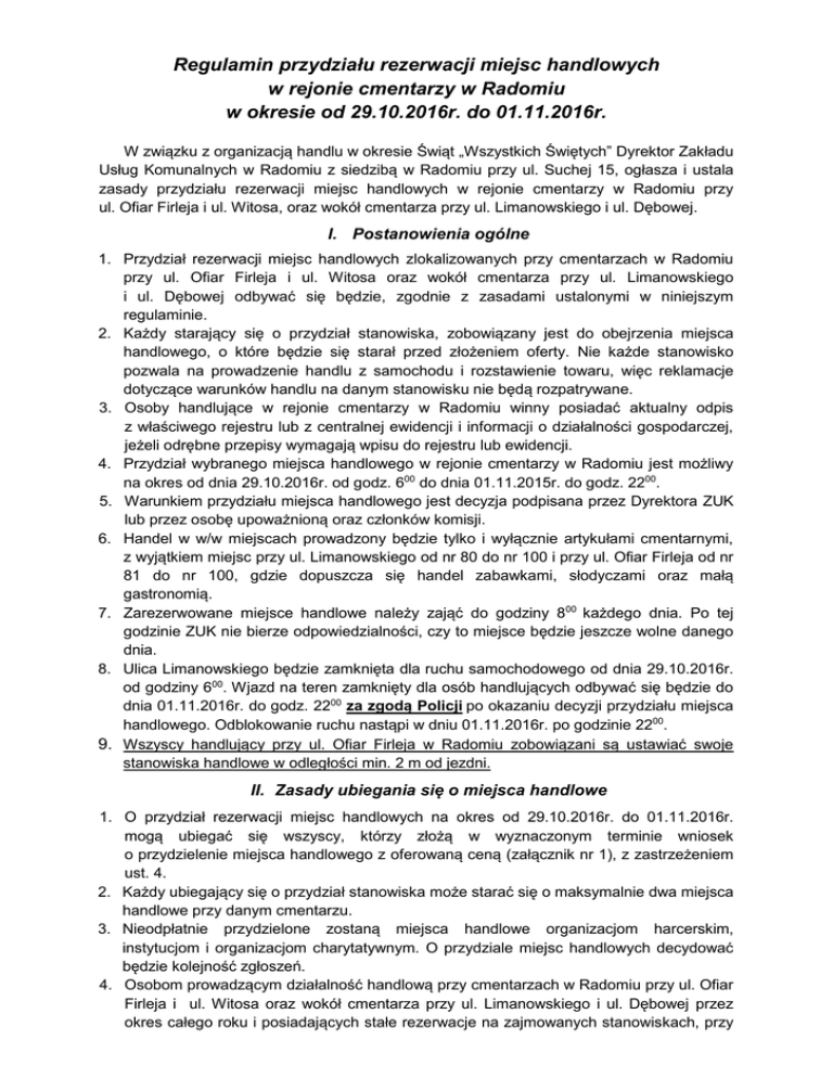 Regulamin przydziału rezerwacji miejsc handlowych w rejonie cmentarzy w Radomiu w okresie od 29.10.2016r. do 01.11.2016r. W związku z organizacją handlu w okresie Świąt „Wszystkich Świętych” Dyrektor Zakładu Usług Komunalnych w Radomiu z siedzibą w Radomiu przy ul. Suchej 15, ogłasza i ustala zasady przydziału rezerwacji miejsc handlowych w rejonie cmentarzy w Radomiu przy ul. Ofiar Firleja i ul. Witosa, oraz wokół cmentarza przy ul. Limanowskiego i ul. Dębowej. I. Postanowienia ogólne 1. Przydział rezerwacji miejsc handlowych zlokalizowanych przy cmentarzach w Radomiu przy ul. Ofiar Firleja i ul. Witosa oraz wokół cmentarza przy ul. Limanowskiego i ul. Dębowej odbywać się będzie, zgodnie z zasadami ustalonymi w niniejszym regulaminie. 2. Każdy starający się o przydział stanowiska, zobowiązany jest do obejrzenia miejsca handlowego, o które będzie się starał przed złożeniem oferty. Nie każde stanowisko pozwala na prowadzenie handlu z samochodu i rozstawienie towaru, więc reklamacje dotyczące warunków handlu na danym stanowisku nie będą rozpatrywane. 3. Osoby handlujące w rejonie cmentarzy w Radomiu winny posiadać aktualny odpis z właściwego rejestru lub z centralnej ewidencji i informacji o działalności gospodarczej, jeżeli odrębne przepisy wymagają wpisu do rejestru lub ewidencji. 4. Przydział wybranego miejsca handlowego w rejonie cmentarzy w Radomiu jest możliwy na okres od dnia 29.10.2016r. od godz. 600 do dnia 01.11.2015r. do godz. 2200. 5. Warunkiem przydziału miejsca handlowego jest decyzja podpisana przez Dyrektora ZUK lub przez osobę upoważnioną oraz członków komisji. 6. Handel w w/w miejscach prowadzony będzie tylko i wyłącznie artykułami cmentarnymi, z wyjątkiem miejsc przy ul. Limanowskiego od nr 80 do nr 100 i przy ul. Ofiar Firleja od nr 81 do nr 100, gdzie dopuszcza się handel zabawkami, słodyczami oraz małą gastronomią. 7. Zarezerwowane miejsce handlowe należy zająć do godziny 800 każdego dnia. Po tej godzinie ZUK nie bierze odpowiedzialności, czy to miejsce będzie jeszcze wolne danego dnia. 8. Ulica Limanowskiego będzie zamknięta dla ruchu samochodowego od dnia 29.10.2016r. od godziny 600. Wjazd na teren zamknięty dla osób handlujących odbywać się będzie do dnia 01.11.2016r. do godz. 2200 za zgodą Policji po okazaniu decyzji przydziału miejsca handlowego. Odblokowanie ruchu nastąpi w dniu 01.11.2016r. po godzinie 2200. 9. Wszyscy handlujący przy ul. Ofiar Firleja w Radomiu zobowiązani są ustawiać swoje stanowiska handlowe w odległości min. 2 m od jezdni. II. Zasady ubiegania się o miejsca handlowe 1. O przydział rezerwacji miejsc handlowych na okres od 29.10.2016r. do 01.11.2016r. mogą ubiegać się wszyscy, którzy złożą w wyznaczonym terminie wniosek o przydzielenie miejsca handlowego z oferowaną ceną (załącznik nr 1), z zastrzeżeniem ust. 4. 2. Każdy ubiegający się o przydział stanowiska może starać się o maksymalnie dwa miejsca handlowe przy danym cmentarzu. 3. Nieodpłatnie przydzielone zostaną miejsca handlowe organizacjom harcerskim, instytucjom i organizacjom charytatywnym. O przydziale miejsc handlowych decydować będzie kolejność zgłoszeń. 4. Osobom prowadzącym działalność handlową przy cmentarzach w Radomiu przy ul. Ofiar Firleja i ul. Witosa oraz wokół cmentarza przy ul. Limanowskiego i ul. Dębowej przez okres całego roku i posiadających stałe rezerwacje na zajmowanych stanowiskach, przy czym warunkiem takiego przydziału miejsc jest uiszczanie opłaty rezerwacyjnej za zajmowane stanowisko oraz osobom, które uiszczały opłaty rezerwacyjne co najmniej od dnia 1 czerwca b.r. przyznane zostaną decyzje. 5. Istnieje możliwość zamiany miejsca handlowego przez osoby, które posiadają stałą rezerwację (dotyczy wyłącznie ul. Limanowskiego) z wyjątkiem miejsc usytuowanych przy wejściach na cmentarze. 6. Osoby nie posiadające decyzji przyznania miejsca handlowego przy cmentarzu będą zobowiązane wykupić na miejscu takie zezwolenie od uprawnionych pracowników ZUK. W przypadku niewykupienia decyzji zostaną oni usunięci z zajmowanego stanowiska i ukarani mandatem przez odpowiednie służby miejskie. III. Sposób przydziału miejsc handlowych 1. Miejsca handlowe przydzielane będą w formie konkursu ofert. 2. Cena wywoławcza za jedno miejsce handlowe w rejonie cmentarzy w Radomiu przy ul. Ofiar Firleja i ul. Witosa, oraz wokół cmentarza przy ul. Limanowskiego i ul. Dębowej wynosi odpowiednio: a. 300,- zł brutto w przypadku handlu asortymentem cmentarnym (znicze, wiązanki, kwiaty), b. 100,- zł brutto w przypadku handlu obwarzankami, watą cukrową, balonami oraz drobnym handlem gastronomicznym. 3. Każda osoba/firma ubiegająca się o przydział rezerwacji miejsca handlowego składa w siedzibie ZUK zamkniętą kopertę z napisem: „IMIĘ I NAZWISKO/FIRMA” oraz „WNIOSEK O PRZYDZIELENIE MIEJSCA HANDLOWEGO” zawierającą ofertę cenową za rezerwację miejsca handlowego w rejonie cmentarzy. 4. Oferty zostaną otwarte przez komisję, której skład ustala Dyrektor Zakładu Usług Komunalnych w Radomiu odrębnym zarządzeniem. 5. Z ofert, które wpłyną do ZUK, komisja tworzy listę osób/firm. Lista układana jest w kolejności zaproponowanych przez osoby/firmy cen (od najwyższej do najniższej). Lista osób/firm zostaje przedstawiona do wiadomości na stronie internetowej http://www.bip.zuk.radom.pl/Inne/Ogłoszenia/3. Święto „Wszystkich Świętych” oraz poprzez wywieszenie na tablicy ogłoszeń w siedzibie ZUK. 6. Osoba/firma, która zaproponowała wyższą cenę za miejsce otrzymuje pierwszeństwo przy wyborze stanowiska handlowego. 7. W przypadku ofert zawierających identyczne, oferowane ceny za miejsce handlowe, o kolejności wyboru miejsca decyduje losowanie w obecności zainteresowanych i komisji. 8. Liczba miejsc handlowych przy ul. Ofiar Firleja jest ograniczona. W związku z czym nie każdej osobie u