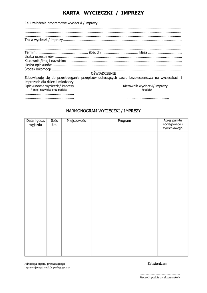 KARTA WYCIECZKI / IMPREZY Cel i założenia programowe wycieczki / imprezy ............................................................................... ..................................................................................................................................................... ..................................................................................................................................................... ..................................................................................................................................................... Trasa wycieczki/ imprezy................................................................................................................. ..................................................................................................................................................... ..................................................................................................................................................... Termin ................................................. ilość dni .................................. klasa ................................ Liczba uczestników ......................................................................................................................... Kierownik /imię i nazwisko/ ............................................................................................................. Liczba opiekunów ........................................................................................................................... Środek lokomocji ........................................................................................................................... OŚWIADCZENIE Zobowiązuję się do przestrzegania przepisów dotyczących zasad bezpieczeństwa na wycieczkach i imprezach dla dzieci i młodzieży. Opiekunowie wycieczki/ imprezy Kierownik wycieczki/ imprezy / imię i nazwisko oraz podpis/ ............................................... ............................................... ............................................... /podpis/ ....... ................................ HARMONOGRAM WYCIECZKI / IMPREZY Data i godz. wyjazdu Ilość km Miejscowość Adnotacja organu prowadzącego i sprawującego nadzór pedagogiczny Program Adres punktu noclegowego i żywieniowego Zatwierdzam ................................................. Pieczęć i podpis dyrektora szkoły OŚWIADCZENIE Świadom odpowiedzialności karnej wynikającej ze stosownych przepisów niniejszym oświadczam, że : 1. Posiadam znajomość przepisów bhp, zostałem/łam w tym zakresie przeszkolony/na i tym samym ponosić będę całkowitą odpowiedzialność za bezpieczeństwo, życie i zdrowie dzieci powierzonych mojej opiece. 2. Zobowiązuje się do przestrzegania tych przepisów i wykonywania wszystkich zarządzeń wydanych w tym zakresie przez władze oświatowe i kierownika placówki. DEKLARACJA w sprawie ochrony zdrowia i życia dziecka na wycieczkach, koloniach i obozach W poczuciu pełnej odpowiedzialności przed własnym sumieniem, rodzicami i społeczeństwem za bezpieczeństwo zdrowia i życia powierzonych mej opiece na .................................................. ................................................. przez .................................................................................... w okresie od dnia .................................... do dnia ..................................... oświadczam, co następuje: z należytą uwagą i zrozumieniem zapoznałem/łam się ze wszystkimi materiałami i przepisami dotyczącymi bezpieczeństwa, zdrowia i życia dzieci i młodzieży zobowiązuję się do skrupulatnego przestrzegania i stosowania zawartych w tych przepisach wskazówek, środków i metod w czasie pełnienia przeze mnie obowiązków wychowawcy, zastępcy kierownika, kierownika ,...................................................... * ..........................................................., dnia ....................................... r. Przyjmuję do wiadomości i ścisłego przestrzegania .............................................. podpis * niepotrzebne skreślić
