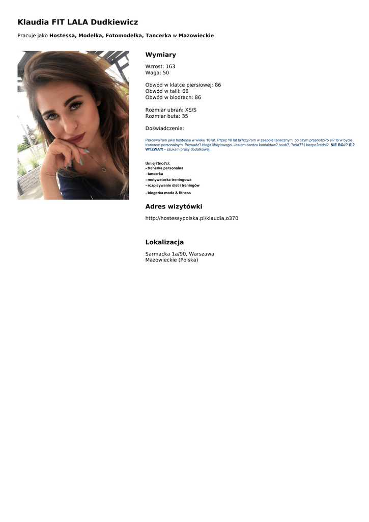 Klaudia FIT LALA Dudkiewicz Pracuje jako Hostessa, Modelka, Fotomodelka, Tancerka w Mazowieckie Wymiary Wzrost: 163 Waga: 50 Obwód w klatce piersiowej: 86 Obwód w talii: 66 Obwód w biodrach: 86 Rozmiar ubrań: XS/S Rozmiar buta: 35 Doświadczenie: Pracowa?am jako hostessa w wieku 18 lat. Przez 10 lat ta?czy?am w zespole tanecznym, po czym przerodzi?o si? to w bycie trenerem personalnym. Prowadz? bloga lifstylowego. Jestem bardzo kontaktow? osob?, ?mia?? i bezpo?redni?. NIE BOJ? SI? WYZWA?! - szukam pracy dodatkowej. Umiej?tno?ci: - trenerka personalna - tancerka - motywatorka treningowa - rozpisywanie diet i treningów - blogerka moda & fitness Adres wizytówki http://hostessypolska.pl/klaudia,o370 Lokalizacja Sarmacka 1a/90, Warszawa Mazowieckie (Polska) Powered by TCPDF (www.tcpdf.org)