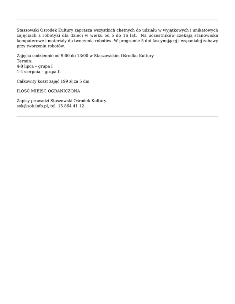 Staszowski Ośrodek Kultury zaprasza wszystkich chętnych do udziału w wyjątkowych i unikatowych zajęciach z robotyki dla dzieci w wieku od 5 do 16 lat. Na uczestników czekają stanowiska komputerowe i materiały do tworzenia robotów. W programie 5 dni fascynującej i wspaniałej zabawy przy tworzeniu robotów. Zajęcia codziennie od 9:00 do 13:00 w Staszowskim Ośrodku Kultury Termin: 4-8 lipca – grupa I 1-4 sierpnia – grupa II Całkowity koszt zajęć 199 zł za 5 dni ILOŚĆ MIEJSC OGRANICZONA Zapisy prowadzi Staszowski Ośrodek Kultury [email protected], tel. 15 864 41 12