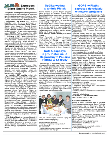 Expresem przez Gmin Pi tek - odby y si przetargi na wybór wykonawcy modernizacji wietlicy wiejskiej w Go lubiu oraz Rewitalizacj parku w Pi tku - II etap. Po uprawomocnieniu si wyniki przetargów zostan podane dopublicznej wiadomo ci. - zako czy y si prace przy wycince krzakó w przy drogac h gm in nych w miejscowo ciach: Mys ówka, Witów, Piekary, Or dki, ka, Janowice - Go lub Osada, onie, Su kowice Pierwsze i Su kowice Drugie. Obecnie trwa rozdrabnianie ci tych krzaków i ga zi. Prace wykonane zosta y przez ZGKiM w Pi tku, pracowników robót publicznych oraz firm PanaWac awskiego. - druhowie z OSP Pi tek wykonali dwa nowe gniazda bocianie, które zamontowano w P awicach i Czernikowie na miejscu starych zniszczonych przez wichury, a pracownicy Zak adu Energetycznego odnowili gniazdo bociana przy ul.Kutnowskiej. - na terenie gminy trwa monta urz dze steruj cych do o wietlenia ulicznego. W ramach I etapu modernizacji o wietlenia zako czono monta ponad 1100 lamp. Pozosta e lampy zostan zamontowane w II etapie. W ostatnim czasie nowe o wietlenie zosta o uruchomione w Bronikowie, ce, Su kow icach Pierw sz ych, l adkowie Rozlaz ym,Mchowicach i Bielicach. Sukcesywnie o wietlenie b dzie uruchamiane w pozosta ych miejscowo ciach. - rozp ocz o si szlakowanie dróg. Dotychczas szlaka zosta a wysypana na drogi w Orenicach, Bronikowie i Witowie. Niestety zbyt ma e dostawy szlaki nie pozwalaj na zaspokojenie wszystkich potrzeb wtym zakresie. wietlicy OSP Janków odby y si spotkania rolników: z dyrektorem kontraktu p. Andrzejem Pawlickim w sprawie dróg dojazdowych do pól w rejonie budowanej autostrady A1 oraz przedstawicielami Nadle nictwaKutno, z którymi omawianospraw przejezdno ci dróg do k we W ostowicach. - w sali konferencyjnej Urz du Gminy Pi tek odby o si spotkanie z sotysami, podczas którego Wójt Gminy Pi tek, p. Krzy sz tof Lis ieck i z s o ty so m podzi kowania za dotychczasow prac . Wyró nieniami oraz upominkami uhonorowano so tysów z ponad 20-letnim sta em pracy p. Andrzeja Michalaka - Pokrzywnica, p. Józefa Ró alskiego - Su kowice Drugie, p. Eugen iusza A damskie go ladków Podle ny, p. W adys awa Go uchowskiego Witów, p. Henryka Le niews kiego ostowice oraz so tysów, którzy zako czyli swoj wieloletni kadencj Piotra Wasiaka Balków, Jana Pi acika - Go lub, Zdzis aw Zych - Górki P awskie, Józefa B aszczyka Mchowice, oraz p. Jana St pniaka - JankówOr dki. - Wójt Gminy Pi tek - p. Krzysztof Lisiecki i Sekretarz Gminy - p. Renata Lepalczyk spotkali si z Marsza kiem Woj. ódzkiego p. Witoldem St pniem w sprawie czyszczenia naszych 3 rzek. Na r ce Marsza ka z ono petycj z podpisami mieszka ców gminy. Spó ka wodna w gminie Pi tek Spó ka wodna w gminie Pi tek przyj a form prawn . W ostatnim czasie przez Zarz d Spó ki zosta opracowany wniosek na dofi na nsow anie czysz czenia row ów melioracyjnych, który zosta ony w Urz dzie Marsza kowskim. Wnioskowana kwota dotacji - 87 tys. z . ...................... W bie cym roku Spó ka wodna planuje oczyszczenie 18 km rowów melioracyjnych (z ok. 140 km uj tych w ewidencji Spó ki). Przypominamy, e wysoko op aty jaka zosta a podj ta na zebraniu walnym wynosi 5z /ha na 1 cz onka Spó ki. ...................... Sk ad Zarz du Spó ki Wodnej w Gminie Pi tek: J óz ef R ó als ki - P rz ew odn ic z cy, Ma gorzata Gabryelczak - Sekretarz, W a ld e m a r K r y s ia k - Sk a r b n i k Józef Stawi ski i Mariusz Kasica cz onkowie.W sk ad Komisji rewizyjnej weszli: ukasz Sitkiewicz - Przewodnicz cy, Wies aw Miko ajczyk i Ewa B aszczyk. Ko a Gospody z gm. Pi tek na IX Regionalnym Pokazie Potraw w czycy Odwiedzaj cy IX Regionalny Pokaz Potraw czycy, który odby si rod 3 marca, mieli okazj posmakowania m.in. potraw przyg otowany ch prze z panie z Ko a Gospody W iejskich w Jankowie i w Pokrzywnicy . Panie z Jankowa przygotowa y wy mienite tradycyjne go bki z ry em w sosie pomidorowym z wiosenn surówk z kapustypeki skiej oraz ostatkowe p czki. Natomiast Panie z Pokrzywnicy zaprezentowa y: opatk pokrzywnick , bigos cyga ski, go bki ukrai skie, sa atk zgyrosem i ciasto kakaowiec. Paniom sk adamy serdeczne gratulacje za przygotowanie wspa nia ych da ora z podzi kowania za godne reprezentowanie Gminy Pi tek na Pokazie Potraw. GOPS w Pi tku zaprasza do udzia u w nowym projekcie GminnyO rodek Pomocy Spo ecznej w Pi tku zaprasza osoby pozostaj ce bez zatrudnienia ko rz ystaj ce ze wi ad cze p om o cy spo e cznej do udzi a u w bezp atn ych szkoleniach realizowanych w ramach projektu pt. „ INACZEJ - Z CENTRUM POLSKI DO UNII ” wspó finansowanego przez Uni Euro pejsk ze rod ków Europejsk iego F u n d usz u S po e c z neg o w r a m a ch Poddzia ania 7.1.1 Programu Operacyjnego Kapita Ludzki. Ogólnym celem projektu jest aktywizacja spo eczno-zawodowa grupy 20 bezrobotnych w wiekuaktywno ci zawodowej z terenu gminy Pi te k, korz ystaj c ych ze wiadc ze Gminnego O rodka Pomocy Spo ecznej. Projekt, skierowany jest do osób pozostacych bez zatrudnienia i korzystaj cych ze wiadcze pomocy spo ecznej (w tym osób zarejestrowanych w PUP jako bezrobotne lub p o s z u ku j c e p r a c y ) , s p e nia j c y ch jednocze nie warunki: · zamieszkuj cychna terenie GminyPi tek, ·b cych w wieku aktywno ci zawodowej, · niezatrudnionych i nie wykonuj cych innej pracy zarobkowej (na podstawie umowy o prac , powo ania, wyboru, mianowania, spó dzielczej umowy o prac oraz umów cywilno-praw nych). cznie wsparc iem obj tychzostaniegrupa 20osób. UWAGA: W projekcie b mog y bra udzia osoby ubezpieczone w KRUS oraz osoby niepe nosprawne. Projekt zak ada przeszkolenie osób pozostacych bez zatrudnienia w nast puj cych kierunkach: · Pracownik ma ejgastronomi – dla 5osób. · Fakturzysta z elementami obs ugi komputera – dla 5 osób · Kierowca wózków jezdniowych z nap dem silnikowym - dla 10osób W ramach projektu zapewnia si : · wsparcie psychologa dla uczestni ków projektuoraz ich rodzin, · doradztwo zawodowe · zasi ki i pomoc w naturze dla uczestników projektu, 