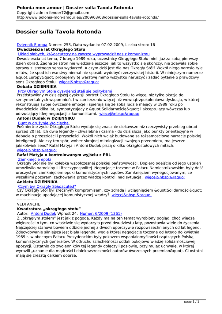 Polonia mon amour | Dossier sulla Tavola Rotonda Copyright admin [email protected] http://www.polonia-mon-amour.eu/2009/03/08/dossier-sulla-tavola-rotonda/ Dossier sulla Tavola Rotonda Dziennik Europa, Numer: 253, Data wydania: 07-02-2009, Liczba stron: 16 Dwadzieścia lat Okrągłego Stołu Układ słabych, który na zawsze wyprowadził nas z komunizmu Dwadzieścia lat temu, 7 lutego 1989 roku, uczestnicy Okrągłego Stołu mieli już za sobą pierwszy dzień obrad. Żadna ze stron nie wiedziała jeszcze, jak to wszystko się skończy, nie zdawała sobie sprawy z istotnego sensu wydarzeń. A czym dziś jest dla nas Okrągły Stół? Wokół niego narosło tyle mitów, że spod ich warstwy niemal nie sposób wydobyć rzeczywistej historii. W niniejszym numerze "Europy" próbujemy tę warstwę mimo wszystko naruszyć i zadać pytanie o prawdziwy sens Okrągłego Stołu. więcej » Debata DZIENNIKA Przy Okrągłym Stole dysydenci stali się politykami Przedstawiony w dzisiejszej dyskusji portret Okrągłego Stołu to więcej niż tylko okazja do sentymentalnych wspomnień. I w zamierzeniu więcej niż wewnątrzpokoleniowa dyskusja, w której rekonstruują swoje ówczesne emocje i spierają się ze sobą ludzie mający w 1989 roku po dwadzieścia kilka lat, sympatyzujący z "Solidarnością" i akceptujący wówczas lub odrzucający ideę negocjacji z komunistami. więcej » Antoni Dudek w DZIENNIKU Bunt w drużynie Wojciecha Pośmiertne życie Okrągłego Stołu wydaje się znacznie ciekawsze niż rzeczywisty przebieg obrad sprzed 20 lat. Ich dwie legendy - chwalebna i czarna - do dziś służą jako punkty orientacyjne w debacie o przeszłości i przyszłości. Wokół nich wciąż budowane są tożsamościowe narracje polskiej inteligencji. Ale czy ten spór, wobec skrajnej mitologizacji swojego przedmiotu, ma jeszcze jakikolwiek sens? Rafał Matyja i Antoni Dudek piszą o kilku okrągłostołowych mitach. więcej » Rafał Matyja o kontrolowanym wyjściu z PRL Zamknięcie epoki Okrągły Stół nie był kolebką współczesnej polskiej państwowości. Dopiero odejście od jego ustaleń umożliwiło narodziny III Rzeczypospolitej. Negocjacje toczone w Pałacu Namiestnikowskim były dość uroczystym zamknięciem epoki komunistycznych rządów. Zamknięciem wynegocjowanym, ze wszelkimi pozorami zachowania przez władzę kontroli nad sytuacją. więcej » Ankieta DZIENNIKA Czym był Okrągły Stół? Czy Okrągły Stół był zręcznym kompromisem, czy zdradą i wciągnięciem "Solidarności" w machinacje upadającej komunistycznej władzy? więcej » --------------VEDI ANCHE Kwadratura „okrągłego stołu” Autor: Antoni Dudek, Wprost 24, Numer: 6/2009 (1361) Z „okrągłym stołem” jest jak z pogodą. Każdy ma na ten temat wyrobiony pogląd, choć wiedza większości o tym, co właściwie się wydarzyło przed dwudziestu laty, pozostawia wiele do życzenia. Najczęściej stanowi bowiem odbicie jednej z dwóch uporczywie rozpowszechnianych od lat legend. Zdecydowanie silniejsza jest biała legenda, wedle której negocjacje toczone od lutego do kwietnia 1989 r. w obecnym Pałacu Prezydenckim były pokazem wspaniałomyślności rządzących Polską komunistycznych generałów. W odruchu szlachetności oddali pokojowo władzę solidarnościowej opozycji. Ostatnio do zwolenników tej legendy dołączyli posłowie, przyjmując uchwałę, w której wyrazili „uznanie dla mądrości i dalekowzroczności autorów ówczesnych przemian". Ci ostatni mają się zresztą całkiem dobrze. page 1 / 1