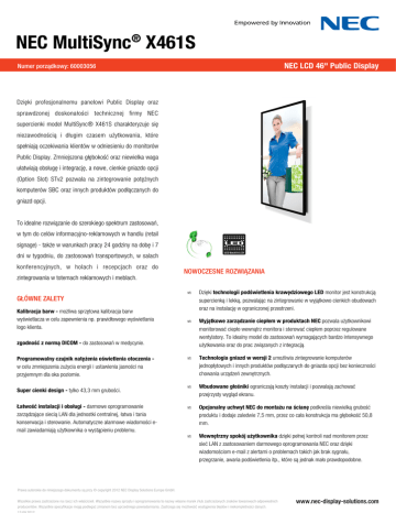 NEC MultiSync® X461S NEC LCD 46" Public Display Numer porządkowy: 60003056 Dzięki profesjonalnemu panelowi Public Display oraz sprawdzonej doskonałości technicznej firmy NEC supercienki model MultiSync® X461S charakteryzuje się niezawodnością i długim czasem użytkowania, które spełniają oczekiwania klientów w odniesieniu do monitorów Public Display. Zmniejszona głębokość oraz niewielka waga ułatwiają obsługę i integrację, a nowe, cienkie gniazdo opcji (Option Slot) STv2 pozwala na zintegrowanie potężnych komputerów SBC oraz innych produktów podłączanych do gniazd opcji. To idealne rozwiązanie do szerokiego spektrum zastosowań, w tym do celów informacyjno-reklamowych w handlu (retail signage) - także w warunkach pracy 24 godziny na dobę i 7 dni w tygodniu, do zastosowań transportowych, w salach konferencyjnych, w holach i recepcjach oraz do NOWOCZESNE ROZWIĄZANIA zintegrowania w totemach reklamowych i meblach. • Dzięki technologii podświetlenia krawędziowego LED monitor jest konstrukcją supercienką i lekką, pozwalając na zintegrowanie w wyjątkowo cienkich obudowach oraz na instalację w ograniczonej przestrzeni. • Wyjątkowe zarządzanie ciepłem w produktach NEC pozwala użytkownikowi monitorować ciepło wewnątrz monitora i sterować ciepłem poprzez regulowane wentylatory. To idealny model do zastosowań wymagających bardzo intensywnego użytkowania oraz do prac związanych z integracją. • Technologia gniazd w wersji 2 umożliwia zintegrowanie komputerów jednopłytowych i innych produktów podłączanych do gniazda opcji bez konieczności chowania urządzeń zewnętrznych. • Wbudowane głośniki ograniczają koszty instalacji i pozwalają zachować przejrzysty wygląd ekranu. • Opcjonalny uchwyt NEC do montażu na ścianę podkreśla niewielką grubość produktu i dodaje zaledwie 7,5 mm, przez co cała konstrukcja ma głębokość 50,8 mm. • Wewnętrzny spokój użytkownika dzięki pełnej kontroli nad monitorem przez sieć LAN z zastosowaniem darmowego oprogramowania NEC oraz dzięki wiadomościom e-mail z alertami o problemach takich jak brak sygnału, przegrzanie, awaria podświetlenia itp., które są jednak mało prawdopodobne. GŁÓWNE ZALETY Kalibracja barw - możliwa sprzętowa kalibracja barw wyświetlacza w celu zapewnienia np. prawidłowego wyświetlania logo klienta. zgodność z normą DICOM - do zastosowań w medycynie. Programowalny czujnik natężenia oświetlenia otoczenia w celu zmniejszenia zużycia energii i ustawienia jasności na przyjemnym dla oka poziomie. Super cienki design - tylko 43,3 mm grubości. Łatwość instalacji i obsługi - darmowe oprogramowanie zarządzające siecią LAN dla jednostki centralnej, łatwa i tania konserwacja i sterowanie. Automatyczne alarmowe wiadomości email zawiadamiają użytkownika o wystąpieniu problemu. Prawa autorskie do niniejszego dokumentu są przy © copyright 2012 NEC Display Solutions Europe GmbH. Wszelkie prawa zastrzeżone na rzecz ich właścicieli. Wszystkie nazwy sprzętu i oprogramowania to nazwy własne marek i/lub zastrzeżonych znaków towarowych odpowiednich producentów. Wszystkie specyfikacje mogą podlegać zmianom bez uprzedniego powiadamiania. Zastrzega się możliwość wystąpienia błędów i niekompletności danych. www.nec-display-solutions.com NEC MultiSync® X461S Dane techniczne NEC MultiSync® X461S WYŚWIETLACZ Rodzaj panelu technologia S-PVA z krawędziowym podświetleniem LED Użyteczna powierzchnia [cale/cm] 1,018 x 572 Wielkość ekranu [cale/cm] 46 / 117 Proporcje obrazu 16:9 Jasność (przy wysyłce) [cd/m2] 500, (600 max) Kontrast 3000:1 Kąty widzenia [°] 178 poziomo / 178 pionowo (CR 10:1) Czas reakcji [ms] 8 (grey-to-grey) Częstotliwość odświeżania obrazu [Hz] 60 CZĘSTOTLIWOŚĆ SYNCHRONIZACJI 1. Power Częstotliwość pozioma [kHz] 31.5 - 91.1 2. Main Switch Częstotliwość pionowa [Hz] 50 - 85 ROZDZIELCZOŚĆ 3. DisplayPort in 4. HDMI in 5. DVI in / out 6. VGA IN (mini D-Sub 15 pin) Rozdzielczość natywna 1920 x 1080 przy 60 Hz Obsługiwane przez wejścia cyfrowe i analogowe (PC) 1024 x 768; 1280 x 1024; 1280 x 720; 1280 x 768; 1280 x 800; 1280 x 960; 1366 x 768; 1400 x 1050; 1600 x 1200; 1680 x 1050; 1920 x 1080; 640 x 480; 720 x 400; 720 x 576; 800 x 600 Obsługiwane przez wejścia cyfrowe (wideo) 1280 x 720p (50)16:9; 1280 x 720p (59.94/60)16:9; 1920 x 1080i (50)16:9; 1920 x 1080i (59.94/60)16:9; 1920 x 1080p (23.97/24)16:9; 1920 x 1080p (25)16:9; 1920 x 1080p (29.97/30)16:9; 1920 x 1080p (50)16:9; 1920 x 1080p (59.94/60) 16:9; 720 x 480p (59.94/60)16:9; 720 x 576p (50)16:9 7. Composite in 8. LAN with SNMP MOŻLIWOŚCI PODŁĄCZANIA 9. External control RS-232 in / out Wejścia wideo analogowe 1 x D-sub 15 pin; Composite (BNC) 10. Audio out Wejścia wideo cyfrowe 1 x DVI-D (z HDCP); 1 x HDMI (HDCP); 1 x DisplayPort (HDCP) 11. Audio in Wejścia audio analogowe 1 x 3,5 mm jack Wejścia audio cyfrowe Interfejs DisplayPort; 1x HDMI Kontrola wejścia RS232; Sieć LAN 100 Mbit Wyjścia wideo cyfrowe 1 x DVI-D (HDCP) Wyjścia audio analogowe 3,5mm jack Kontrola wyjścia RS232 Funkcje pilota LAN z SNMP; RS-232C (9-pin D-sub) Input and Output; Zdalne sterowanie przez podczerwień (czujnik wewn./zewn. (opcjonalnie)) 12. External speakers 13. Internal / external speaker switch CECHY SPECJALNE Bardzo szybka zmiana wejść sygnałowych, Funkcje wygaszacza SLOT OPCJI Rodzaj slot STv2 (kompatybilność z normą OPS firm Intel i NEC) ekranu, Kopiowanie ustawień monitora przez złącze RS232, Menu Prąd rozruchowy [A] max. 10 OSD z możliwością obrotu do trybu portretowego, możliwa sprzętowa Pobór mocy [W] max. 61 Napięcie/Prąd [V/A] 16/4 kalibracja barw, Możliwość zmiany priorytetu złączy wideo, Możliwość łączenia szeregowego przez porty DVI (maks. 9 urządzeń), Obsługa PARAMETRY ELEKTRYCZNE Pobór mocy [W] 135 (typ.); 230 (maks.) DICOM, Pamięć ustawień matrycy, programowany czujnik natężenia Tryb P