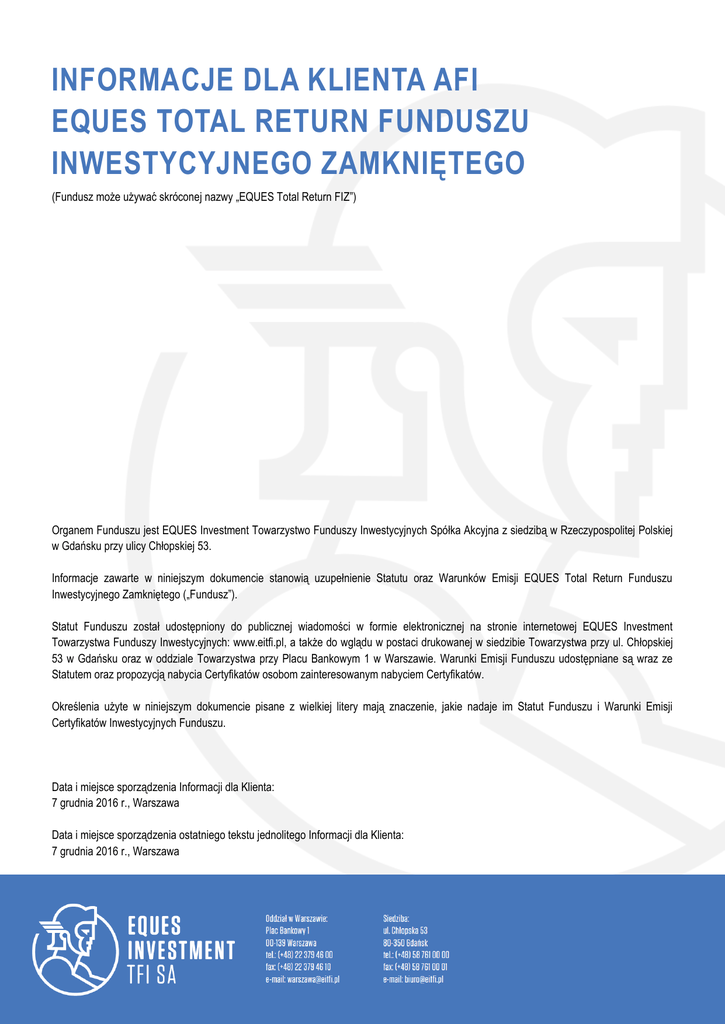 INFORMACJE DLA KLIENTA AFI EQUES TOTAL RETURN FUNDUSZU INWESTYCYJNEGO ZAMKNIĘTEGO (Fundusz może używać skróconej nazwy „EQUES Total Return FIZ”) Organem Funduszu jest EQUES Investment Towarzystwo Funduszy Inwestycyjnych Spółka Akcyjna z siedzibą w Rzeczypospolitej Polskiej w Gdańsku przy ulicy Chłopskiej 53. Informacje zawarte w niniejszym dokumencie stanowią uzupełnienie Statutu oraz Warunków Emisji EQUES Total Return Funduszu Inwestycyjnego Zamkniętego („Fundusz”). Statut Funduszu został udostępniony do publicznej wiadomości w formie elektronicznej na stronie internetowej EQUES Investment Towarzystwa Funduszy Inwestycyjnych: www.eitfi.pl, a także do wglądu w postaci drukowanej w siedzibie Towarzystwa przy ul. Chłopskiej 53 w Gdańsku oraz w oddziale Towarzystwa przy Placu Bankowym 1 w Warszawie. Warunki Emisji Funduszu udostępniane są wraz ze Statutem oraz propozycją nabycia Certyfikatów osobom zainteresowanym nabyciem Certyfikatów. Określenia użyte w niniejszym dokumencie pisane z wielkiej litery mają znaczenie, jakie nadaje im Statut Funduszu i Warunki Emisji Certyfikatów Inwestycyjnych Funduszu. Data i miejsce sporządzenia Informacji dla Klienta: 7 grudnia 2016 r., Warszawa Data i miejsce sporządzenia ostatniego tekstu jednolitego Informacji dla Klienta: 7 grudnia 2016 r., Warszawa I. Definicje i skróty Aktywa Funduszu mienie Funduszu obejmujące środki pieniężne z tytułu wpłat Uczestników Funduszu, środki pieniężne, prawa nabyte przez Fundusz oraz pożytki z tych praw; Depozytariusz ING Bank Śląski Spółka Akcyjna jako bank prowadzący rejestr Aktywów Funduszu, pełniący obowiązki depozytariusza zgodnie z Ustawą; Dystrybutor podmiot, który zgodnie z powszechnie obowiązującymi przepisami prawa jest uprawniony do pośredniczenia w przyjmowaniu zapisów na certyfikaty inwestycyjne funduszu inwestycyjnego zamkniętego, i który na podstawie umowy zawartej z Funduszem pośredniczy w przyjmowaniu zapisów na oferowane certyfikaty; Dzień Wyceny dzień, na który dokonuje się wyceny Aktywów Funduszu, ustalenia Wartości Aktywów Netto oraz Wartości Aktywów Netto na Certyfikat, przypadający: a. na dzień otwarcia ksiąg rachunkowych Funduszu, b. na ostatni dzień każdego miesiąca, c. na 7 dni przed rozpoczęciem przyjmowania zapisów na Certyfikaty kolejnej emisji, d. na dzień przydziału Certyfikatów kolejnej emisji, e. na dzień podziału albo łączenia Certyfikatów, f. na dzień poprzedzający dzień, na który zwołane zostało Zgromadzenie Inwestorów, którego porządek obrad przewiduje podjęcie uchwały w sprawie wyrażenia zgody na emisję obligacji przez Fundusz, g. na dzień poprzedzający dzień otwarcia likwidacji Funduszu, h. na dzień ustalenia wartości środków do wypłaty Uczestnikom z tytułu posiadanych Certyfikatów, w przypadku likwidacji Funduszu; Dzień Wykupu dzień, w którym Fundusz dokonuje wykupu Certyfikatów, na żądanie Uczestników przypadający na ostatni dzień kwartału; Ewidencja Uczestników ewidencja zawierająca informacje o Uczestnikach, umożliwiającą ich identyfikację oraz dane o przysługujących Uczestnikom Certyfikatach, prowadzoną zgodnie z art. 123 ust. 3 Ustawy oraz art. 9 Statutu; Fundusz EQUES Total Return Fundusz Inwestycyjny Zamknięty; Komisja Komisja Nadzoru Finansowego; Statut Statut Funduszu; Towarzystwo EQUES Investment Towarzystwo Funduszy Inwestycyjnych Spółka Akcyjna; Uczestnik osoba fizyczna, prawna lub jednostka organizacyjna nieposiadająca osobowości prawnej (jednakże posiadająca zdolność do nabywania praw i zaciągania zobowiązań we własnym imieniu), na rzecz której zapisano w Ewidencji Uczestników co najmniej jeden Certyfikat; Ustawa ustawa z dnia 27 maja 2004 r. o funduszach inwestycyjnych i zarządzaniu alternatywnymi funduszami inwestycyjnymi (Dz. U. z 2016 poz. 615); Warunki Emisji warunki emisji Certyfikatów Funduszu. 2 II. Informacje ogólne Obowiązek sporządzenia niniejszego dokumentu (Informacje dla Klienta) wynika z artykułu 222a ust. 2 Ustawy. Zgodnie z artykułem 222a ust. 1 Ustawy, Informacje dla Klienta powinny zostać udostępnione klientowi przy emisji certyfikatów inwestycyjnych funduszu inwestycyjnego zamkniętego, w celu umożliwienia zapoznania się z treścią tego dokumentu przed objęciem certyfikatów inwestycyjnych. Towarzystwo oraz Dystrybutor przed objęciem certyfikatów inwestycyjnych Funduszu jest zobowiązane udostępniać klientowi informację o istotnych zmianach w niniejszym dokumencie zgodnie z artykułem 222a ust. 3 Ustawy. Obowiązująca wersja Informacji dla Klienta publikowana jest na stronie internetowej Towarzystwa www.eitfi.pl. Stosownie do postanowień artykułu 222a ust. 5 Ustawy, niniejszy dokument obejmuje informacje wymagane na podstawie Ustawy wyłącznie w zakresie, w jakim nie są one udostępnione w treści warunków emisji funduszu inwestycyjnego. Statut Funduszu Inwestycyjnego, a także inne wymagane przepisami prawa dokumenty dotyczące Funduszu dostępne są na stronie internetowej Towarzystwa www.eitfi.pl. 3 III. Informacje wymagane na podstawie art. 222a ust. 2 Ustawy, w zakresie nie zamieszczonym w Warunkach Emisji Funduszu 1. Firma (nazwa), siedziba i adres Funduszu „EQUES Total Return Fundusz Inwestycyjny Zamknięty”. Fundusz może używać skróconej nazwy w brzmieniu „EQUES Total Return FIZ”. Siedziba i adres Funduszu wskazane są we Wstępie do Warunków Emisji Funduszu. Siedziba i adres Funduszu odpowiadają siedzibie Towarzystwa, zarządzającego i reprezentującego Fundusz. 2. Firma (nazwa), siedziba i adres podmiotu, który zarządza Funduszem, a także Depozytariusza, podmiotu uprawnionego do badania sprawozdań finansowych oraz innych podmiotów świadczących usługi na rzecz Funduszu, z opisem ich obowiązków oraz praw Uczestnika Funduszu Firma (nazwa), siedziba i adres: 1) Podmiotu, który zarządza Funduszem (Towarzystwa) wskazane są w Rozdziale VI pkt