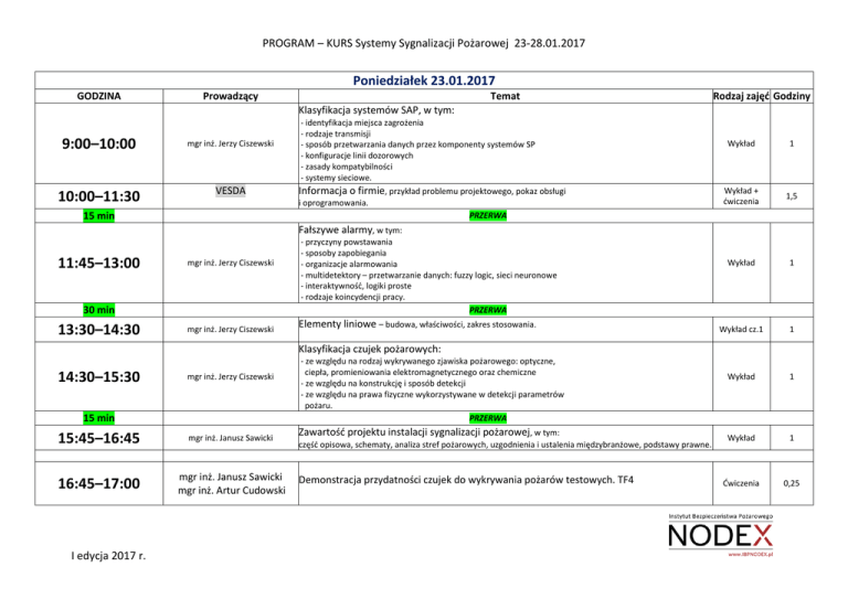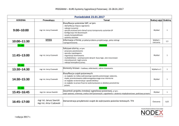 PROGRAM – KURS Systemy Sygnalizacji Pożarowej 23-28.01.2017 Poniedziałek 23.01.2017 GODZINA Prowadzący Temat Rodzaj zajęć Godziny Klasyfikacja systemów SAP, w tym: 9:00–10:00 mgr inż. Jerzy Ciszewski 10:00–11:30 VESDA 15 min - identyfikacja miejsca zagrożenia - rodzaje transmisji - sposób przetwarzania danych przez komponenty systemów SP - konfiguracje linii dozorowych - zasady kompatybilności - systemy sieciowe. Informacja o firmie, przykład problemu projektowego, pokaz obsługi i oprogramowania. PRZERWA Wykład 1 Wykład + ćwiczenia 1,5 Wykład 1 Wykład cz.1 1 Wykład 1 Wykład 1 Ćwiczenia 0,25 Fałszywe alarmy, w tym: 11:45–13:00 mgr inż. Jerzy Ciszewski 30 min 13:30–14:30 mgr inż. Jerzy Ciszewski - przyczyny powstawania - sposoby zapobiegania - organizacje alarmowania - multidetektory ̶ przetwarzanie danych: fuzzy logic, sieci neuronowe - interaktywność, logiki proste - rodzaje koincydencji pracy. PRZERWA Elementy liniowe – budowa, właściwości, zakres stosowania. Klasyfikacja czujek pożarowych: 14:30–15:30 mgr inż. Jerzy Ciszewski 15 min 15:45–16:45 mgr inż. Janusz Sawicki 16:45–17:00 mgr inż. Janusz Sawicki mgr inż. Artur Cudowski I edycja 2017 r. - ze względu na rodzaj wykrywanego zjawiska pożarowego: optyczne, ciepła, promieniowania elektromagnetycznego oraz chemiczne - ze względu na konstrukcję i sposób detekcji - ze względu na prawa fizyczne wykorzystywane w detekcji parametrów pożaru. PRZERWA Zawartość projektu instalacji sygnalizacji pożarowej, w tym: część opisowa, schematy, analiza stref pożarowych, uzgodnienia i ustalenia międzybranżowe, podstawy prawne. Demonstracja przydatności czujek do wykrywania pożarów testowych. TF4 PROGRAM – KURS Systemy Sygnalizacji Pożarowej 23-28.01.2017 Wtorek 24.01.2017 Godzina Prowadzący 9:00–10:30 VIDICON 10:40–11:30 mgr inż. Artur Cudowski 15 min mgr inż. Jerzy Ciszewski 12:45–13:00 mgr inż. Artur Cudowski 30 min I edycja 2017 r. Wykład + ćwiczenia 1,5 Wykład 1 Elementy liniowe – budowa, właściwości, zakres stosowania. Wykład cz. 2 1 Demonstracja przydatności czujek do wykrywania pożarów testowych. TF2 Ćwiczenia 0,25 Wykład 2,25 Wykład + ćwiczenia 1,5 PRZERWA mgr inż. Jerzy Ciszewski 15 min 16:00–17:30 Rodzaj zajęć Godziny PRZERWA 11:45–12:45 13:30–15:45 Temat Informacja o firmie, przykład problemu projektowego, pokaz obsługi i oprogramowania. Weryfikacja czułości instalacji sygnalizacji pożarowej w obiekcie przy pomocy pożarów testowych. Najczęstsze błędy w instalacjach sygnalizacji pożarowej. Odbiory instalacji sygnalizacji pożarowej, w tym: - skład komisji - wymagane dokumenty - procedura odbioru - testy sprawności i czułości systemu szkolenie obsługi - podstawy prawne. PRZERWA SIEMENS Informacja o firmie, przykład problemu projektowego, pokaz obsługi i oprogramowania. test pożarowy TF-5 Artur Cudowski PROGRAM – KURS Systemy Sygnalizacji Pożarowej 23-28.01.2017 Środa 25.01.2017 Godzina Prowadzący 9:00–10:00 mgr inż. Janusz Sawicki 10:00–11:00 mgr inż. Janusz Sawicki 15 min 11:15–12:15 Rodzaj zajęć Godziny Centrala wykrywania pożaru: Urządzenia i systemy sterowane przez systemy sygnalizacji pożarowej, w tym: możliwości konfiguracyjne, ograniczenia, zasady integracji systemów. Centrala wykrywania pożaru: - praca sieciowa central - zasilanie. Wykład 1 Wykład 1 Wykład 1 Wykład i ćwiczenia 2 Wykład 2 PRZERWA mgr inż. Janusz Sawicki 30 min Właściwości systemu integrującego. PRZERWA 12:45–14:45 ZETO-PROJEKT 15:00 – 17:00 NOMA2 I edycja 2017 r. Temat Informacja o firmie, przykład problemu projektowego, pokaz obsługi i oprogramowania systemu Wybrane praktyczne zagadnienia dotyczące urządzeń transmisji alarmu PROGRAM – KURS Systemy Sygnalizacji Pożarowej 23-28.01.2017 Czwartek 26.01.2017 Godzina Prowadzący 9:00–10:00 mgr inż. Jerzy Ciszewski 10:00–11:30 POLON-ALFA 15 min 11:45–12:45 mgr inż. Jerzy Ciszewski Ćwiczenia 1 Wykład + ćwiczenia 1,5 Zasady projektowania, w tym, omówienie wytycznych Ćwiczenia 1 Wykład + ćwiczenia 1,5 Ćwiczenia 1 Ćwiczenia 0,2 PRZERWA IPANDS 15 min Wybrane zagadnienia związane z detekcją pożaru PRZERWA 15:15–16:15 mgr inż. Jerzy Ciszewski 16:15–16:25 mgr inż. Jerzy Ciszewski mgr inż. Artur Cudowski I edycja 2017 r. Informacja o firmie, przykład problemu projektowego, pokaz obsługi i oprogramowania systemu Rodzaj zajęć Godziny PRZERWA 45 min 13:30–15:00 Temat Zasady projektowania, dobór i rozmieszczenie czujek Zasady projektowania, omówienie różnic w wytycznych projektowania VdS, BS, NFPA na podstawie przykładów (w oparciu o najnowsze wersje draftów CEN TS 14). Demonstracja przydatności czujek do wykrywania pożarów. Testowy pożar: TF5 PROGRAM – KURS Systemy Sygnalizacji Pożarowej 23-28.01.2017 Piątek 27.01.2017 Godzina 8:00 – 10:00 Prowadzący dr inż. Grzegorz Sztarbała Zjawiska pożarowe. Modelowanie pożaru 15 min 10:15-12:15 dr inż. Grzegorz Sztarbała Wykorzystanie wyników modelowania w praktyce inżynierskiej I edycja 2017 r. Wykład + ćwiczenia 2 Wykład + ćwiczenia 2,5 Ćwiczenia 0,5 PRZERWA SCHRACK SECONET 15 min 15:45–16:15 Rodzaj zajęć Godziny Wykład + 2 ćwiczenia PRZERWA 45 min 13:00–15:30 Temat Informacja o firmie, przykład problemu projektowego, pokaz obsługi i oprogramowania PRZERWA mgr inż. Krzysztof Kunecki mgr inż. Artur Cudowski Demonstracja realizacji scenariusza rozwoju zdarzeń na wypadek pożaru w obiekcie PROGRAM – KURS Systemy Sygnalizacji Pożarowej 23-28.01.2017 Sobota 28.01.2017 9:00 – 11:00 mgr inż. Jerzy Ciszewski 15 min 11:15-12:15 Zasady projektowania, w różnych obiektach: serwerownia, tunel, petroinstalacje, hangar samolotowy, chłodnie Ćwiczenia 2 Wykład 1 Wykład 1 PRZERWA mgr inż. Janusz Sawicki 15 min Przyjęcie sygnału alarmowego poprzez UTA, telefonu. Realizacja procedur przez Państwową Straż Pożarną. Przyjazd, dowodzenie akcją ratownicz