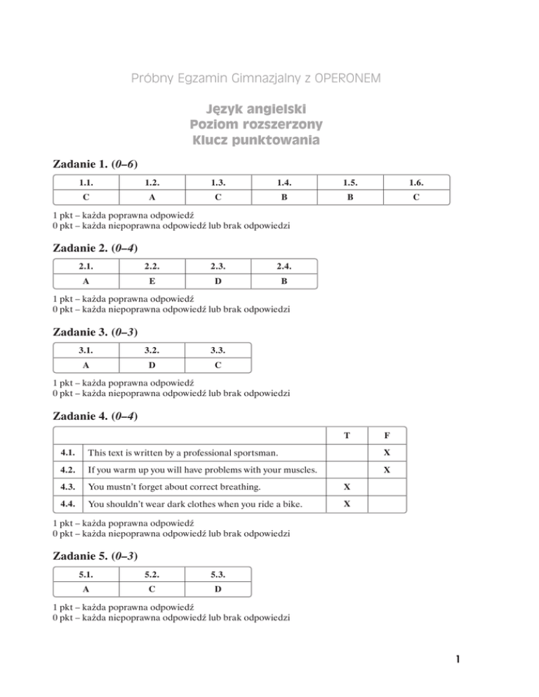 Próbny Egzamin Gimnazjalny z OPERONEM Język angielski Poziom rozszerzony Klucz punktowania Zadanie 1. (0–6) 1.1. 1.2. 1.3. 1.4. 1.5. 1.6. C A C B B C 1 pkt – każda poprawna odpowiedź 0 pkt – każda niepoprawna odpowiedź lub brak odpowiedzi Zadanie 2. (0–4) 2.1. 2.2. 2.3. 2.4. A E D B 1 pkt – każda poprawna odpowiedź 0 pkt – każda niepoprawna odpowiedź lub brak odpowiedzi Zadanie 3. (0–3) 3.1. 3.2. 3.3. A D C 1 pkt – każda poprawna odpowiedź 0 pkt – każda niepoprawna odpowiedź lub brak odpowiedzi Zadanie 4. (0–4) T F 4.1. This text is written by a professional sportsman. X 4.2. If you warm up you will have problems with your muscles. X 4.3. You mustn’t forget about correct breathing. X 4.4. You shouldn’t wear dark clothes when you ride a bike. X 1 pkt – każda poprawna odpowiedź 0 pkt – każda niepoprawna odpowiedź lub brak odpowiedzi Zadanie 5. (0–3) 5.1. 5.2. 5.3. A C D 1 pkt – każda poprawna odpowiedź 0 pkt – każda niepoprawna odpowiedź lub brak odpowiedzi 1 Klucz punktowania. Język angielski. Poziom rozszerzony Próbny Egzamin Gimnazjalny z OPERONEM i „Gazetą Wyborczą” Zadanie 6. (0–5) 6.1. 6.2. 6.3. 6.4. 6.5. was children sold/were selling his well 1 pkt – każda poprawna odpowiedź 0 pkt – każda niepoprawna odpowiedź lub brak odpowiedzi Zadanie 7. (0–4) 7.1. Tom was travelling 7.2. of your wife’s hair 7.3. enjoys playing volleyball 7.4. doesn’t start studying 7.5. has already bought 1 pkt – każda poprawna odpowiedź 0 pkt – każda niepoprawna odpowiedź lub brak odpowiedzi Zadanie 8. (0–10) Sprawdza egzaminator zgodnie z kryteriami oceniania podanymi w Informatorze o egzaminie gimnazjalnym od roku szkolnego 2011/2012, s. 102–104. Właśnie się dowiedziałeś/dowiedziałaś, że wygrałeś/wygrałaś pewną rzecz w konkursie internetowym. W e-mailu do kolegi: – poinformuj, co wygrałeś/wygrałaś i wyraź zadowolenie z otrzymanej nagrody, – napisz, co musiałeś/musiałaś zrobić żeby wygrać, – opisz następny konkurs, w którym masz zamiar wziąć udział. Przykładowa wypowiedź Hi Mark! You’ll never believe what has just happened! I won the online photo competition. And the main prize is... a digital photo camera! They’re going to send it to me tomorrow. And it was very easy to win. I just had to publish some of my old photos – the topic was “Travelling”. So, I sent them and they chose one. There’ll be another competition soon, this time the topic is “Friends”. Will you be my model? See you, Stacy 2 Klucz punktowania. Język angielski. Poziom rozszerzony Próbny Egzamin Gimnazjalny z OPERONEM i „Gazetą Wyborczą” Poziom Kryteria oceniania wypowiedzi pisemnej Liczba punktów I. TREŚĆ (0–4) W ocenie treści bierze się najpierw pod uwagę, do ilu elementów z polecenia uczeń się odniósł w swojej wypowiedzi, a następnie – ile z tych elementów rozwinął w zadowalającym stopniu. Poziom 4 Uczeń odniósł się do trzech elementów z polecenia i rozwinął każdy z nich. 4 pkt Poziom 3 Uczeń odniósł się do trzech elementów z polecenia, ale tylko dwa z nich rozwinął. 3 pkt Poziom 2 Uczeń odniósł się do trzech elementów z polecenia, ale tylko jeden z nich rozwinął, lub uczeń odniósł się do dwóch elementów z polecenia i oba rozwinął. 2 pkt Poziom 1 Uczeń odniósł się do trzech elementów z polecenia, ale żadnego z nich nie rozwinął, lub uczeń odniósł się do dwóch elementów z polecenia, ale tylko jeden z nich rozwinął, lub uczeń odniósł się do dwóch elementów z polecenia, ale żadnego z nich nie rozwinął, lub uczeń odniósł się tylko do jednego elementu z polecenia i go rozwinął. 1 pkt Poziom 0 Uczeń odniósł się tylko do jednego elementu z polecenia, ale go nie rozwinął, lub uczeń nie odniósł się do żadnego elementu z polecenia i żadnego nie rozwinął. 0 pkt II. SPÓJNOŚĆ I LOGIKA WYPOWIEDZI (0–2) W ocenie spójności bierze się pod uwagę, czy i w jakim stopniu tekst funkcjonuje jako całość dzięki jasnym powiązaniom (np. leksykalnym, gramatycznym) wewnątrz zdań oraz między zdaniami lub akapitami tekstu. W ocenie logiki wypowiedzi bierze się pod uwagę, czy i w jakim stopniu wypowiedź jest klarowna (np. czy nie jest jedynie zbiorem przypadkowych myśli). Poziom 2 Wypowiedź jest w całości lub w znacznej większości spójna (logiczna) zarówno na poziomie poszczególnych zdań, jak i całego tekstu. 2 pkt Poziom 1 Wypowiedź zawiera usterki w spójności (logice) na poziomie poszczególnych zdań oraz/lub całego tekstu. 1 pkt Poziom 0 Wypowiedź jest w znacznej mierze niespójna (nielogiczna); zbudowana jest z trudnych do powiązania w całość fragmentów. 0 pkt III. ZAKRES ŚRODKÓW JĘZYKOWYCH (0–2) W ocenie zakresu środków językowych bierze się pod uwagę zróżnicowanie struktur leksykalno-gramatycznych użytych w wypowiedzi. Poziom 2 Zadowalający zakres środków językowych; oprócz środków językowych o wysokim stopniu pospolitości w wypowiedzi występuje kilka precyzyjnych sformułowań.* 2 pkt 3 Klucz punktowania. Język angielski. Poziom rozszerzony Próbny Egzamin Gimnazjalny z OPERONEM i „Gazetą Wyborczą” Poziom Kryteria oceniania wypowiedzi pisemnej Liczba punktów Poziom 1 Ograniczony zakres środków językowych; w wypowiedzi użyte są głównie środki językowe o wysokim stopniu pospolitości. 1 pkt Poziom 0 Bardzo ograniczony zakres środków językowych, w znacznym stopniu uniemożliwia realizację polecenia. 0 pkt IV. POPRAWNOŚC ŚRODKÓW JĘZYKOWYCH (0–2) W ocenie poprawności środków językowych bierze się pod uwagę błędy gramatyczne, leksykalne i ortograficzne oraz ich wpływ na komunikatywność wypowiedzi. Poziom 2 W wypowiedzi brak błędów lub występują nieliczne błędy niezakłócające komunikacji, lub nieliczne błędy sporadycznie zakłócające komunikację. 2 pkt Poziom 1 W wypowiedzi występują liczne błędy, ale nie za