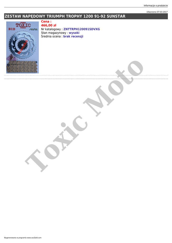 Informacje o produkcie Utworzono 07-03-2017 ZESTAW NAPĘDOWY TRIUMPH TROPHY 1200 91-92 SUNSTAR Cena : 466,00 zł To xi c M ot o Nr katalogowy : ZNTTRPH120091SDVXG Stan magazynowy : wysoki Średnia ocena : brak recenzji Wygenerowano w programie www.oscGold.com